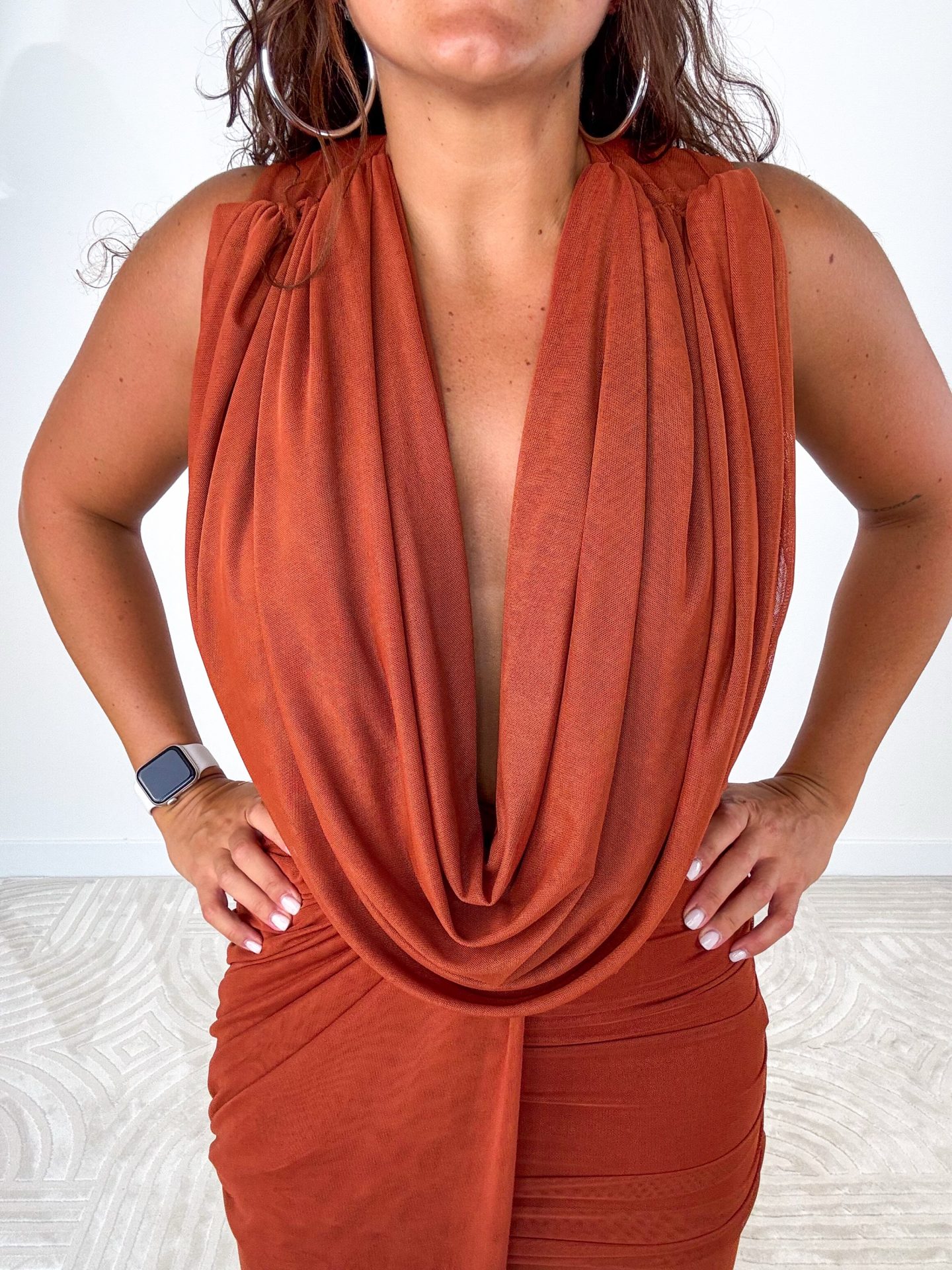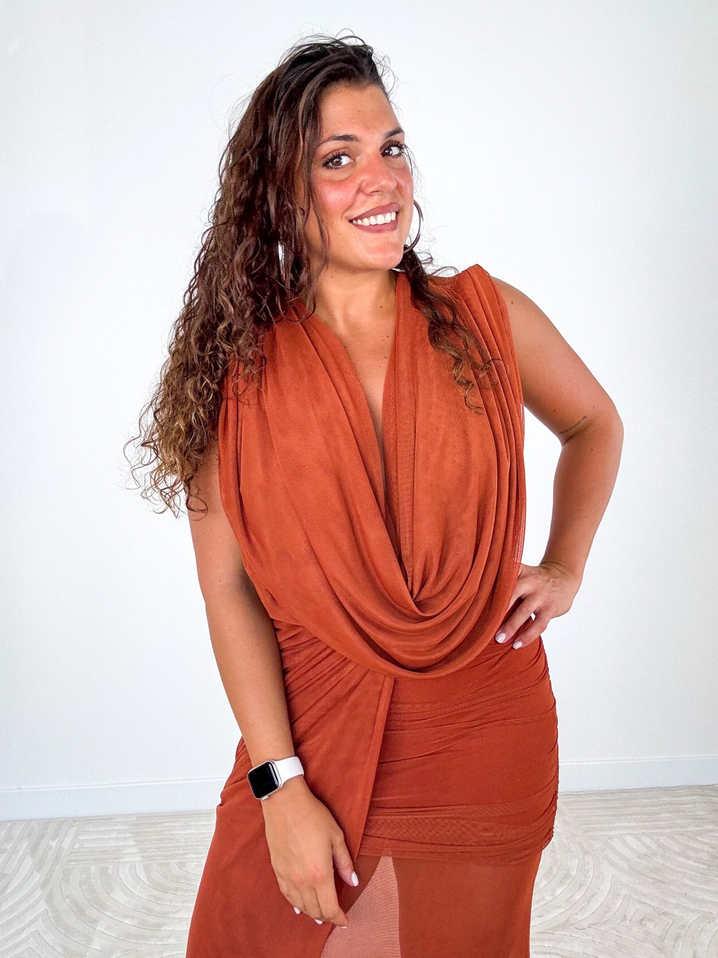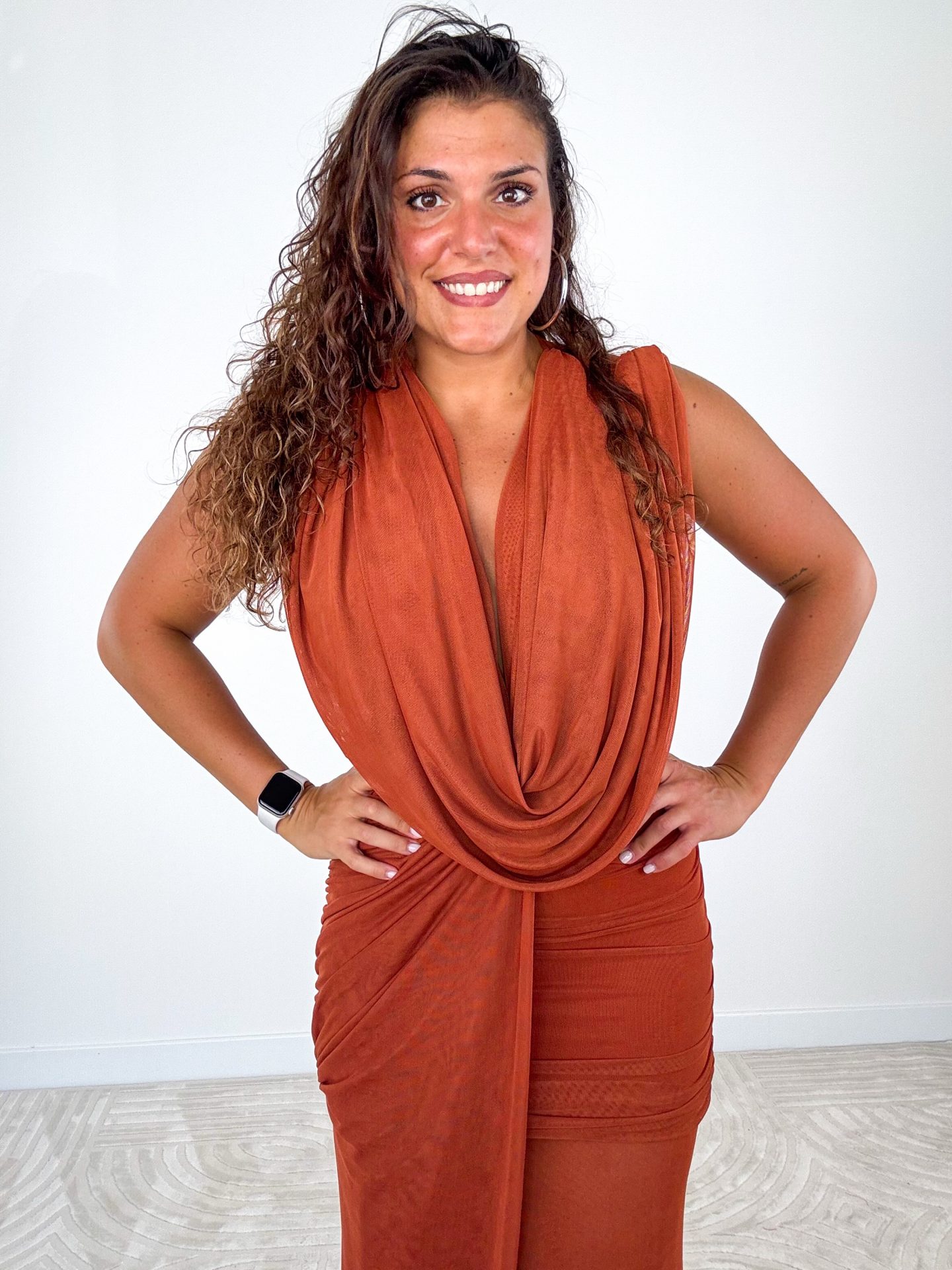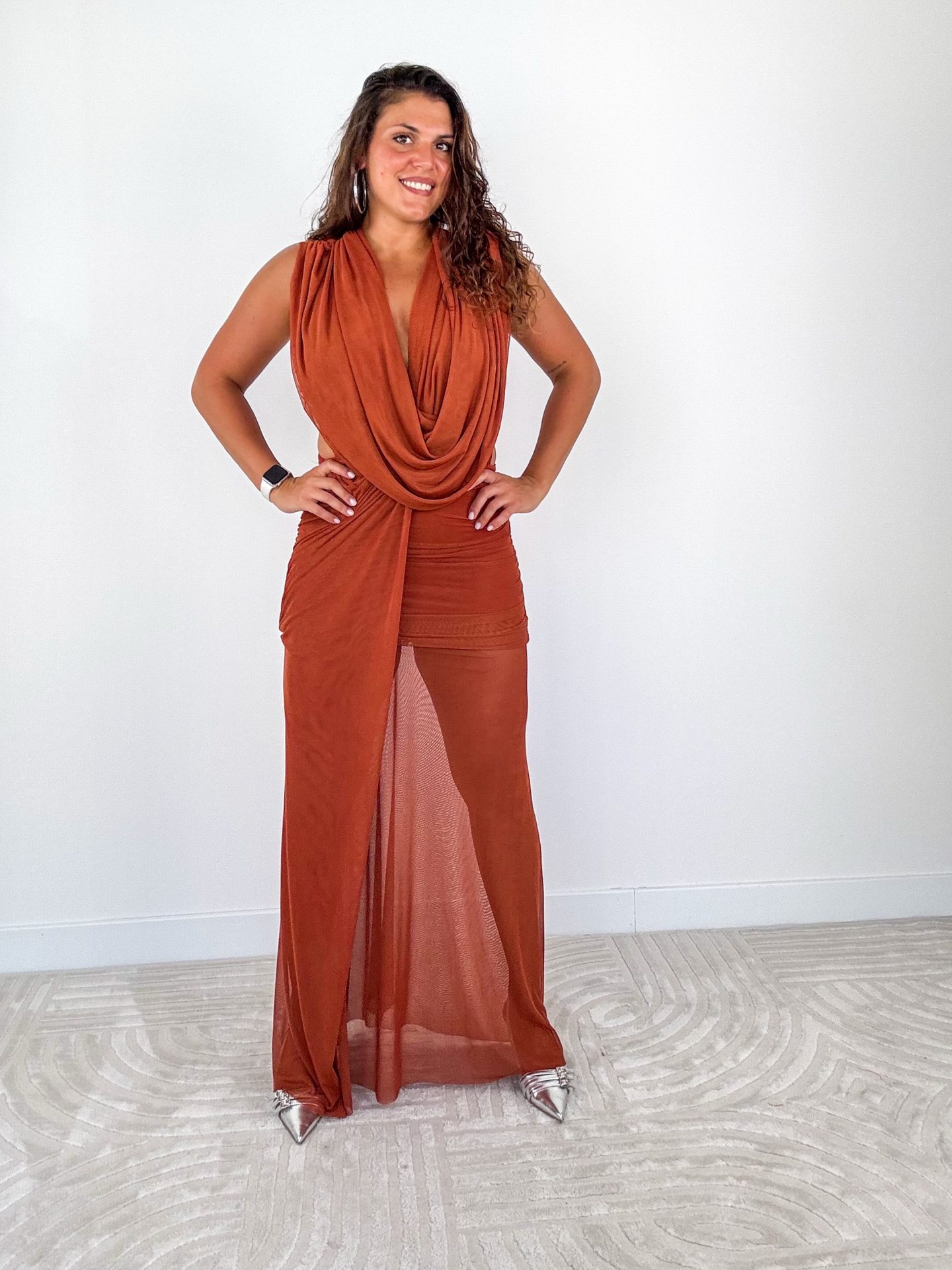 - Abito lungo drappeggiato con scollo profondo.