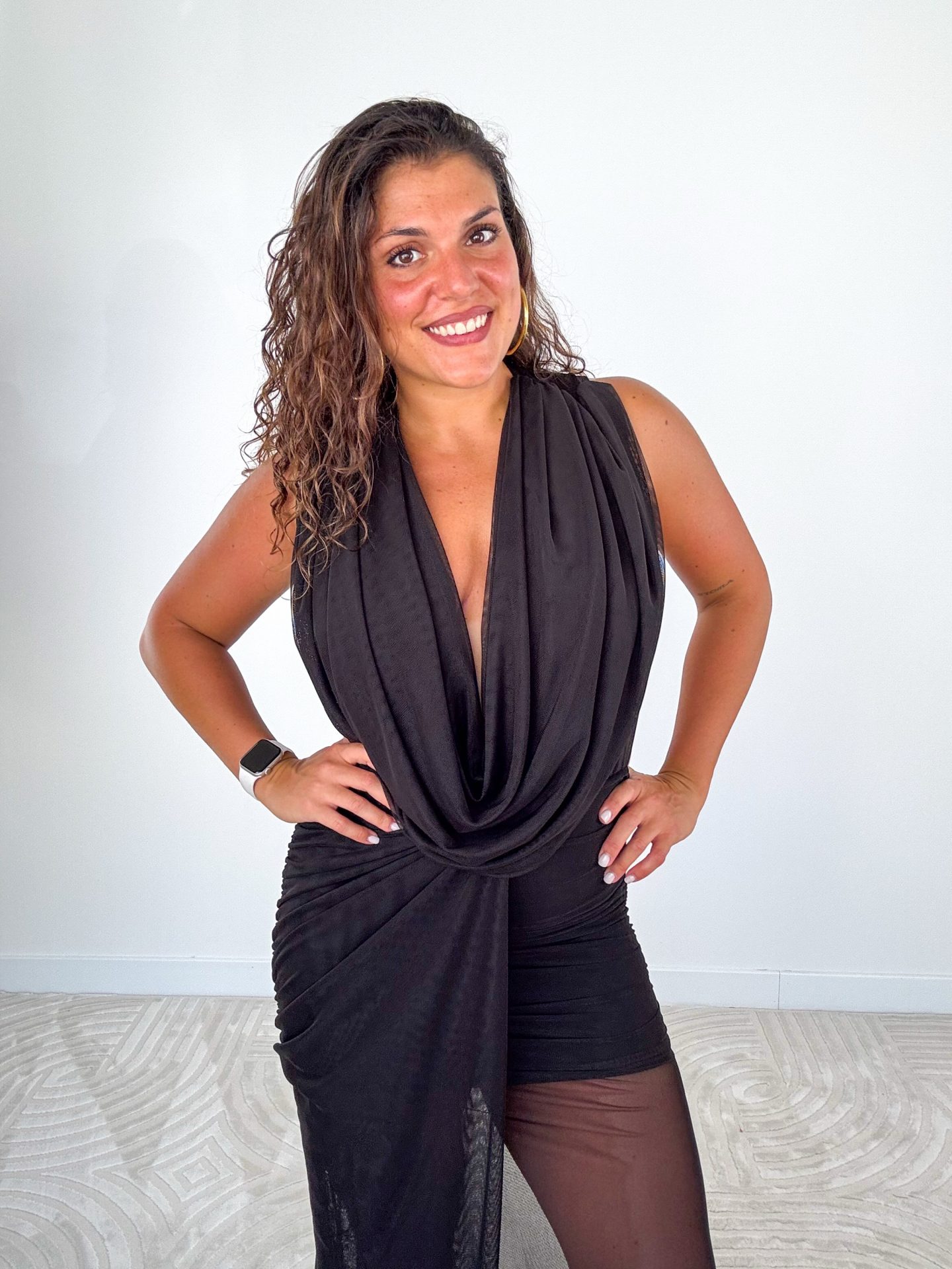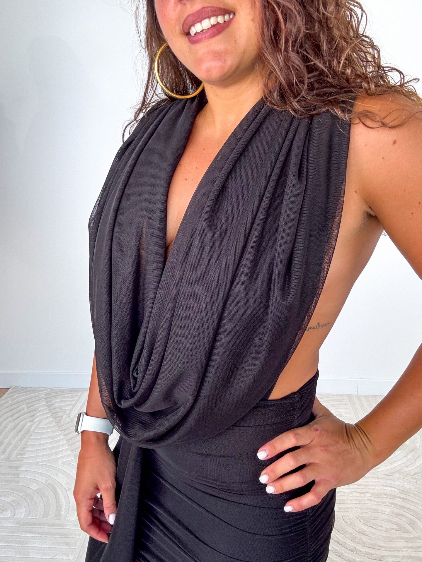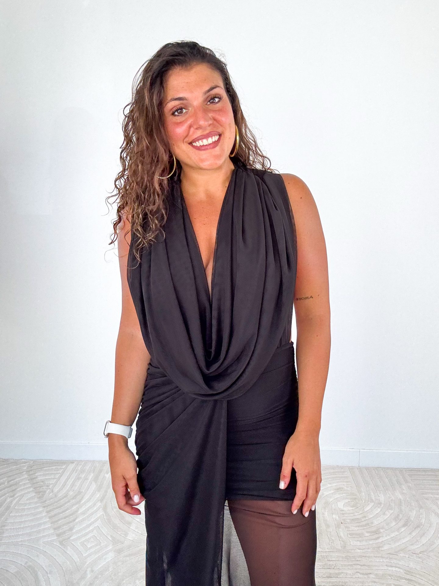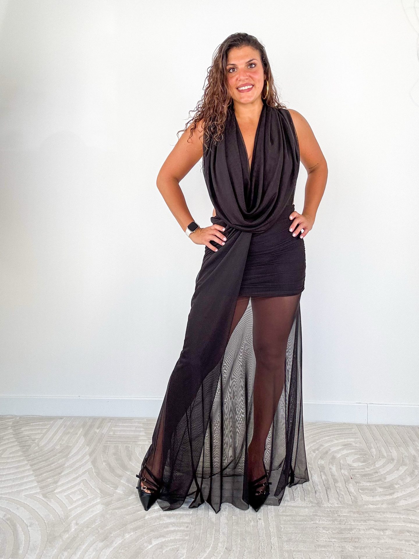 - Abito lungo drappeggiato con scollo profondo.