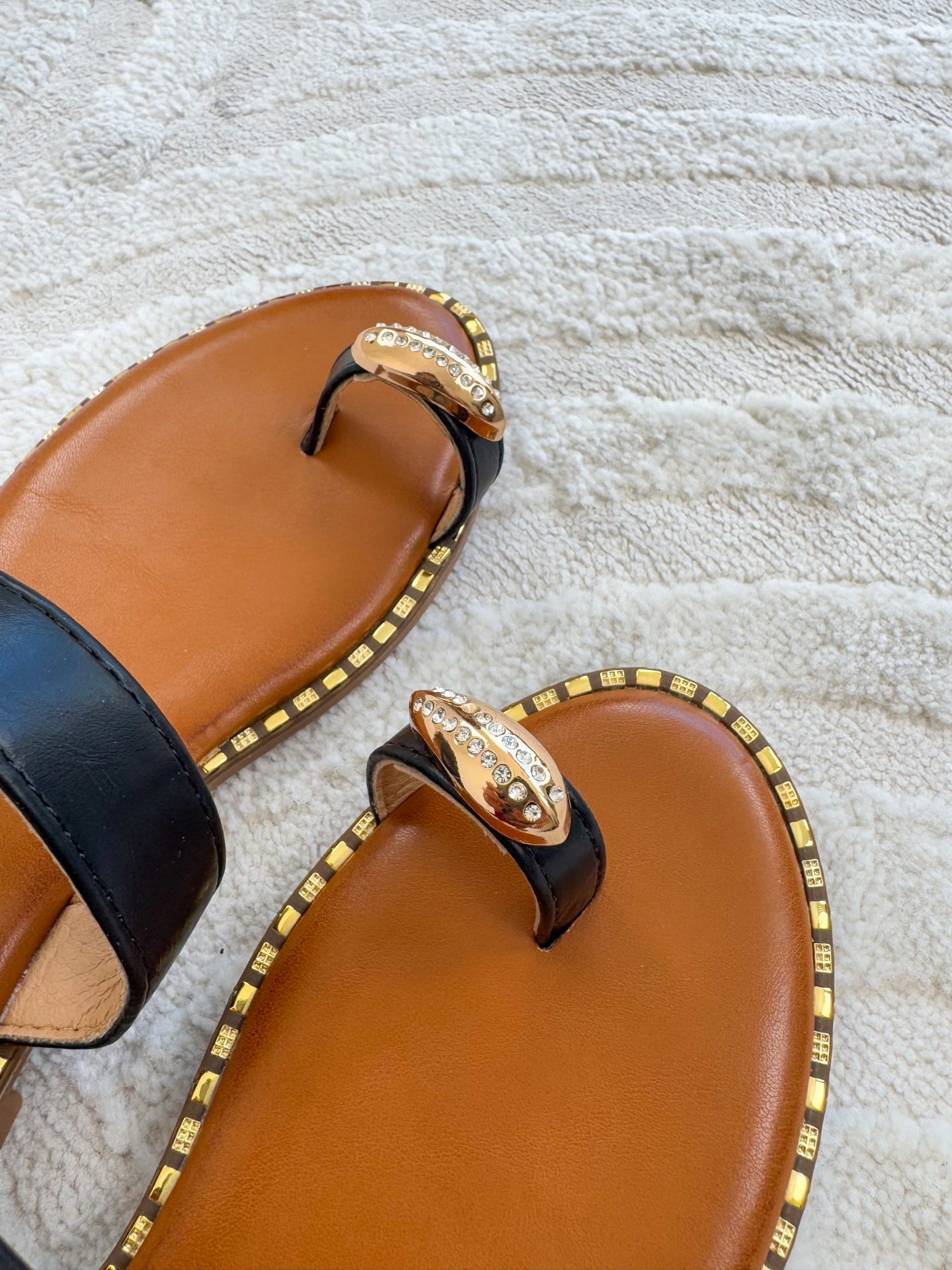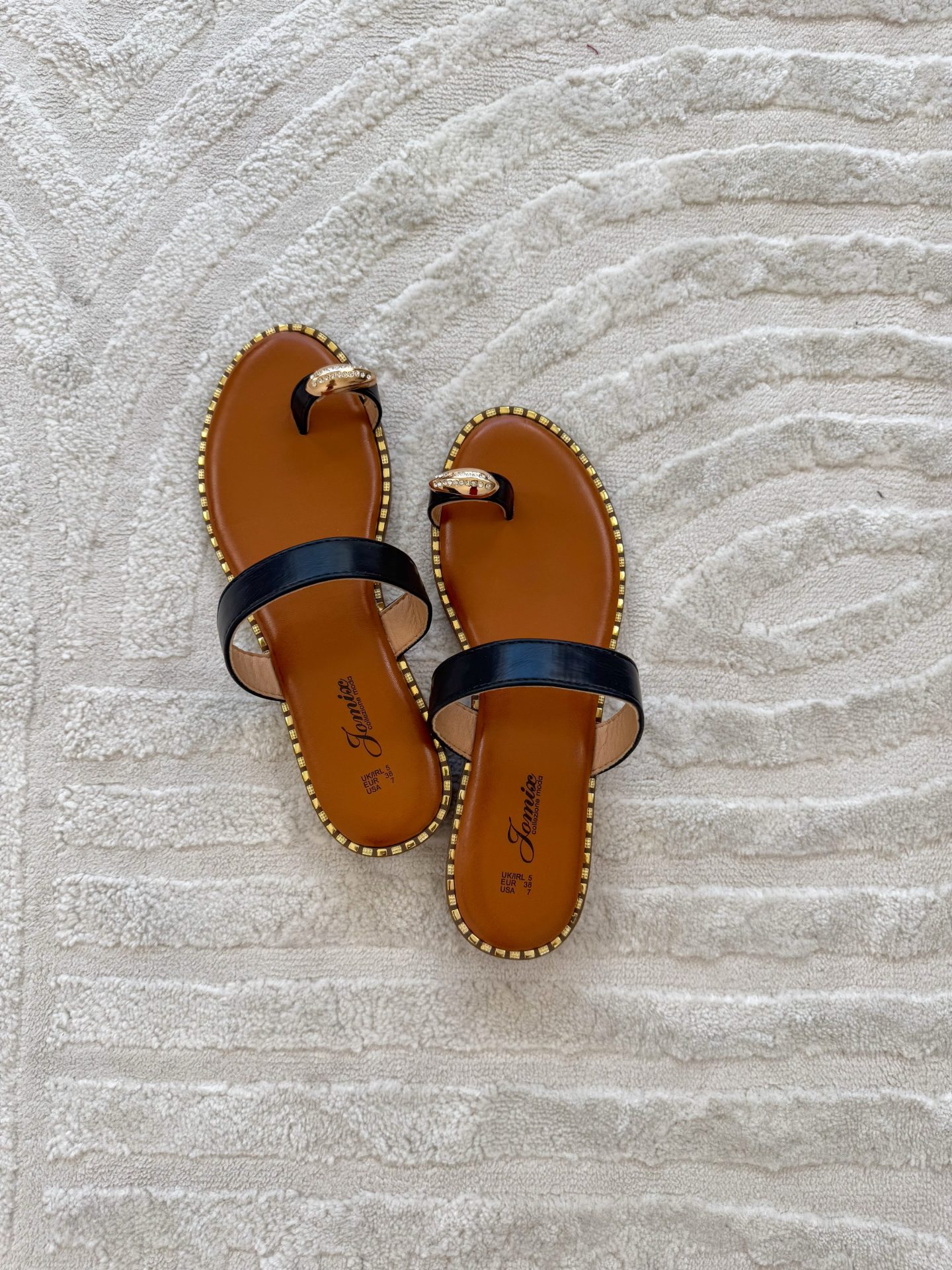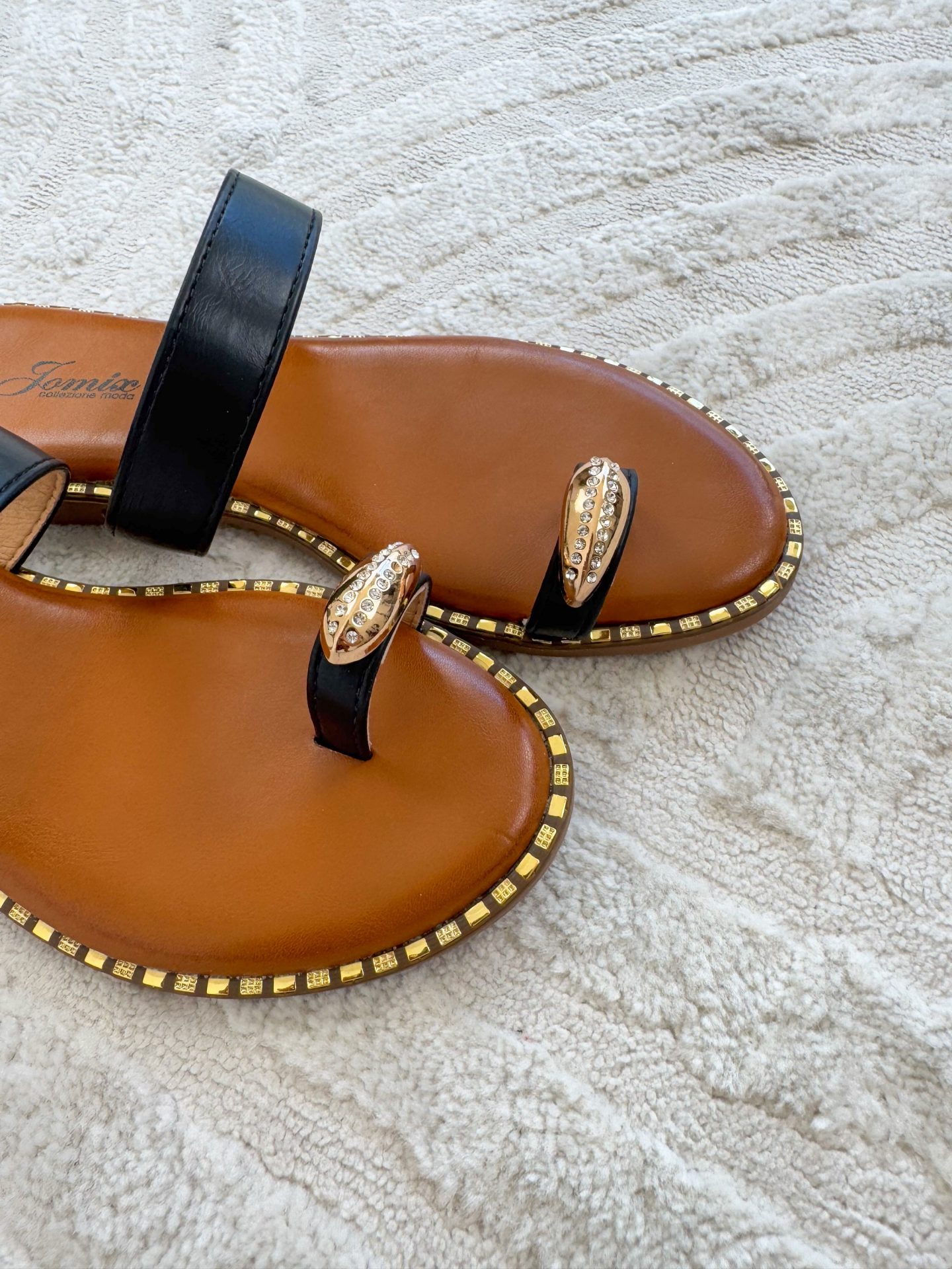 - Ciabatta con fondo in gomma e applicazioni effetto dorato sul bordo suola.