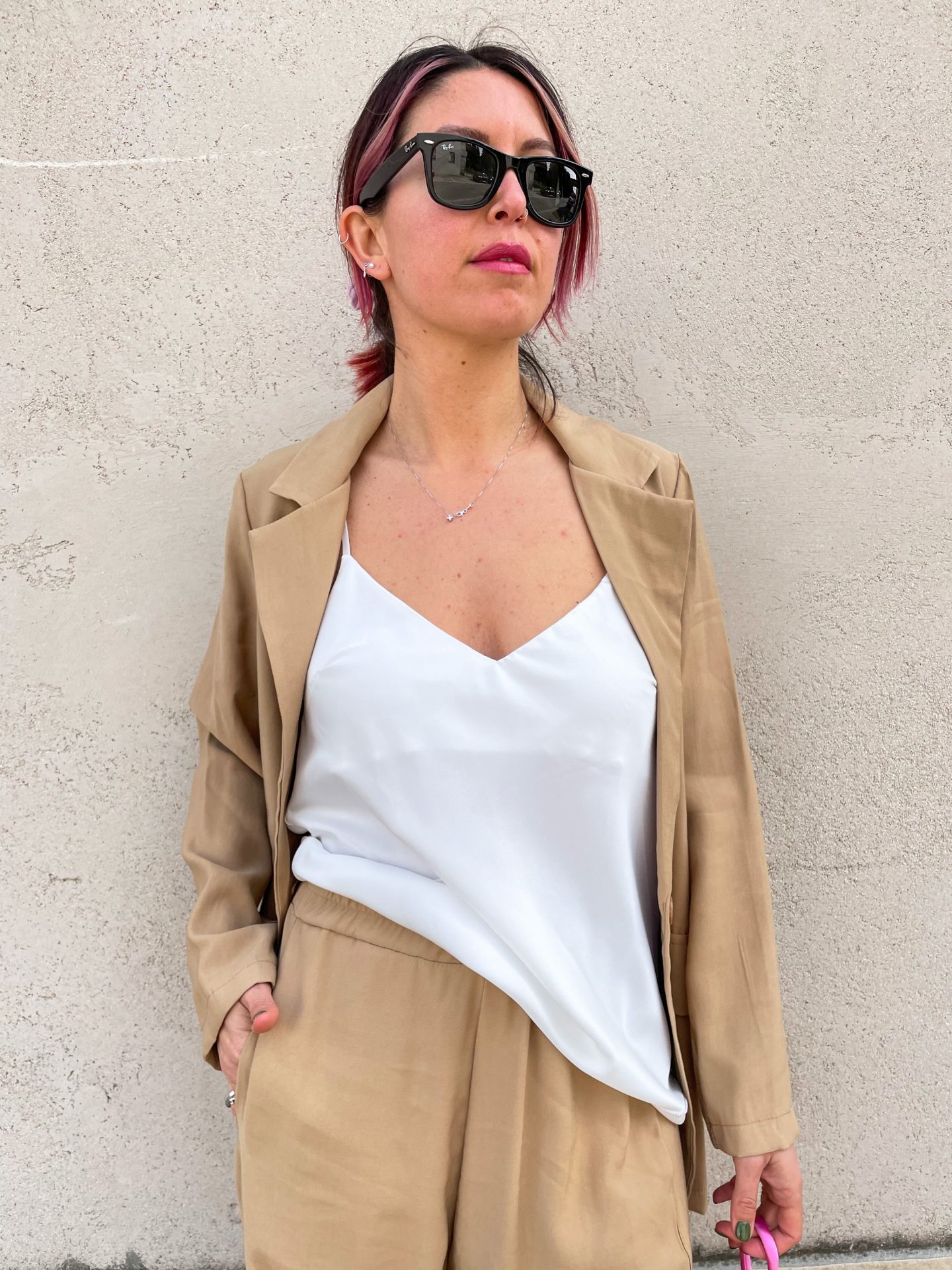 - Giacca modello uomo con bottone tono su tono e patte frontali.