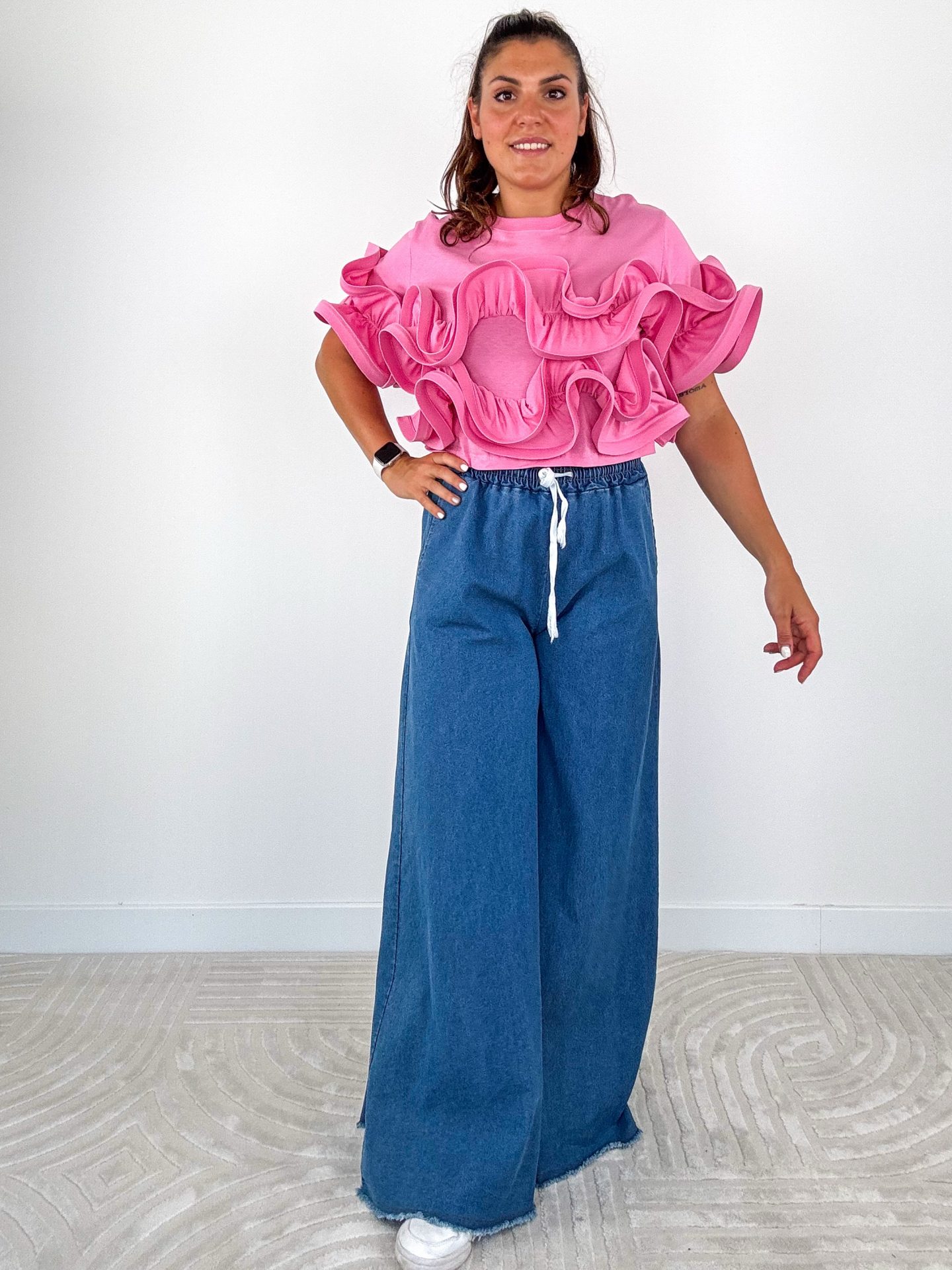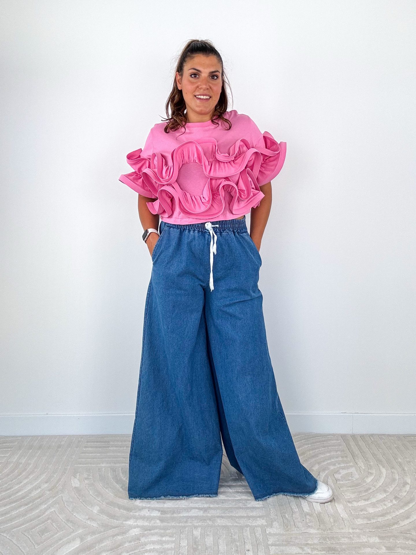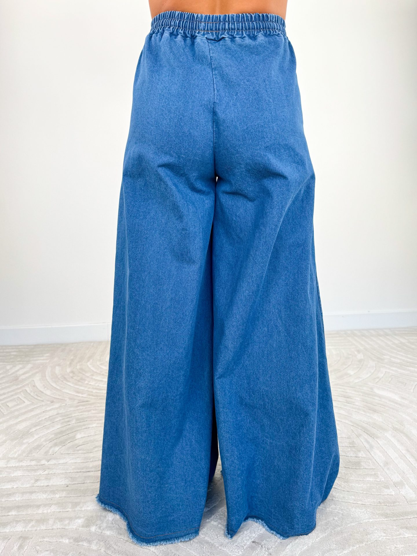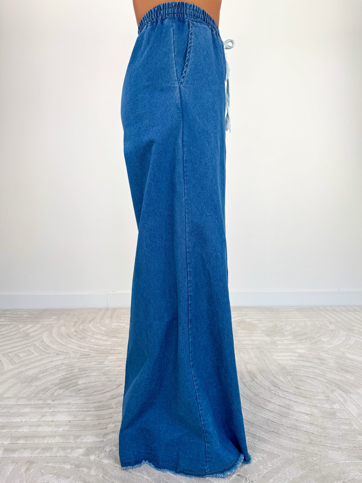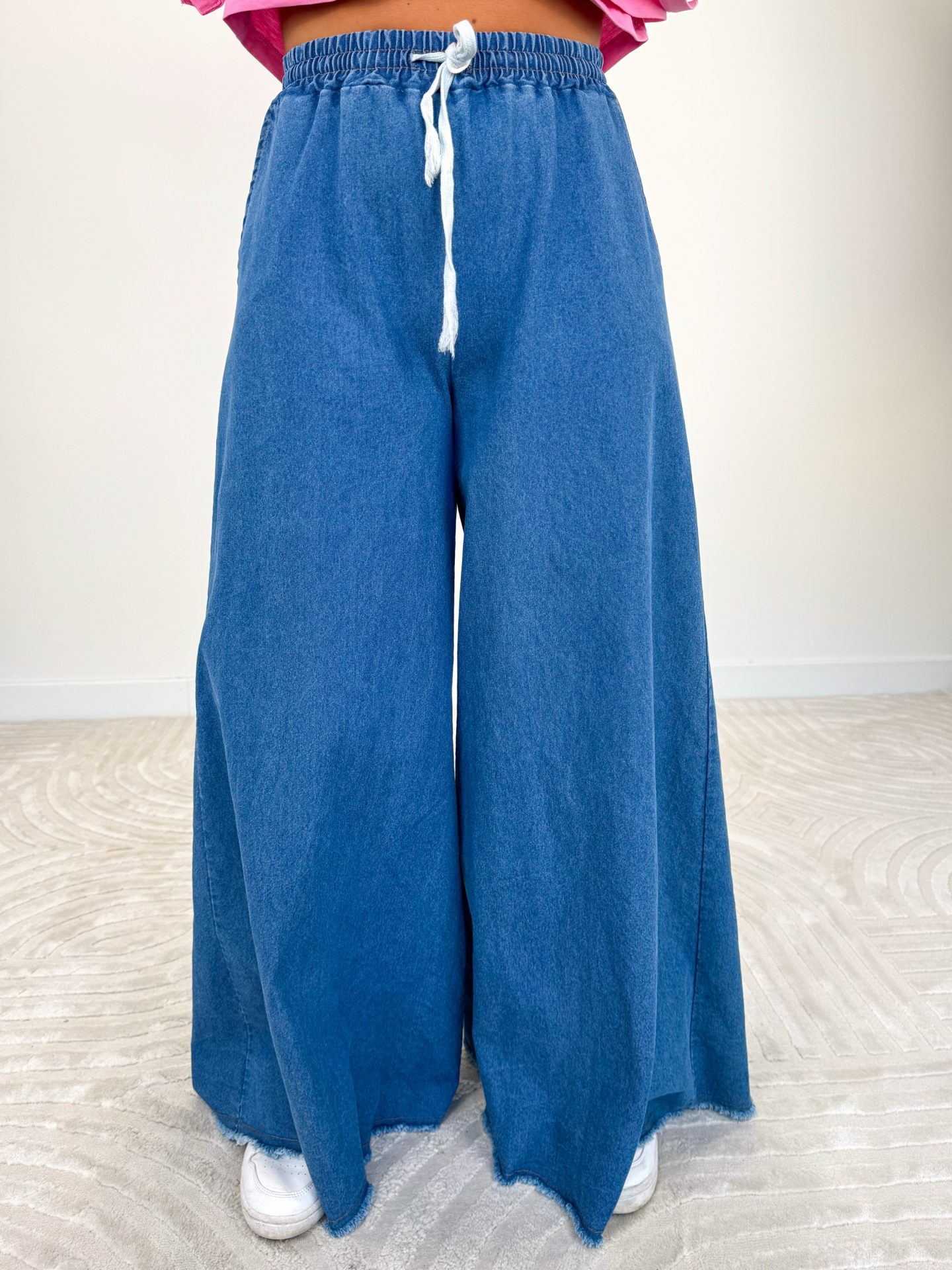 - Denim modello palazzo con elastico e coulisse in vita e tasche a soffietto.