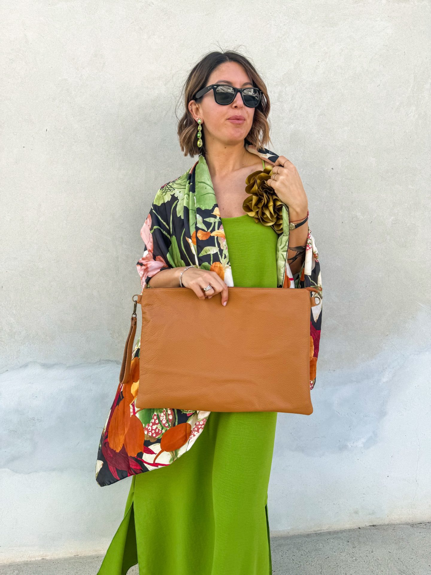 Abbina la gonna alla T-shirt in Cotone, un capo basic ma essenziale nel tuo guardaroba. Il suo taglio comodo e il materiale morbido garantiscono comfort. Per aggiungere un dettaglio sofisticato, scegli la Maxi Pochette in Vera Pelle, un accessorio che unisce praticità e lusso. La sua dimensione spaziosa ti permette di portare tutto l’essenziale con eleganza.