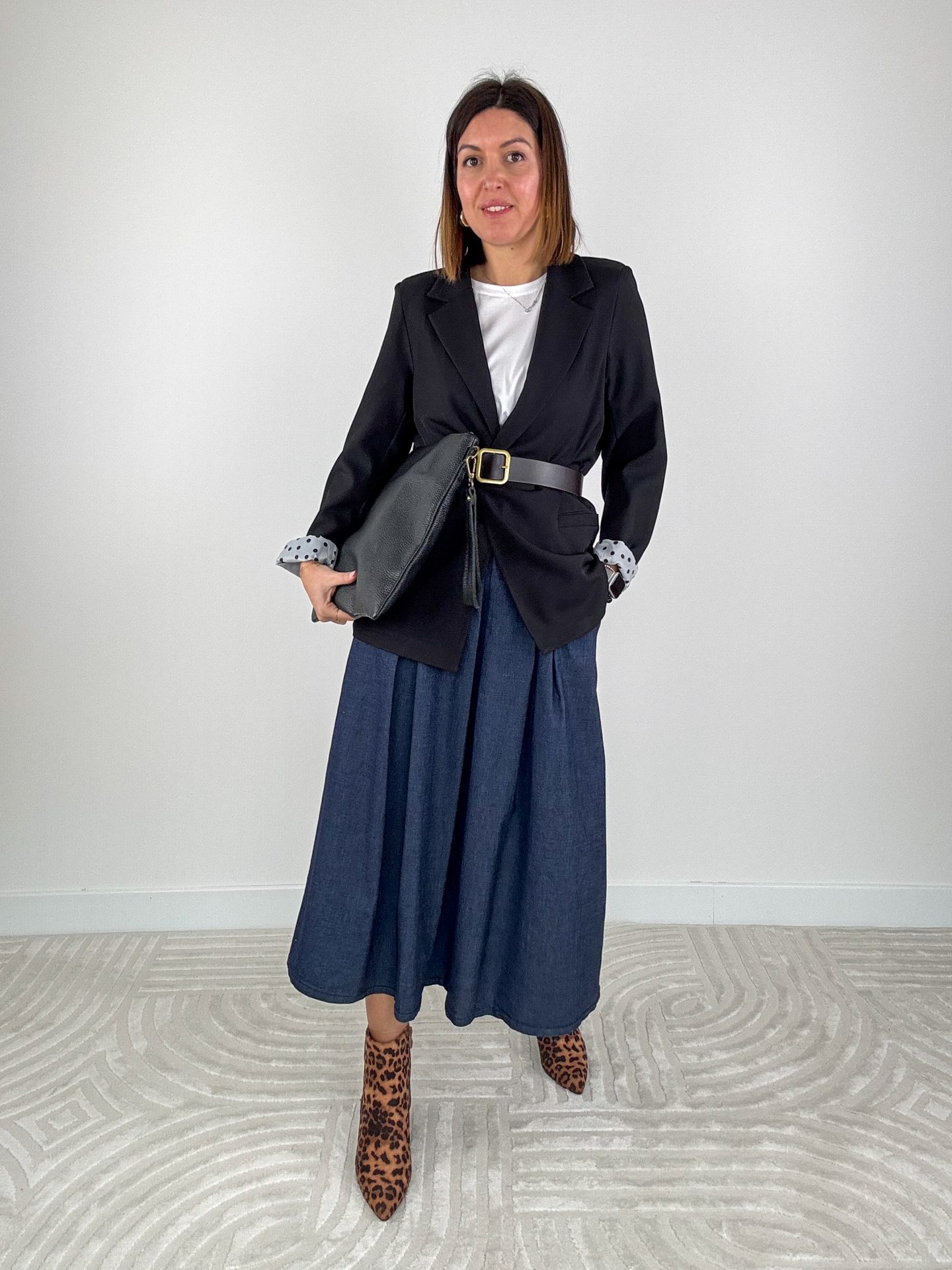 La Gonna Denim Ruota, un must-have che aggiunge movimento e freschezza al tuo outfit. Il suo design a ruota è perfetto per ogni occasione casual ma curata.