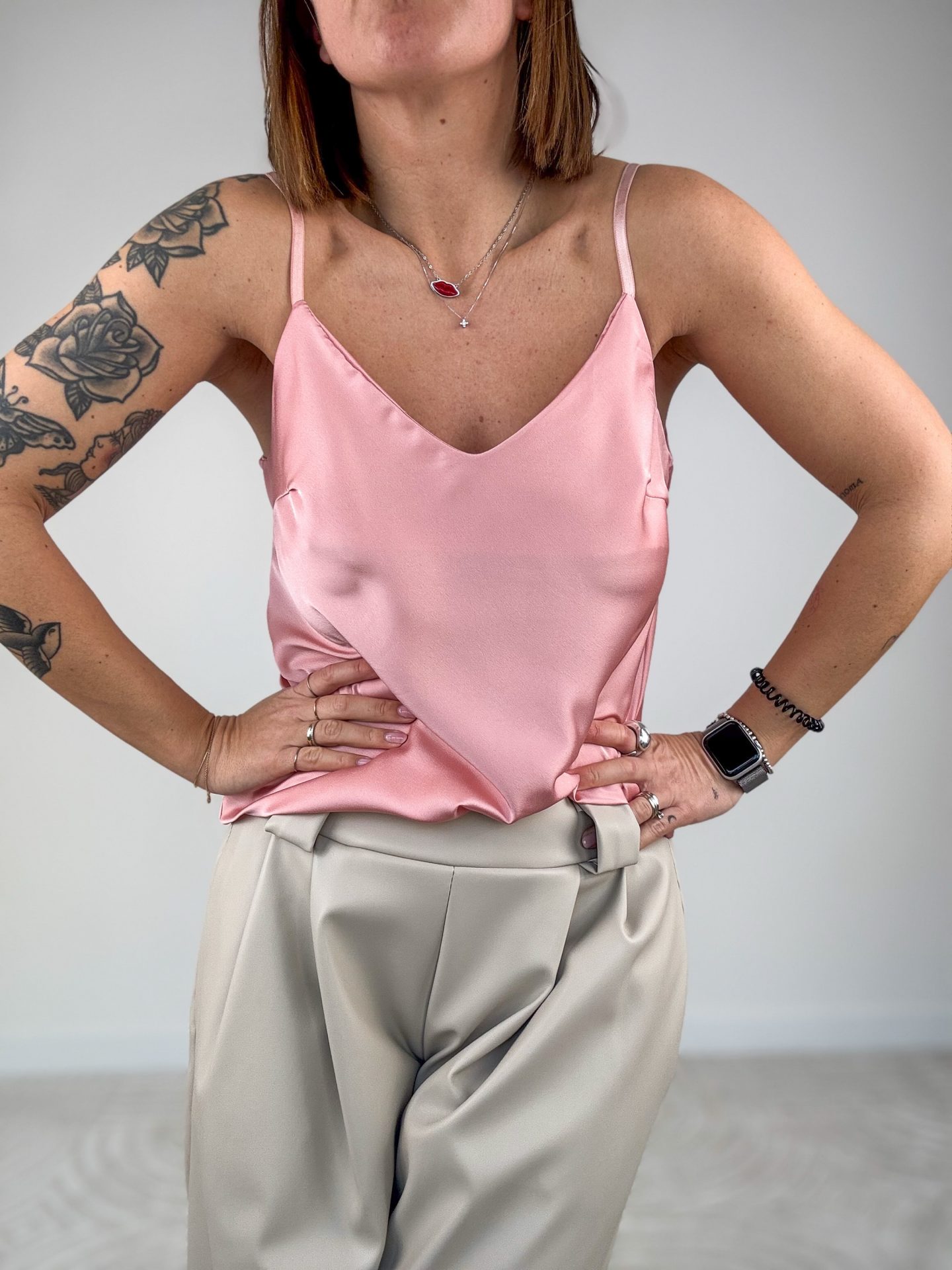 Il cardigan Neve da una sensazione di calore e di morbidezza addosso che indossato con il Top Masha in satin crea un contrasto davvero interessate. Rimanendo in tema morbidezza, il Panta Vasco non poteva che prendere parte a questo look super neutro.