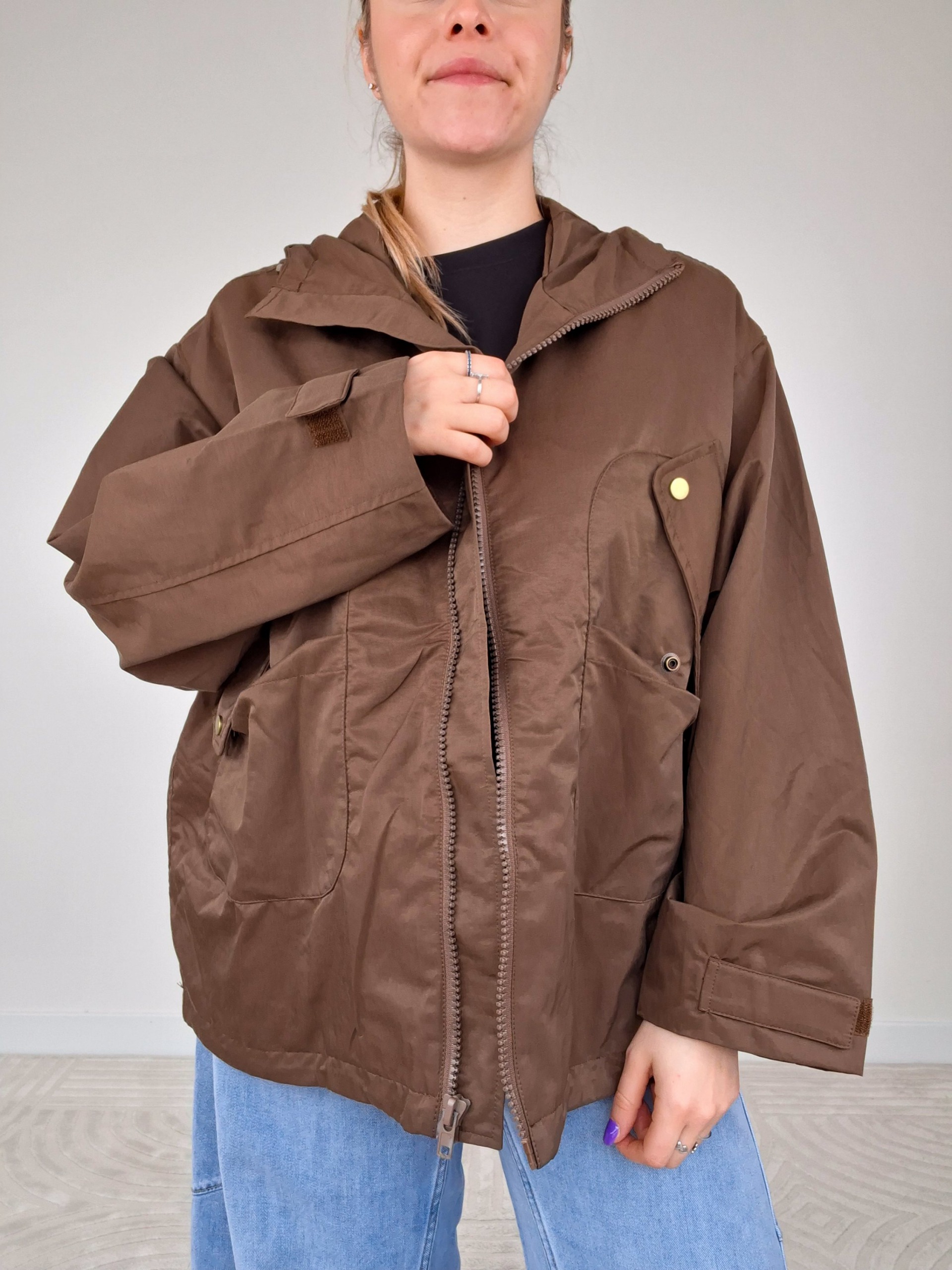 - Dettaglio cappuccio e chiusura a strappo sulle maniche.