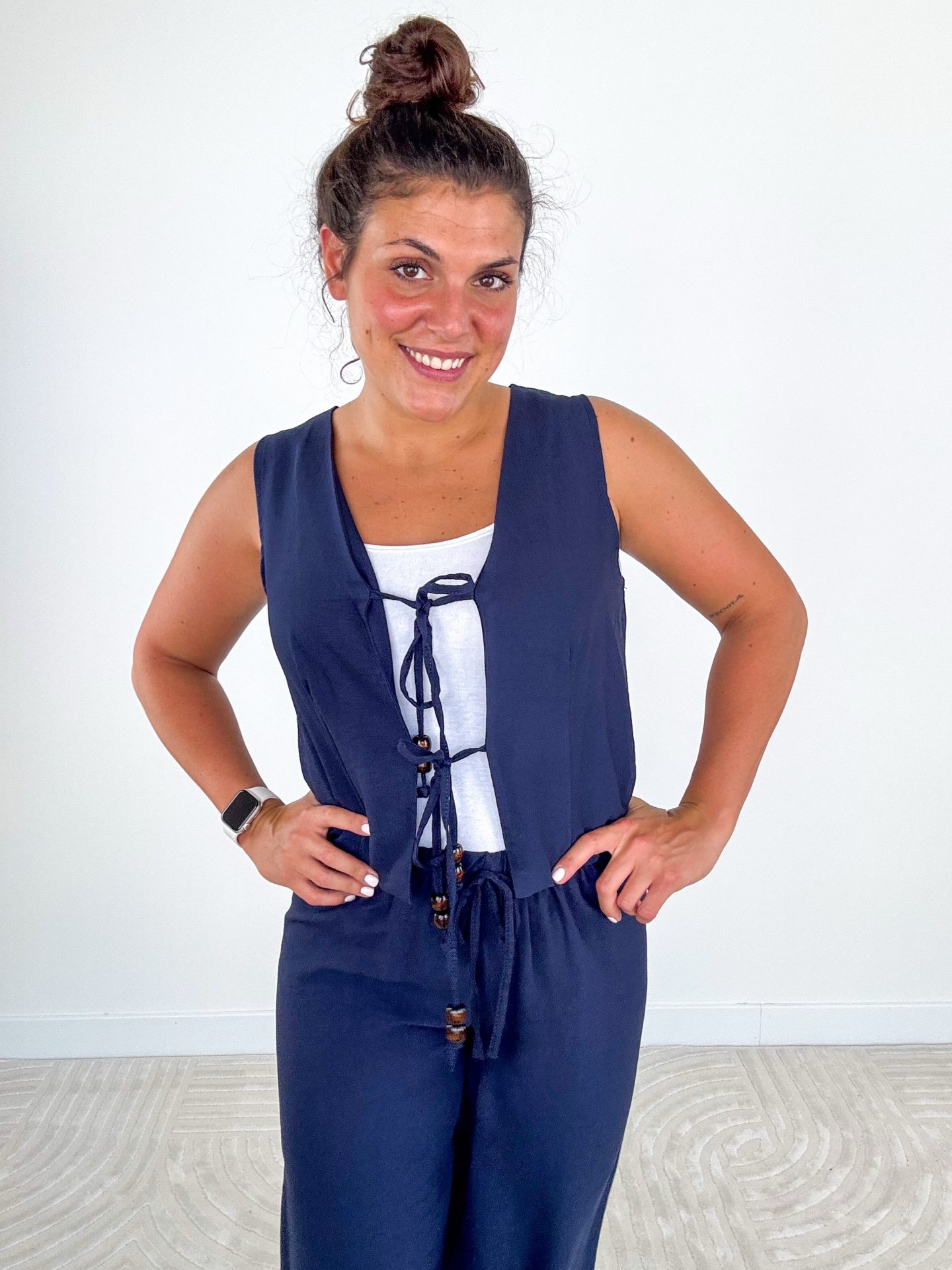 - Gilet in Viscosa con chiusura laccetti e dettaglio perle in legno.