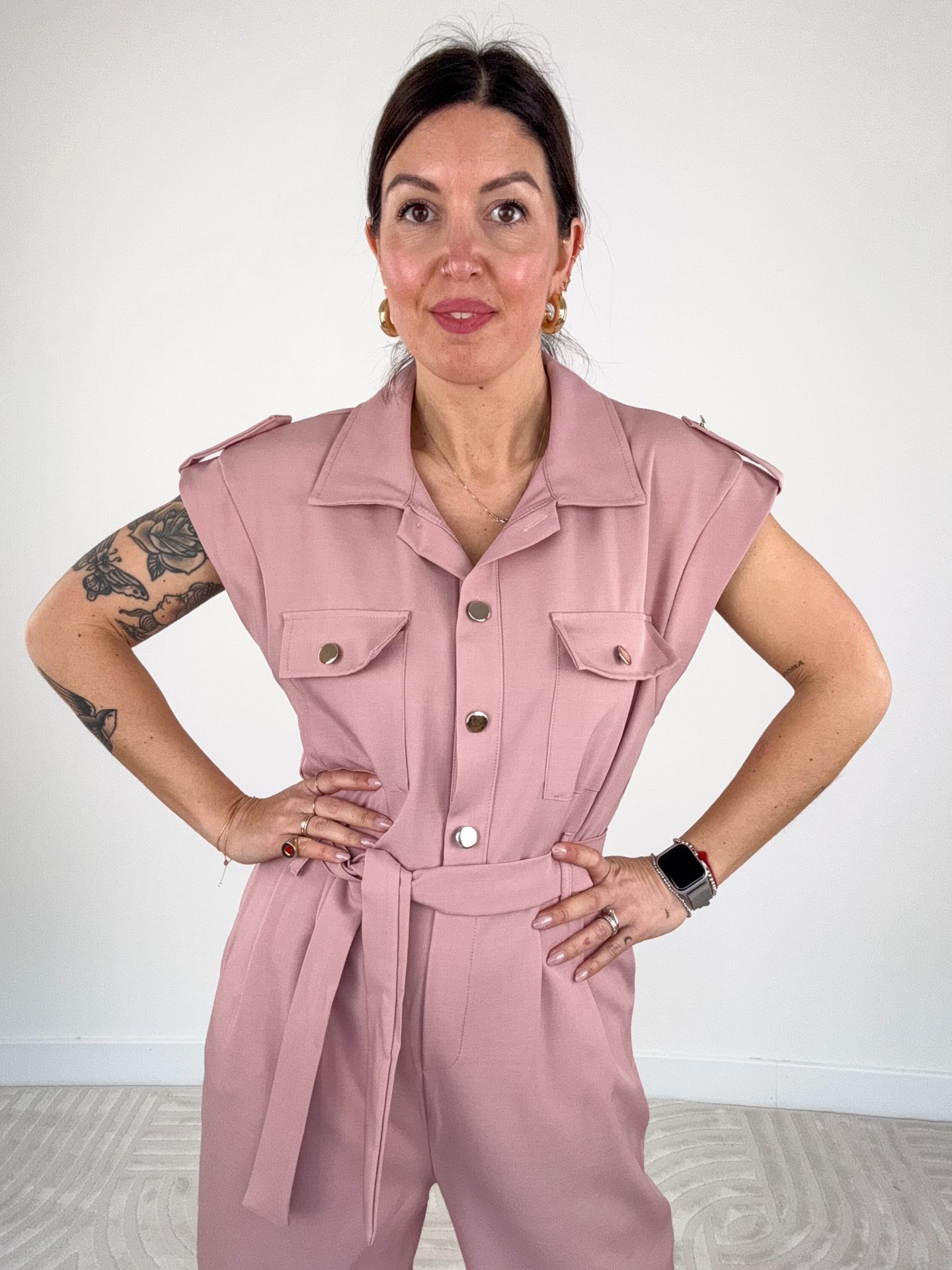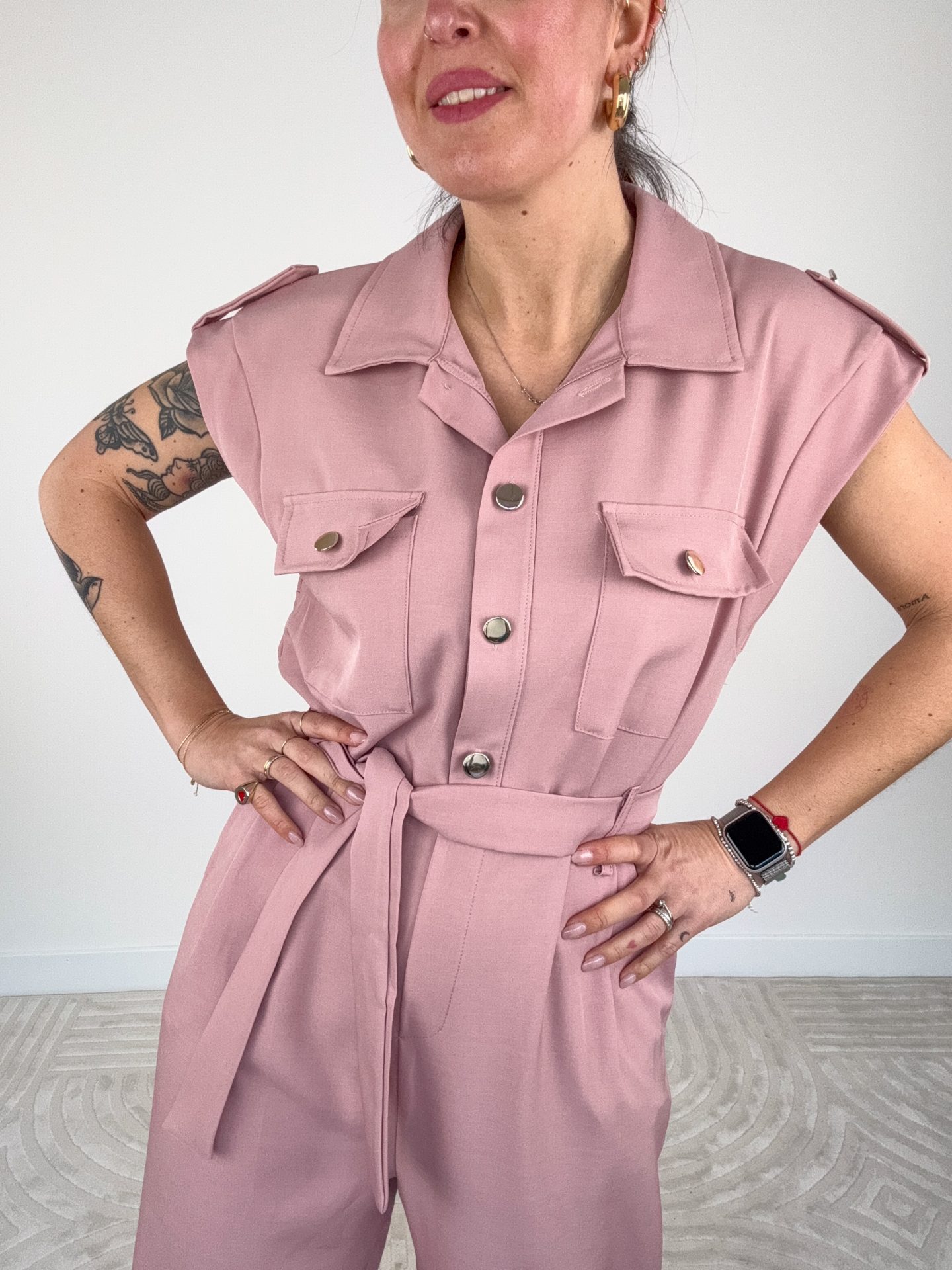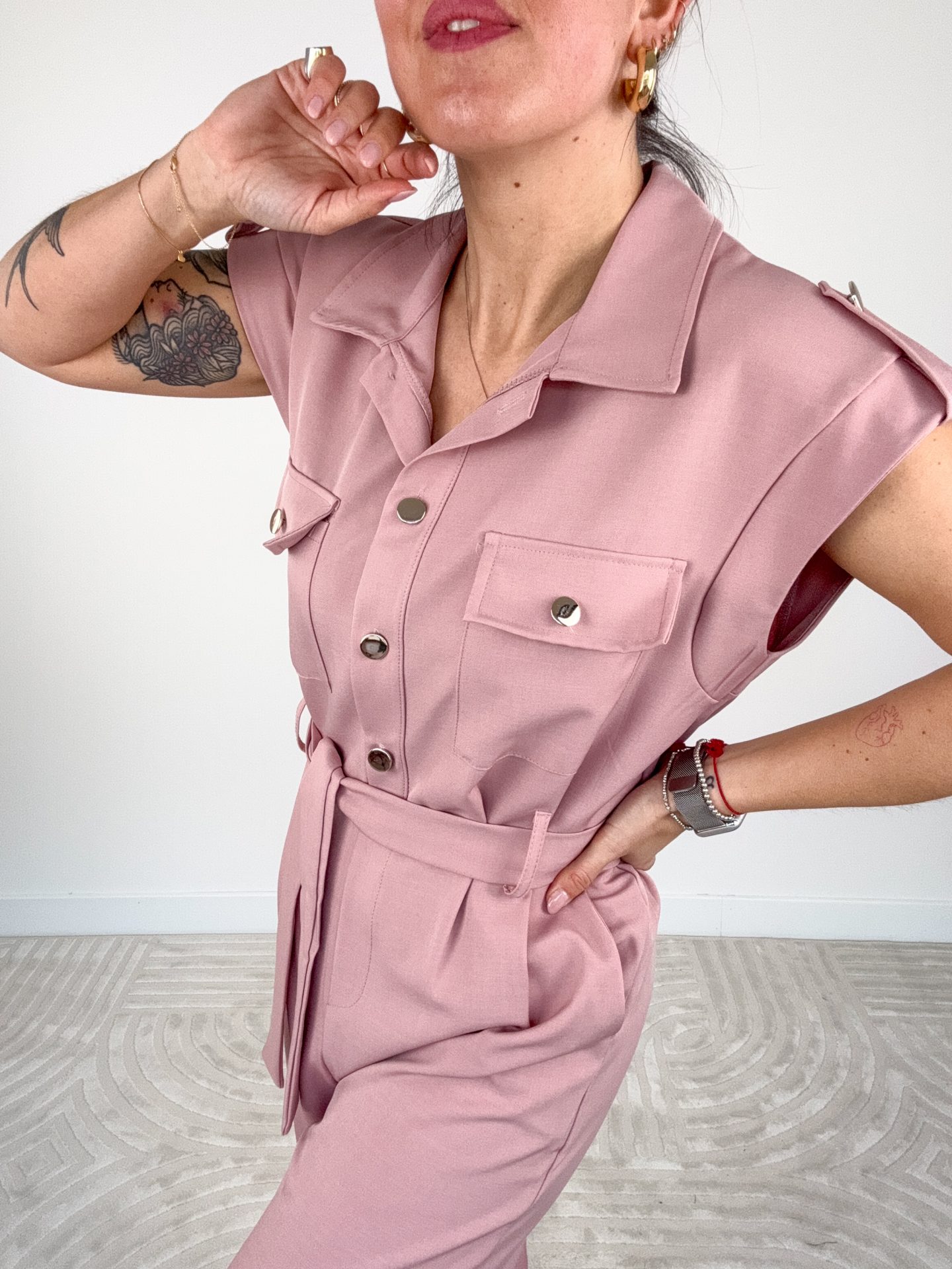 - Jumpsuit giromanica con bottoni color oro centrali.