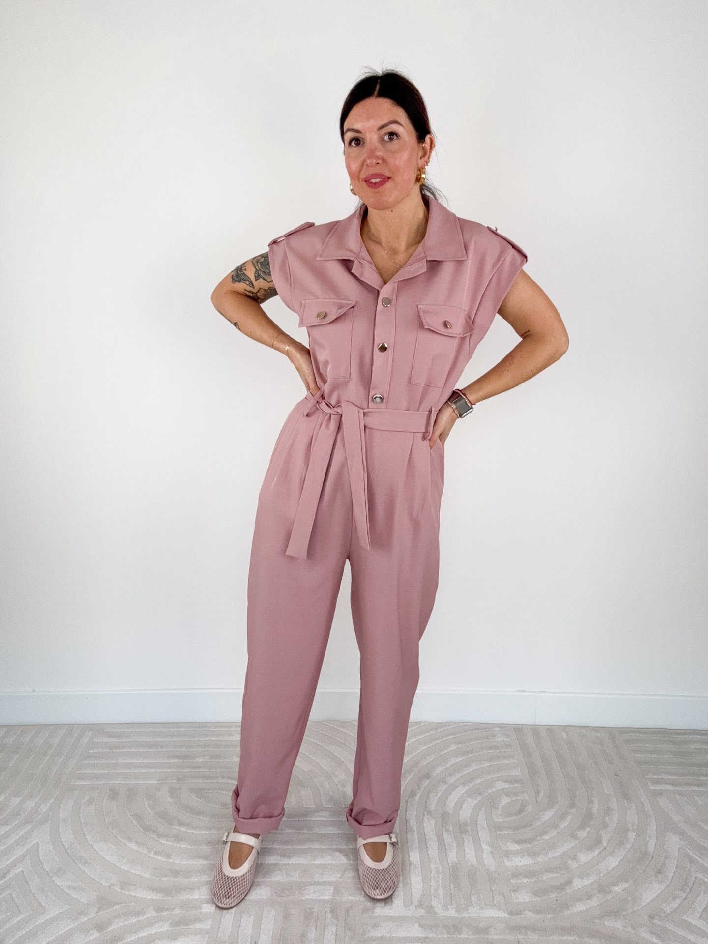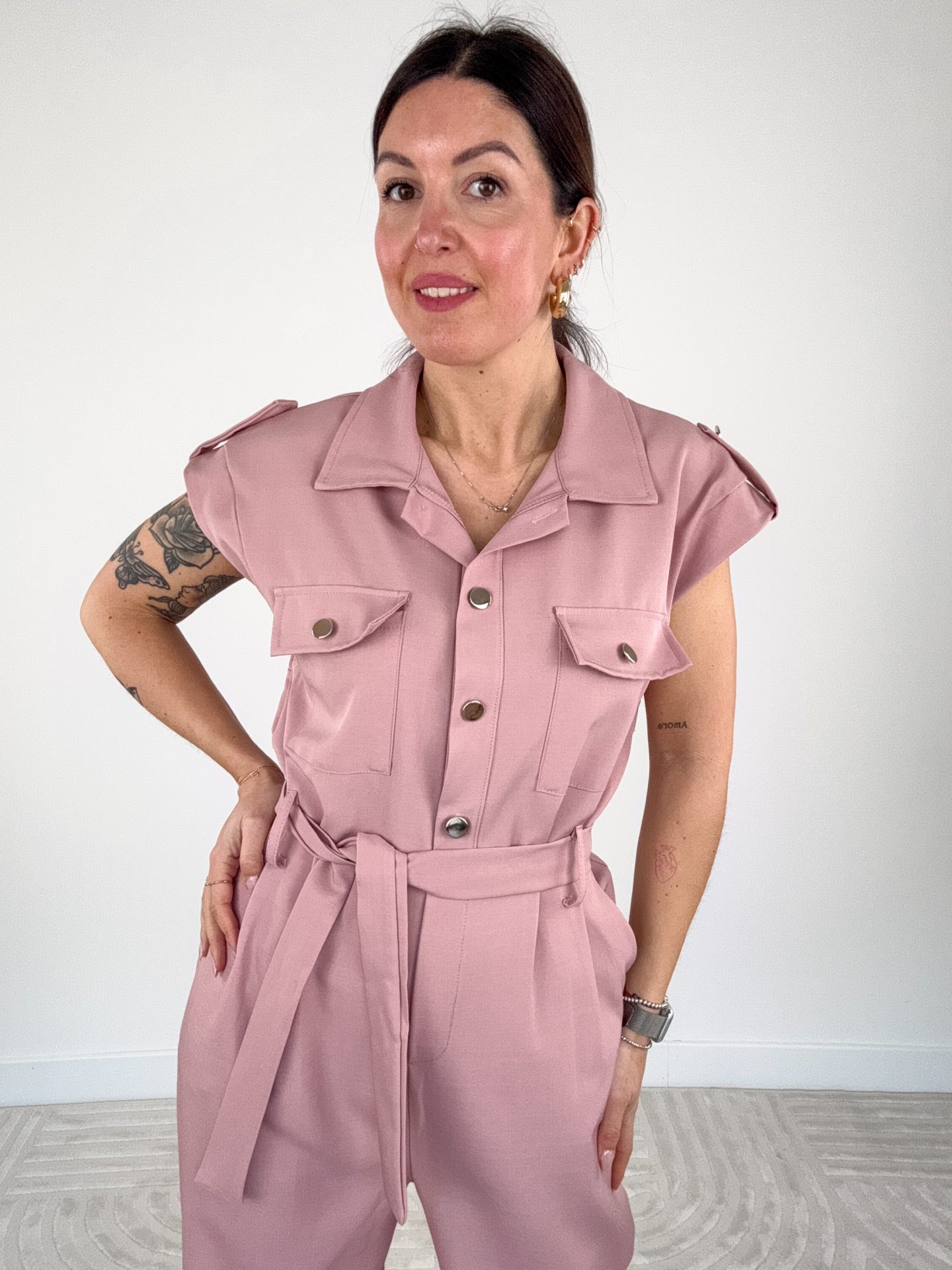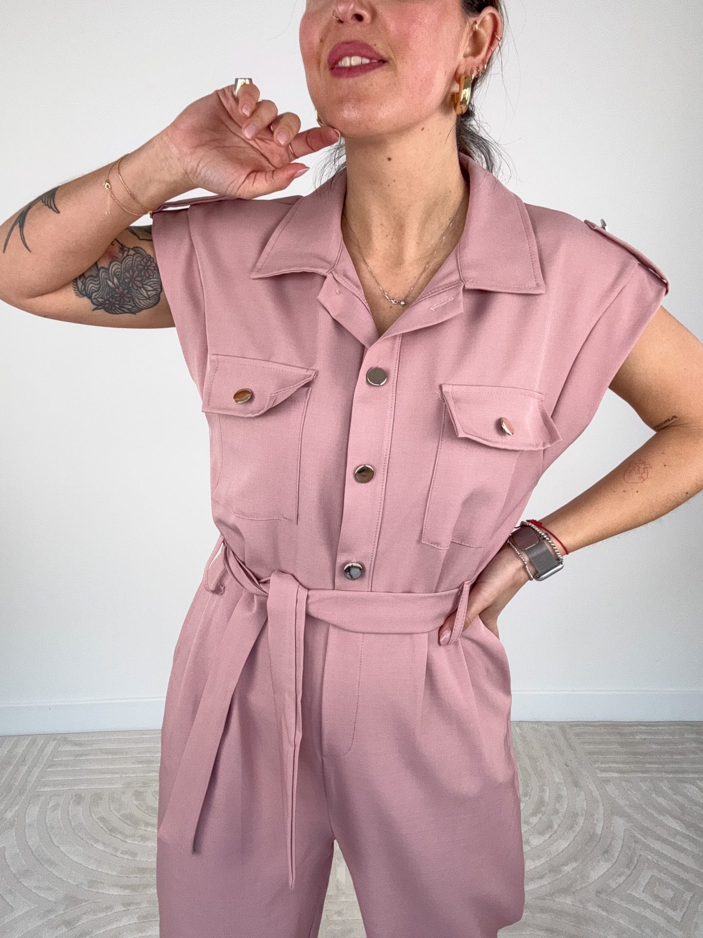 - Jumpsuit giromanica con bottoni color oro centrali.