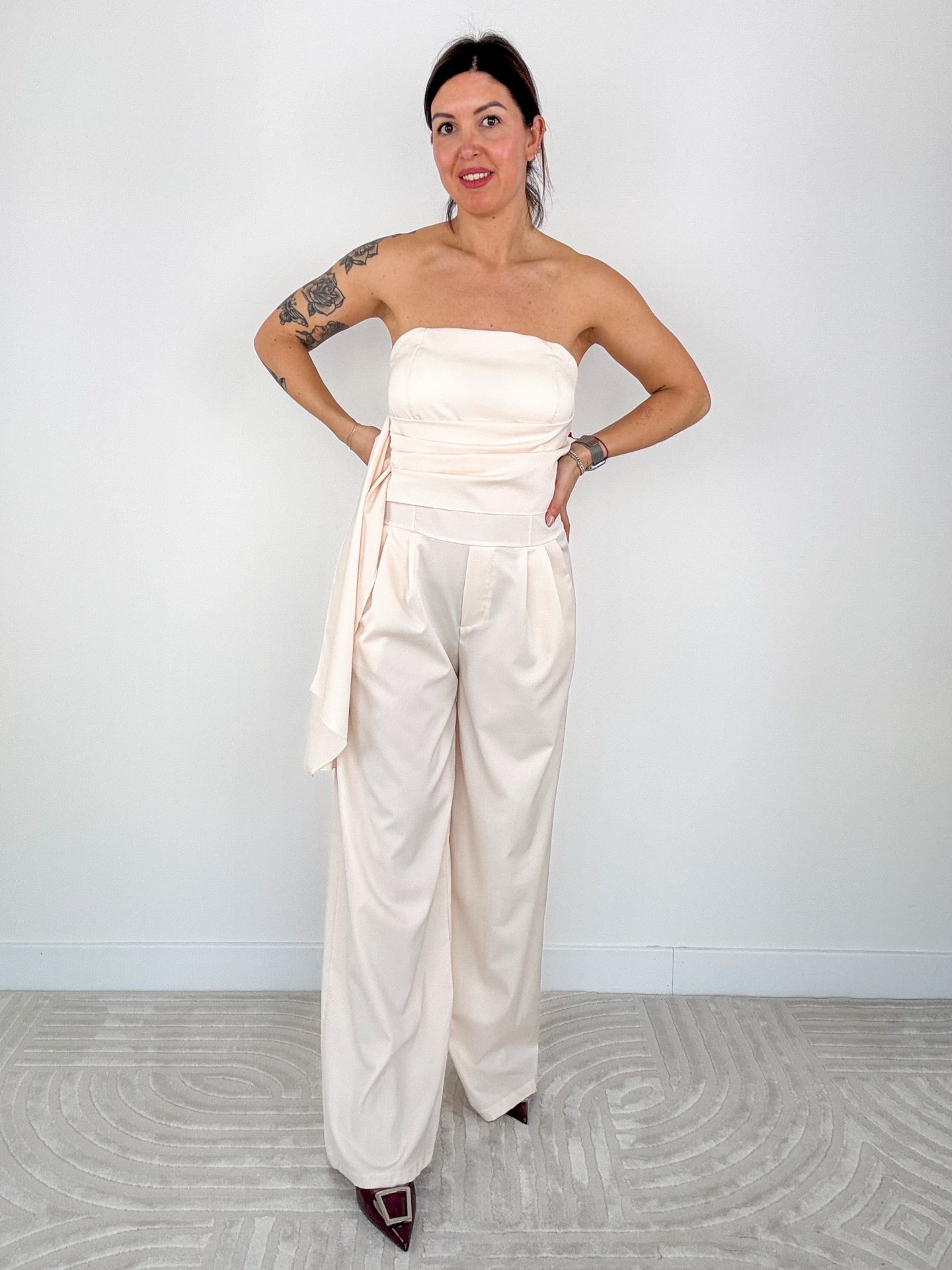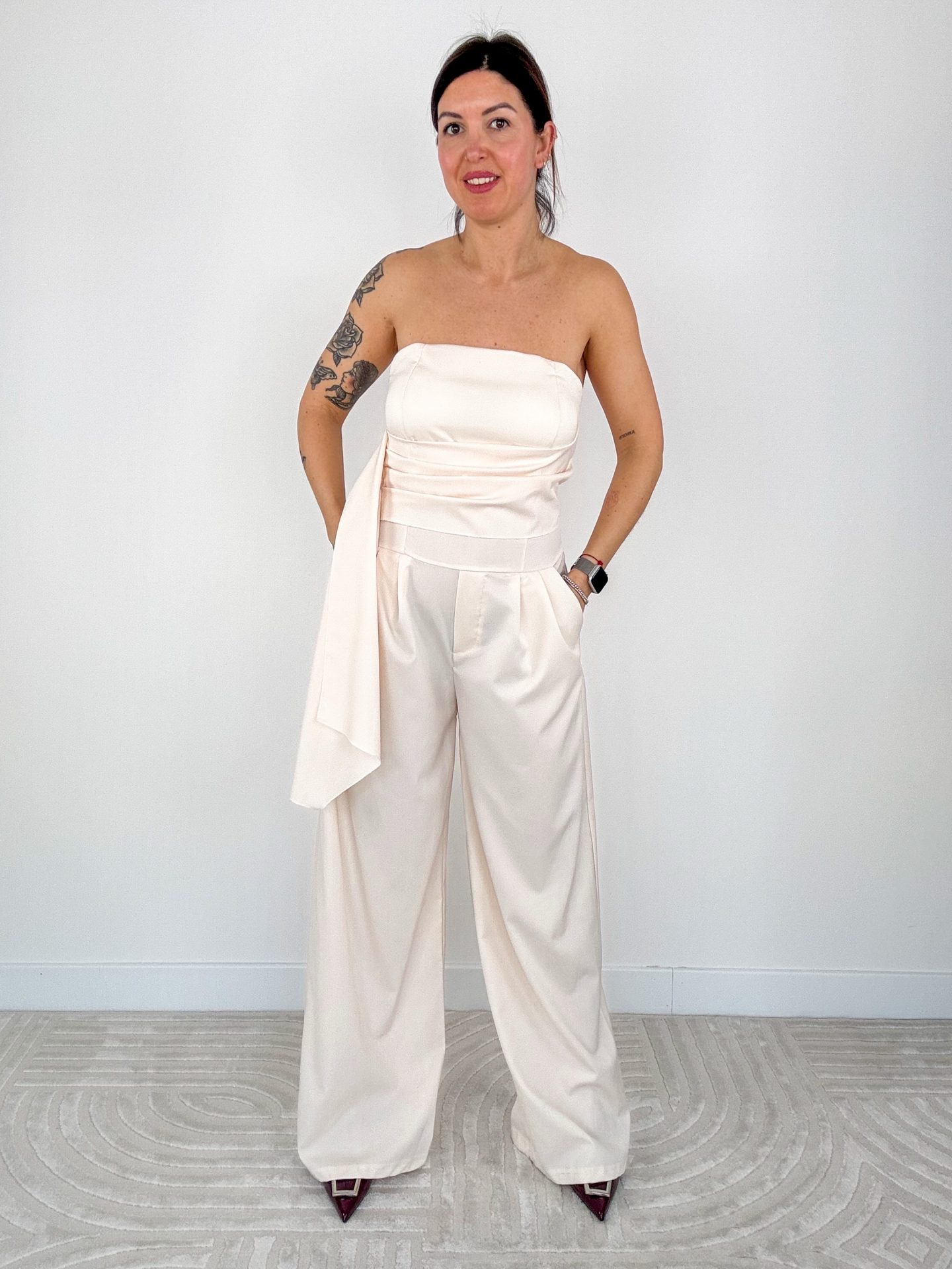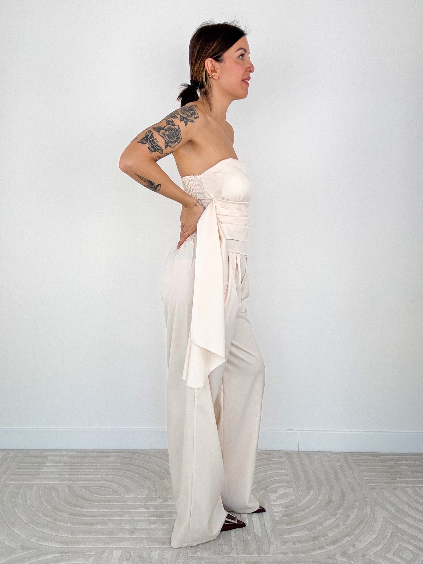 - Jumpsuit scollo dritto con pantalone palazzo.