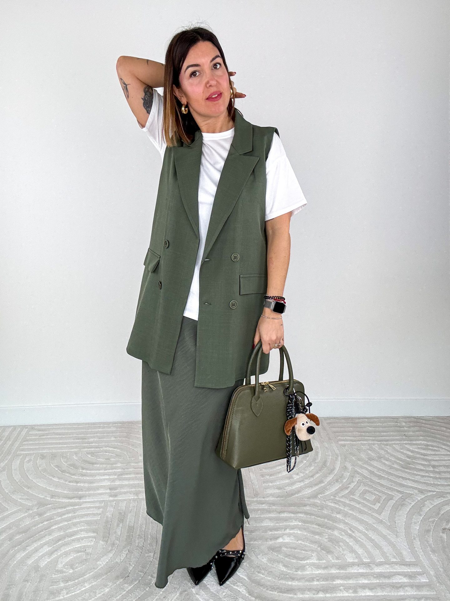 Completa l’outfit con la Borsa Boho, un accessorio in vera pelle che offre sia praticità che stile, perfetta per portare tutto il necessario. Le Ballerine Carmen sono la scelta ideale per chi cerca comfort senza rinunciare al look elegante, mentre il Charm Dog aggiunge un dettaglio divertente e originale.