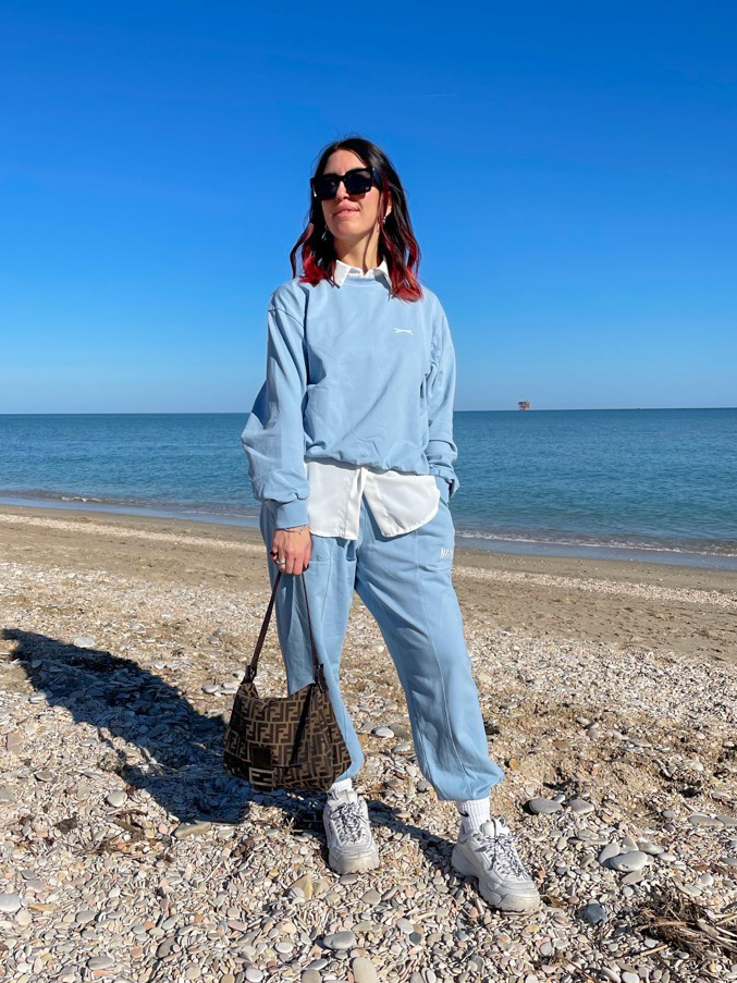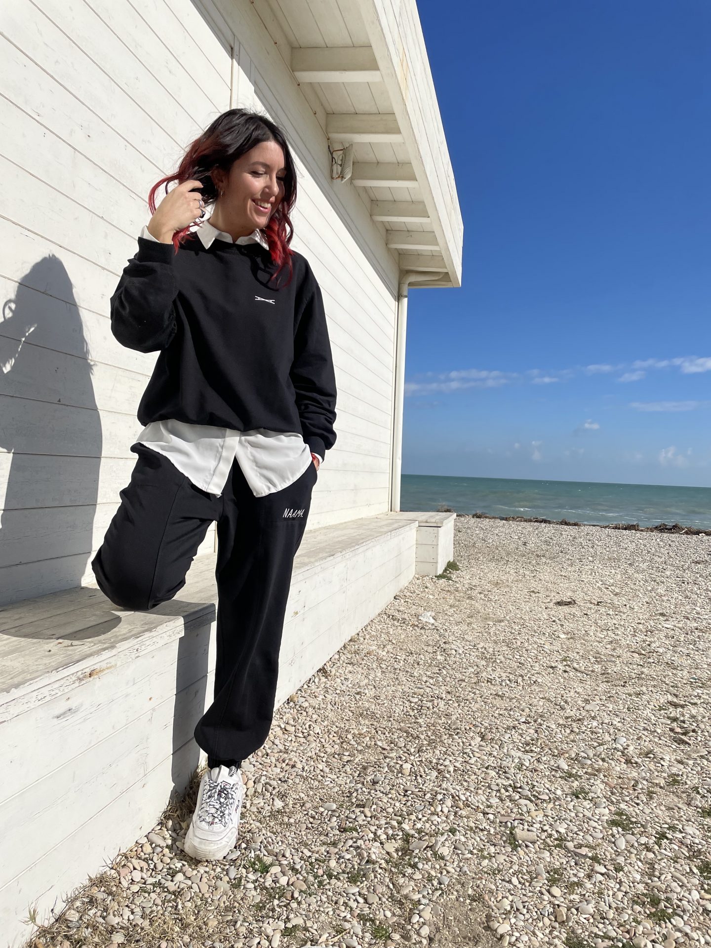 - Pantalone tuta in cotone garzato con elastico in vita.