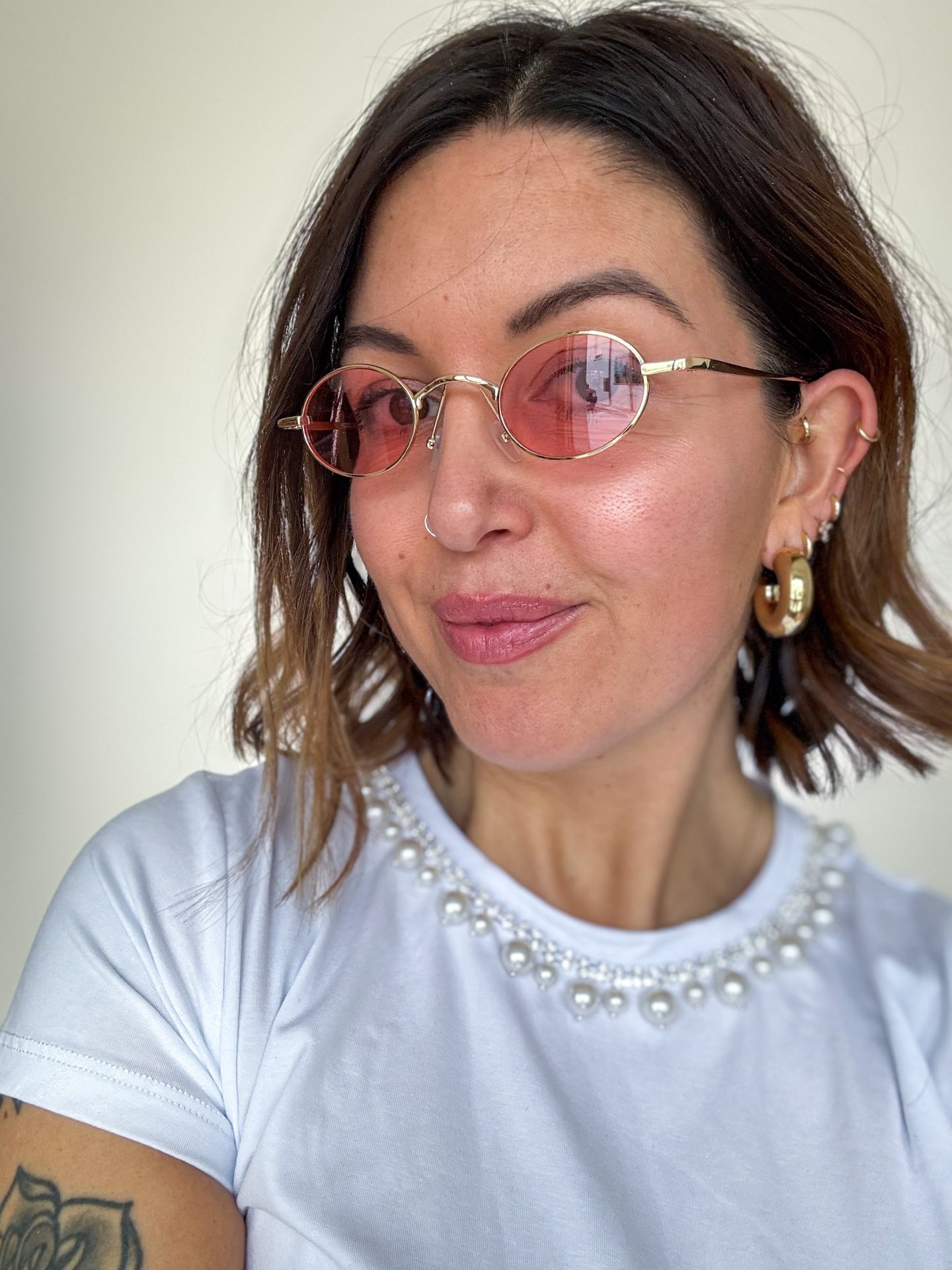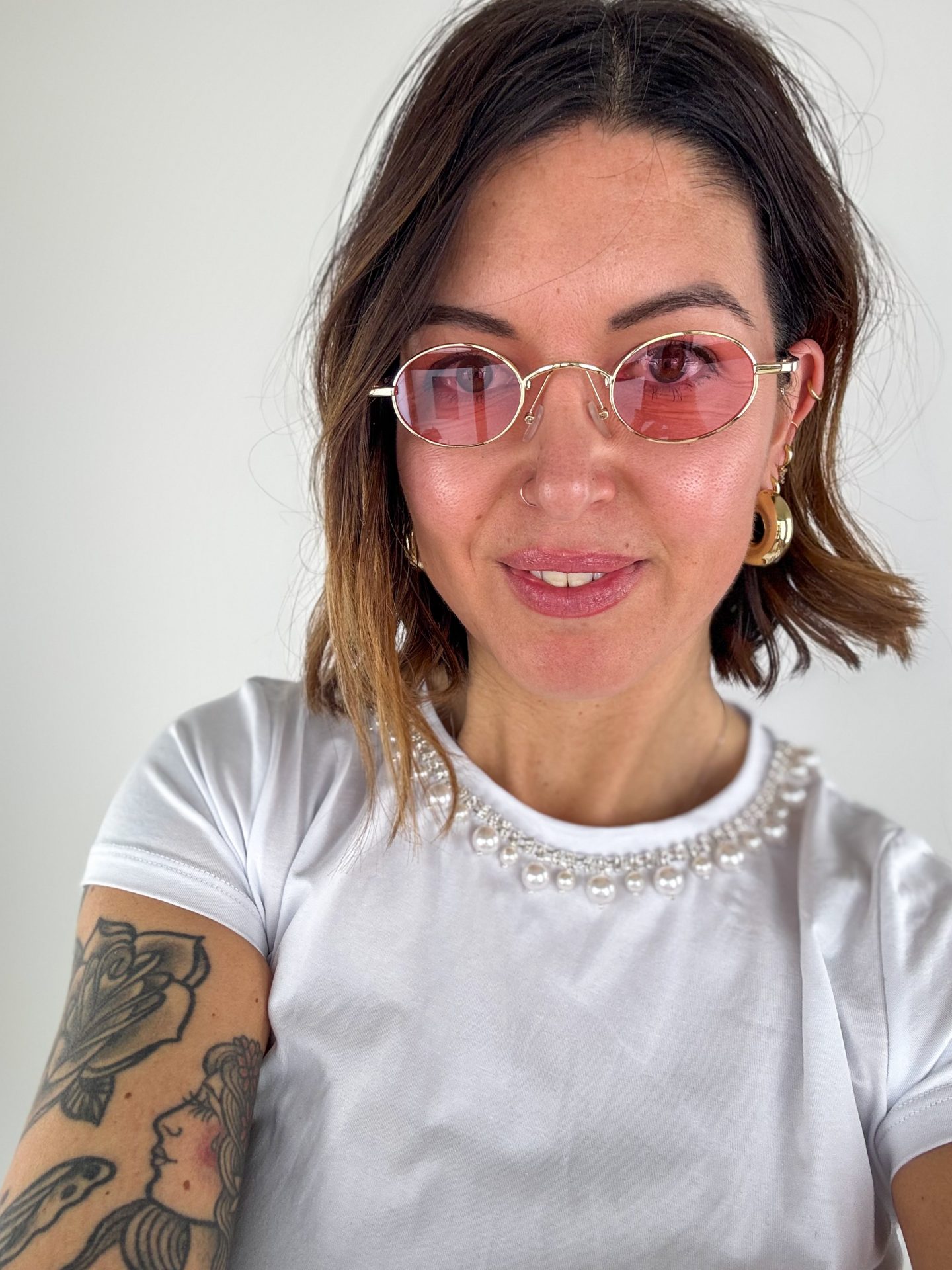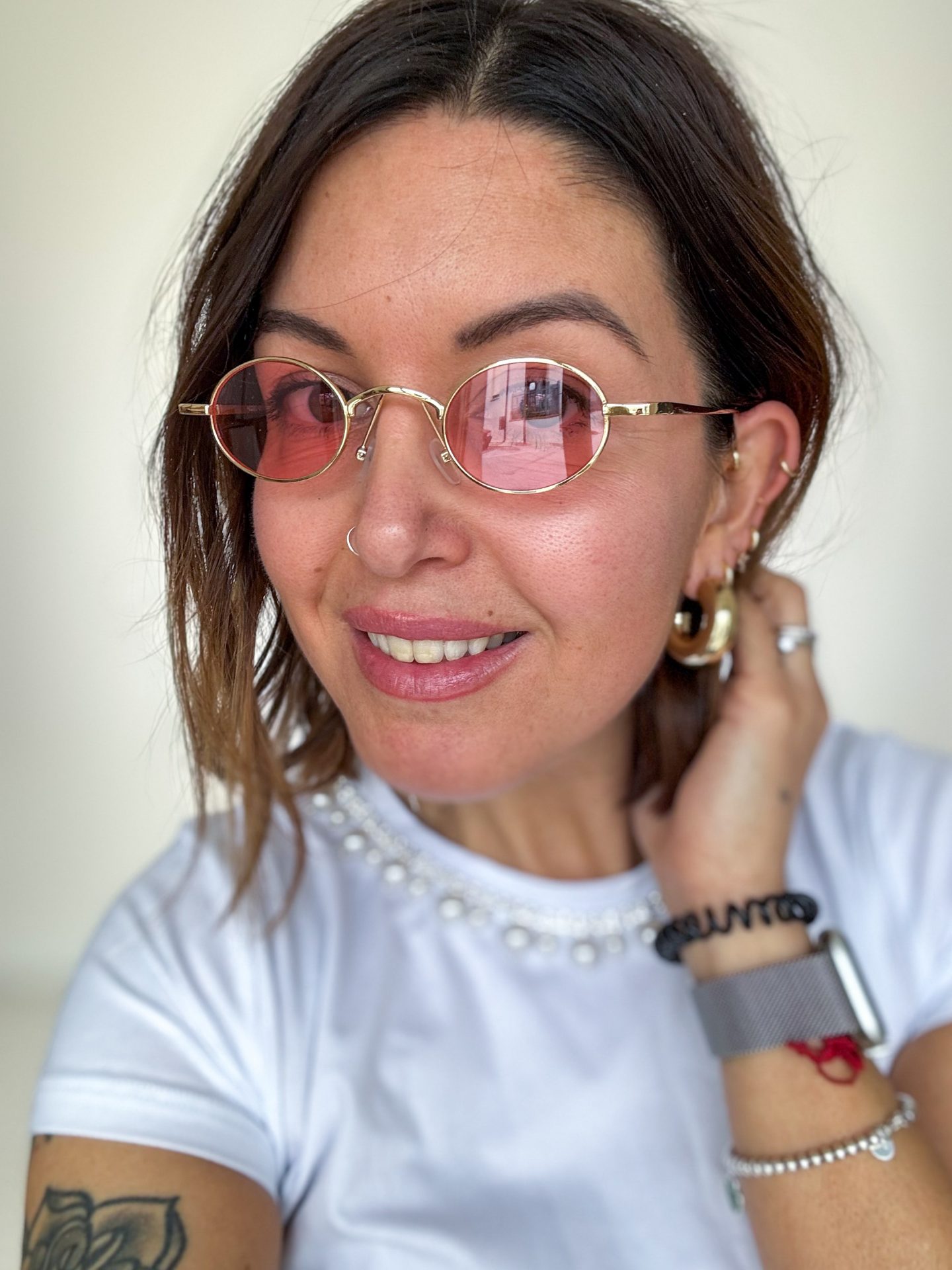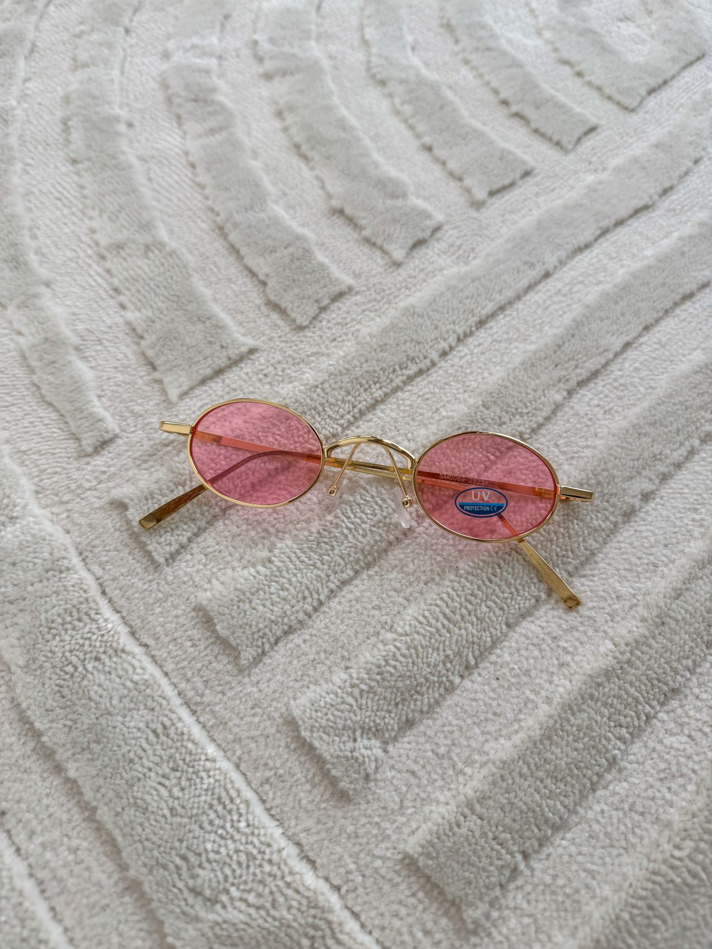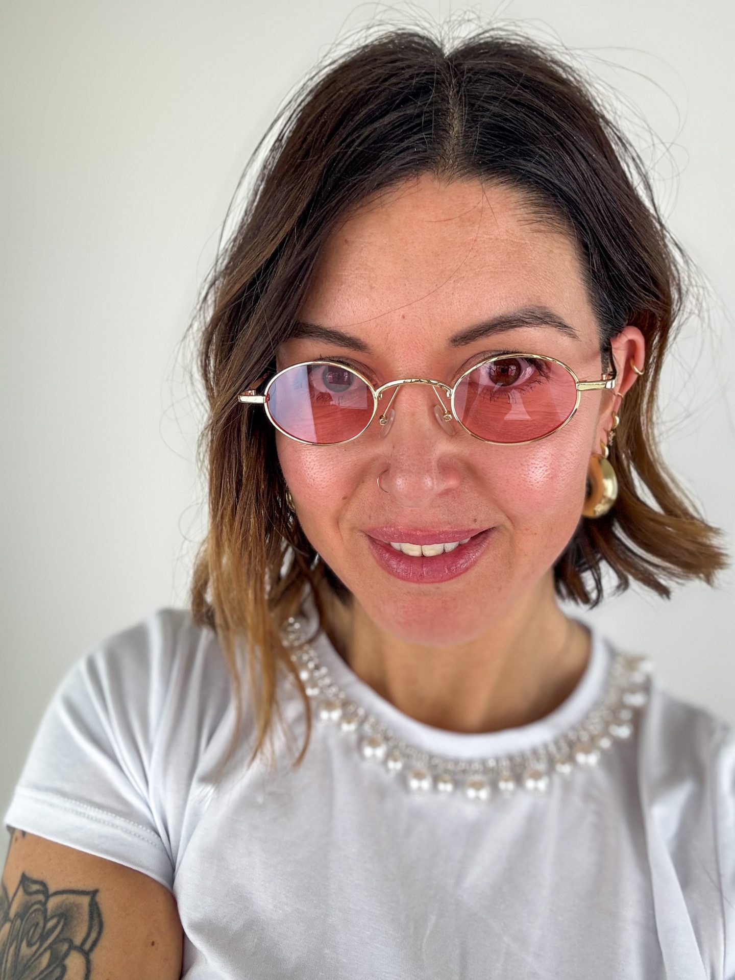 - Montatura color oro, lente rosa.