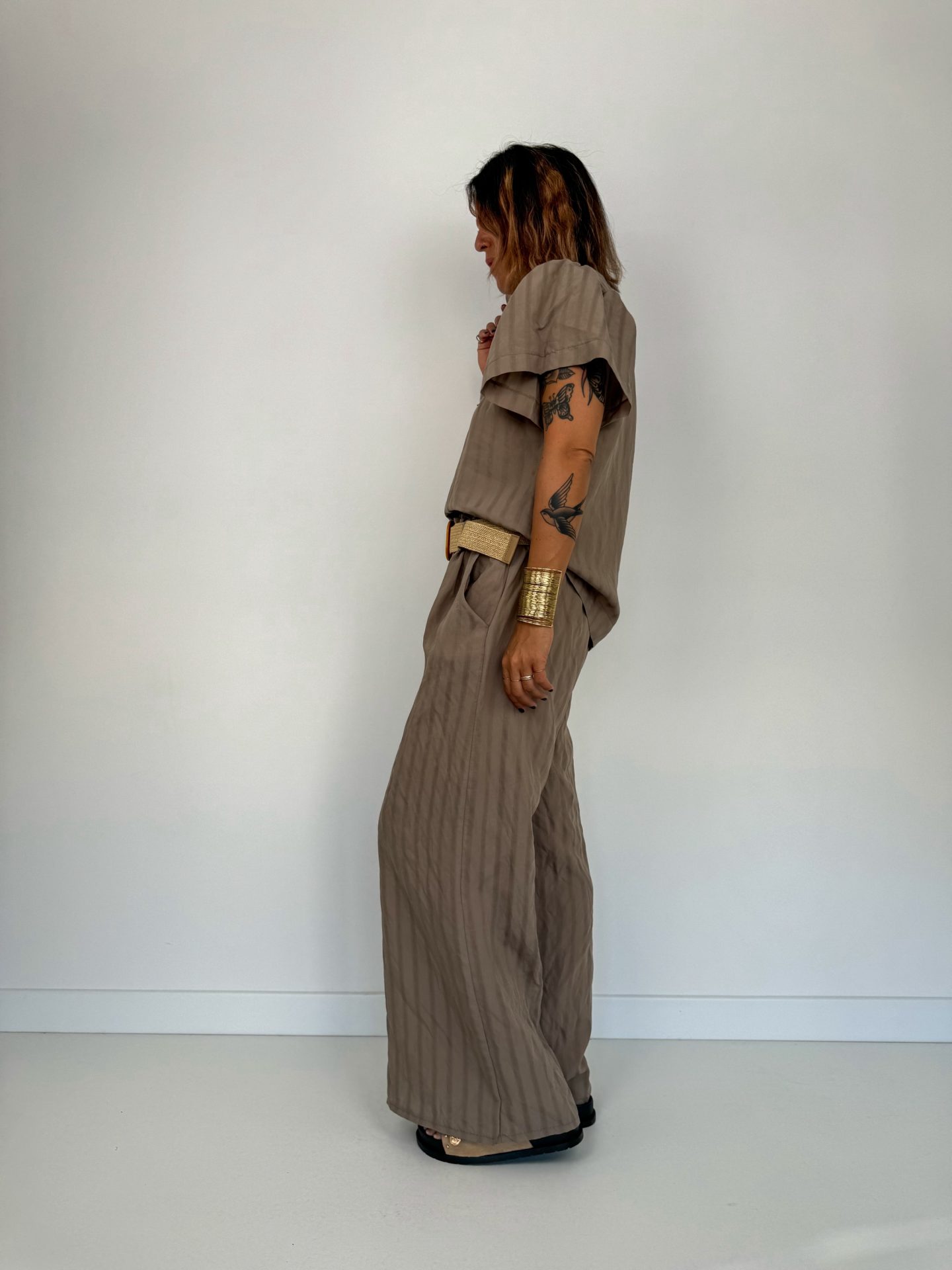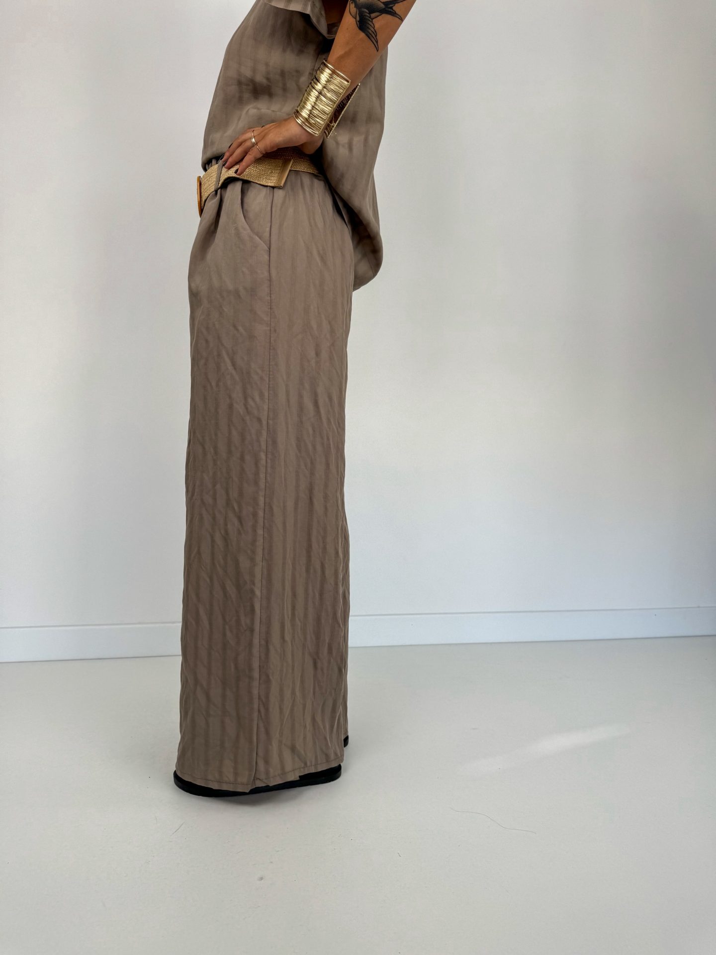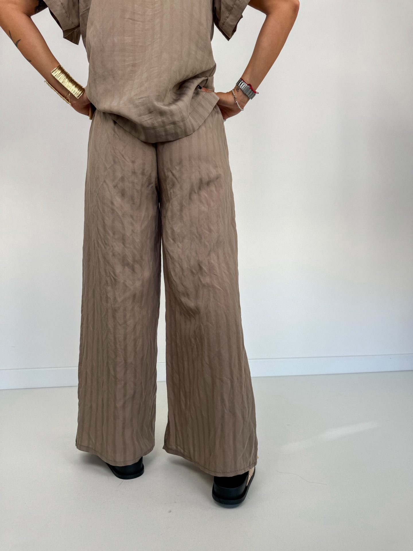 - Pantalone modello palazzo con elastico in vita.