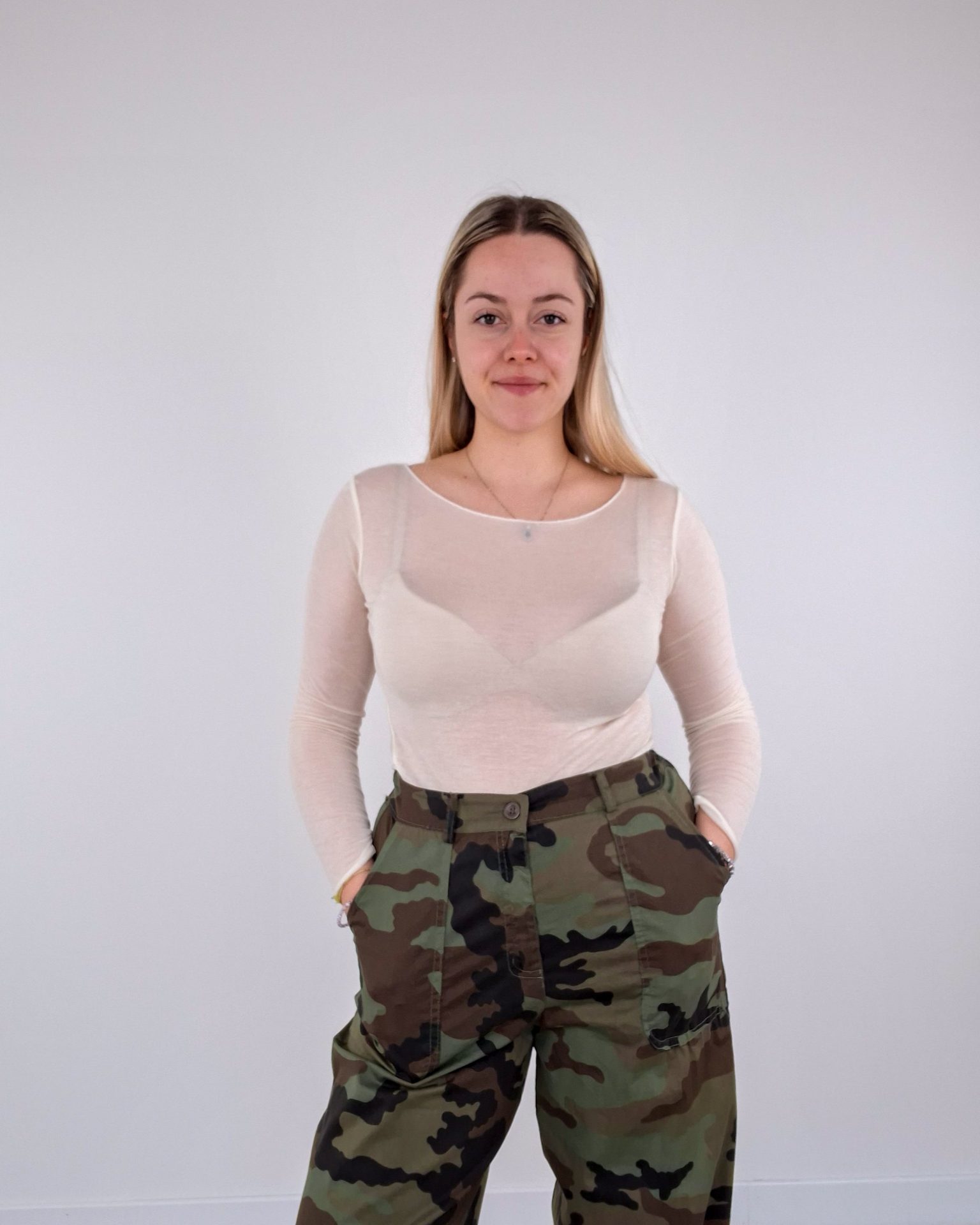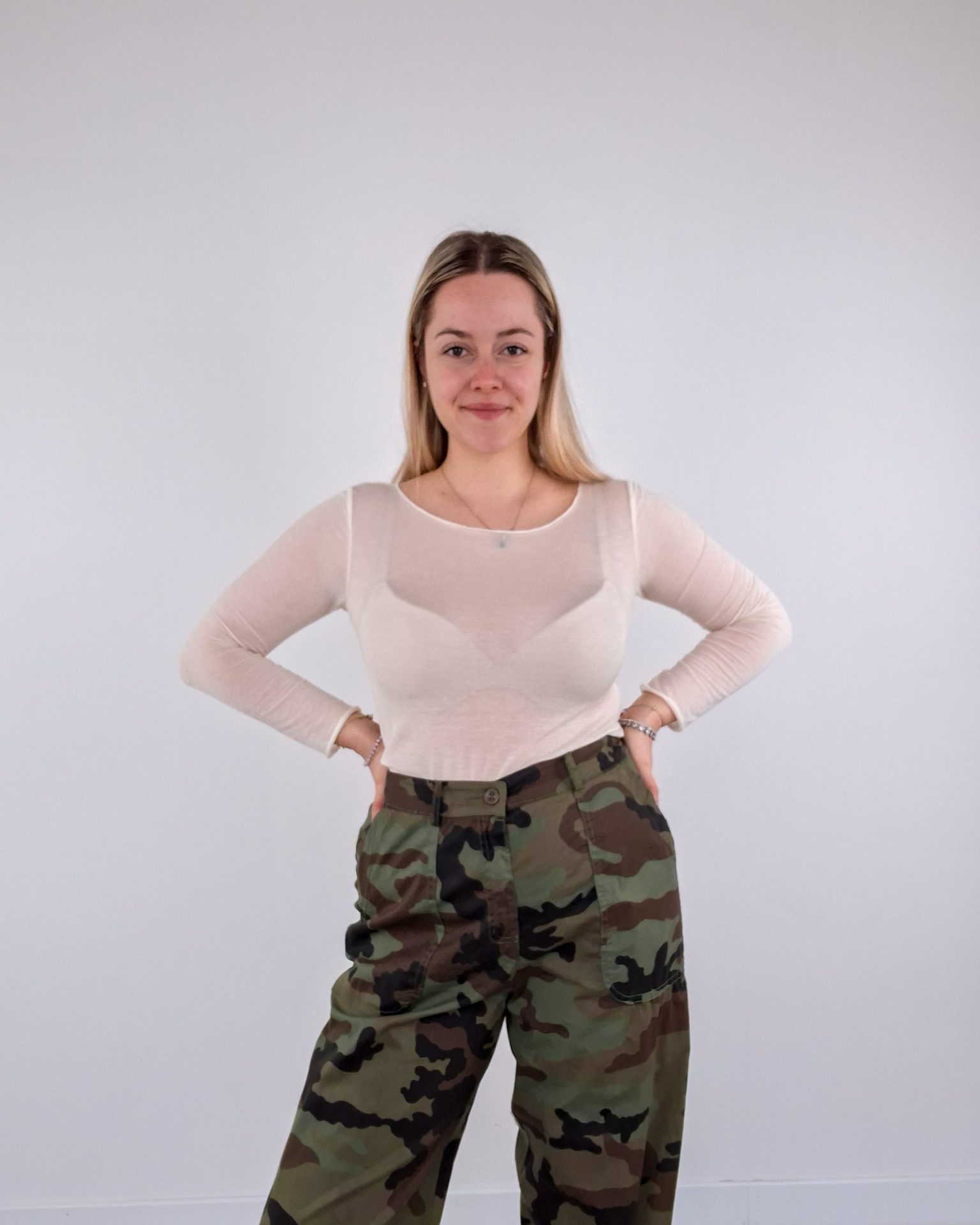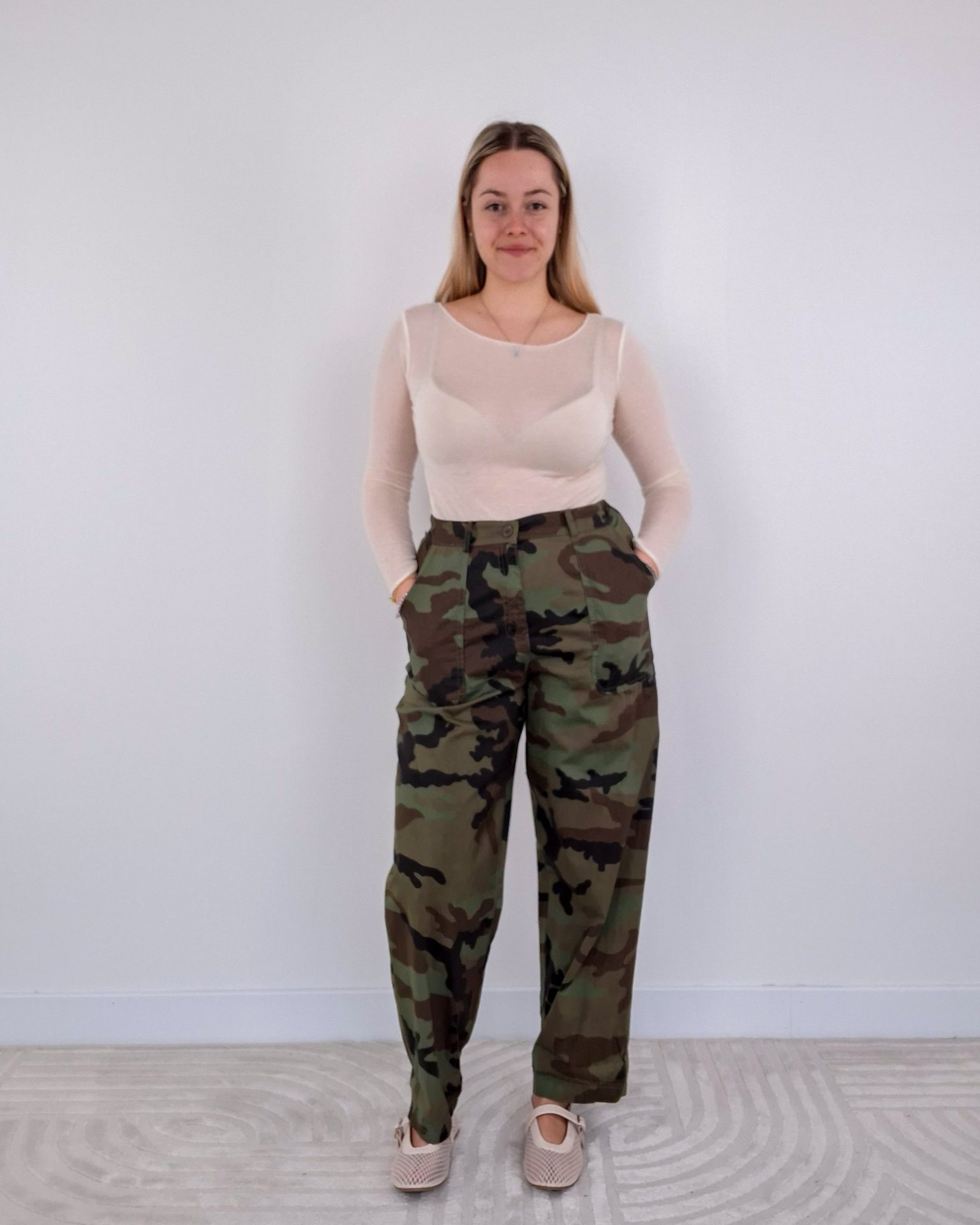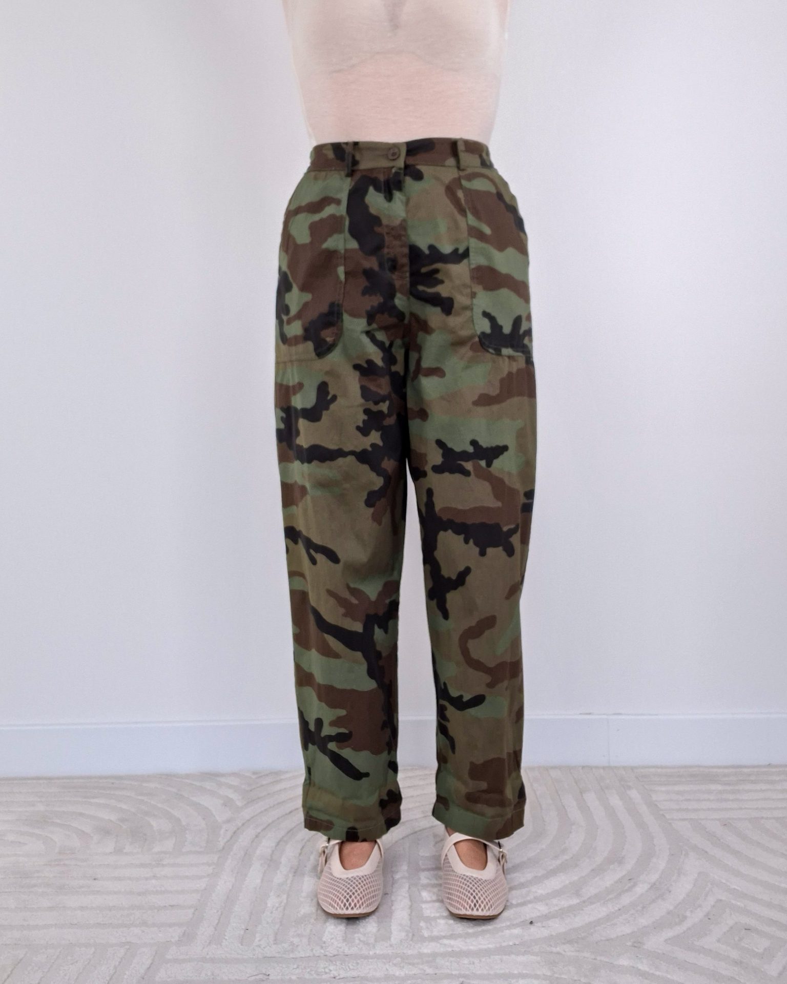 - Pantalone militare misto cotone, con chiusura classica ed elastico sul retro.