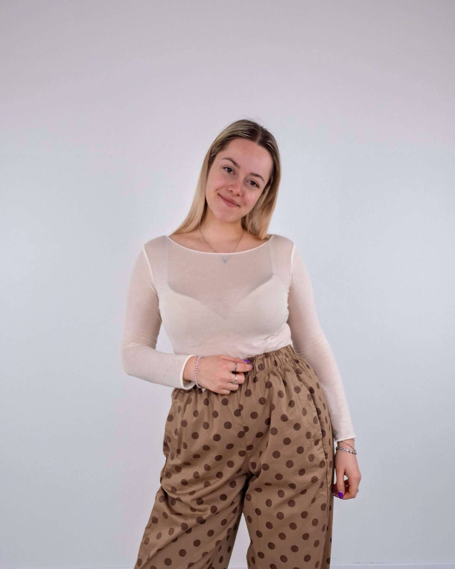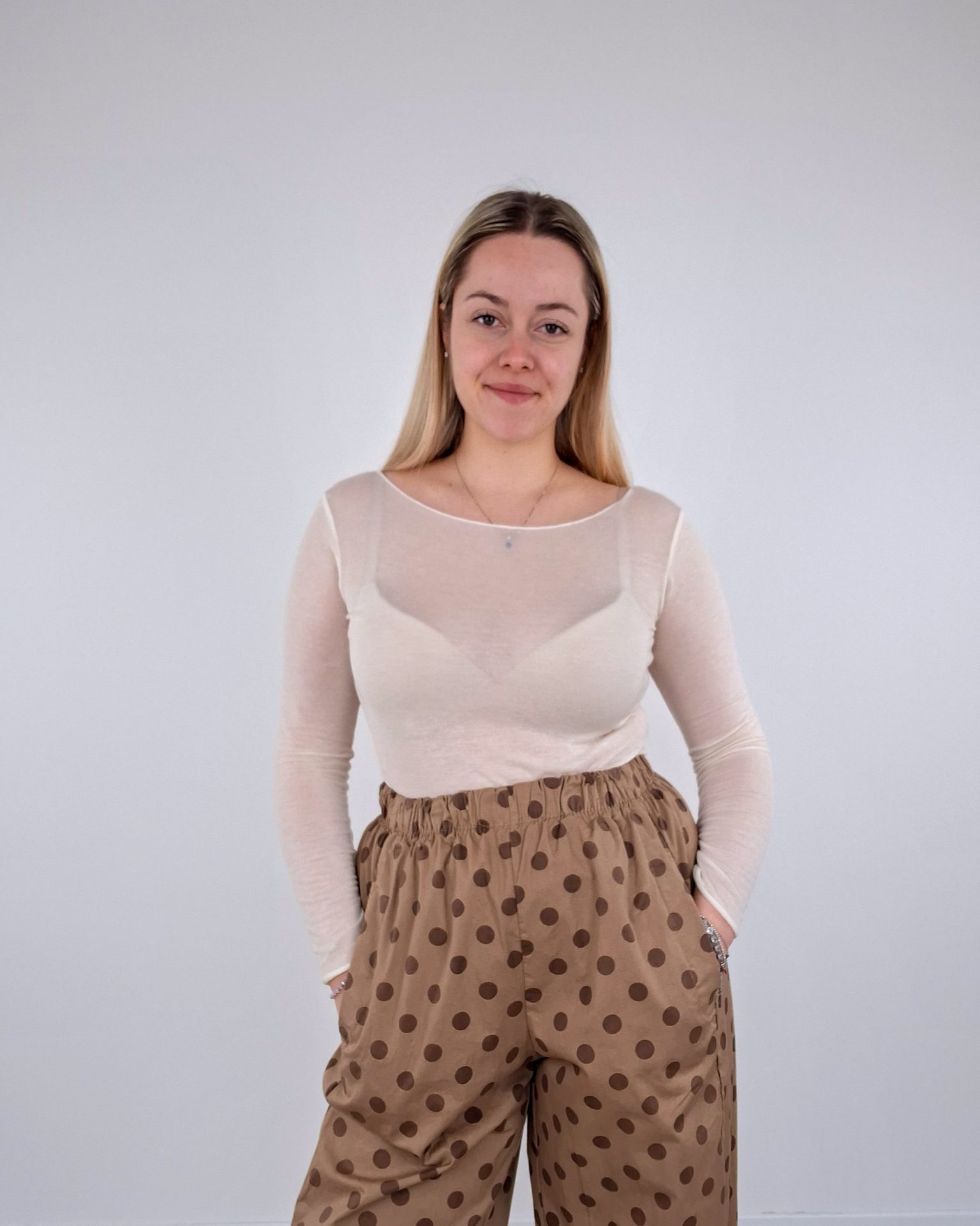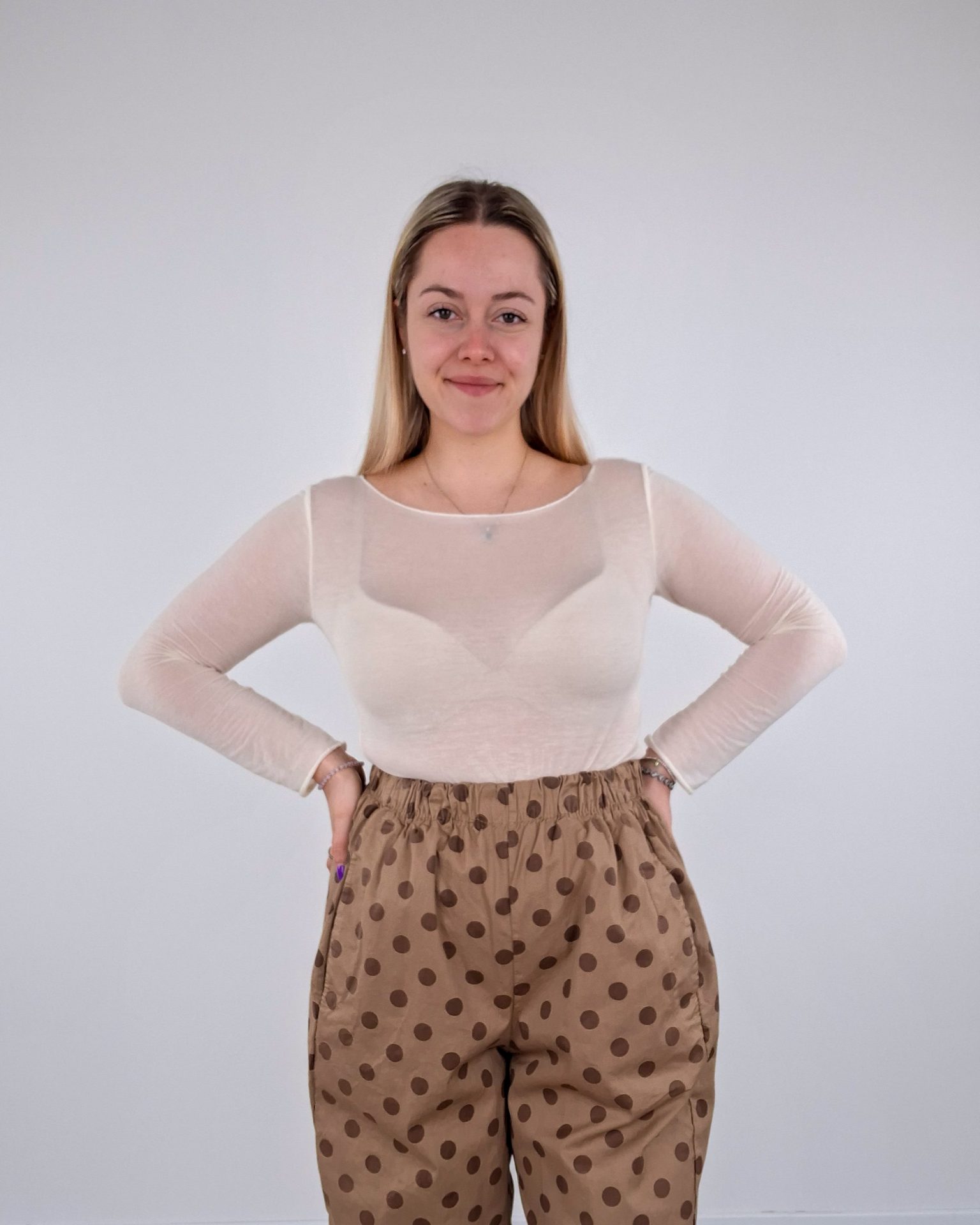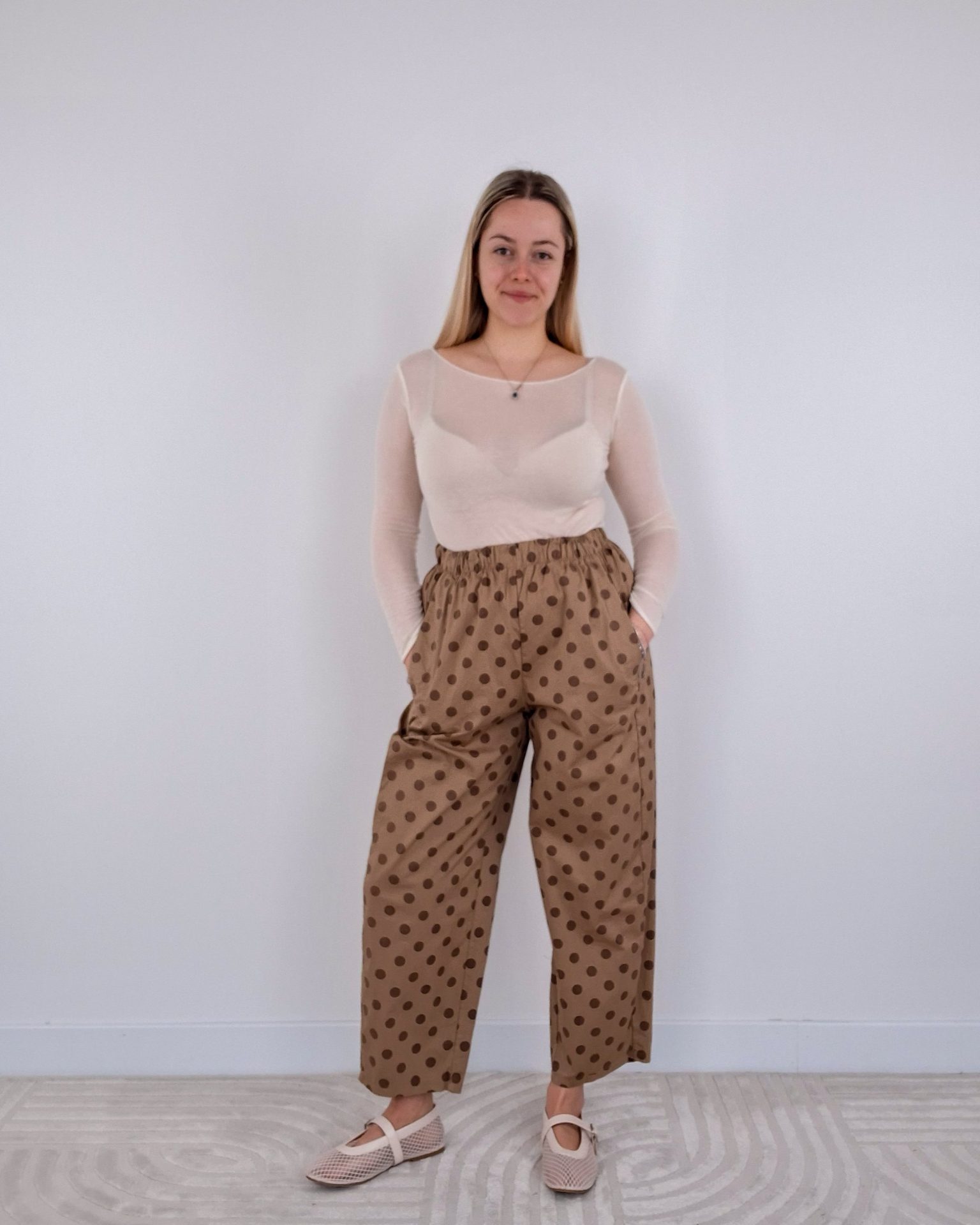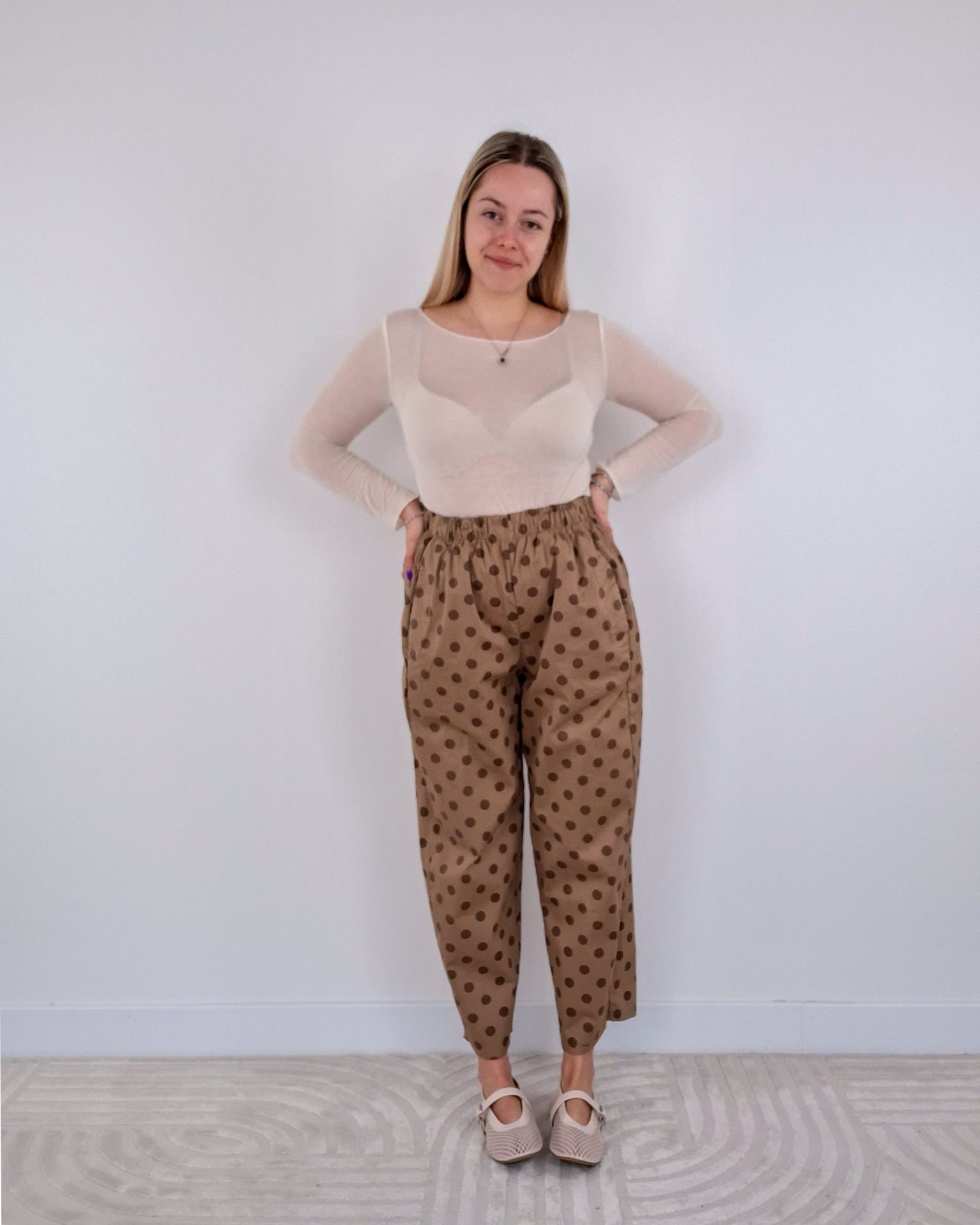 • Pantalone a pois con elastico in vita.
