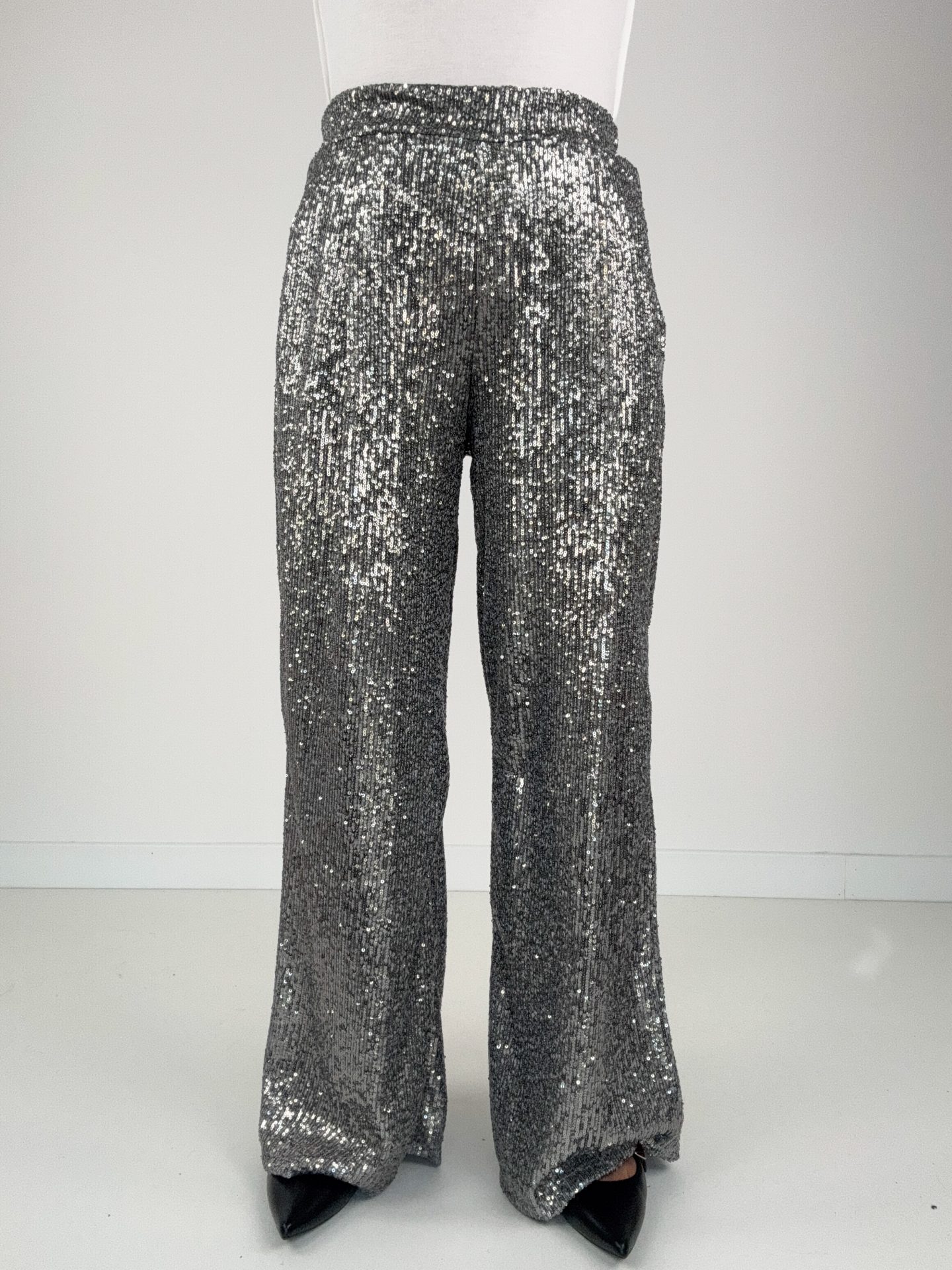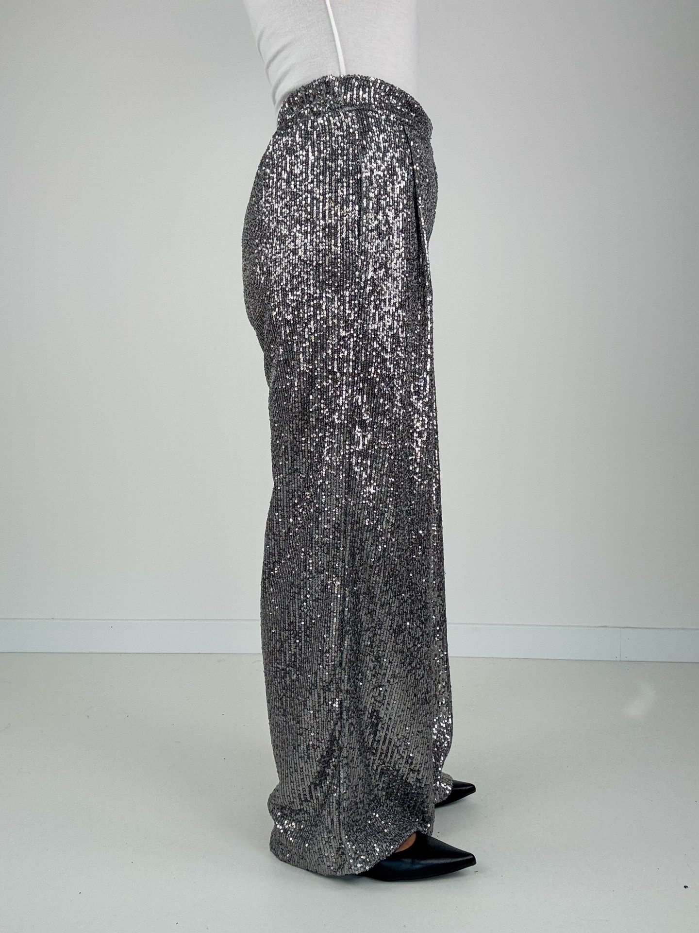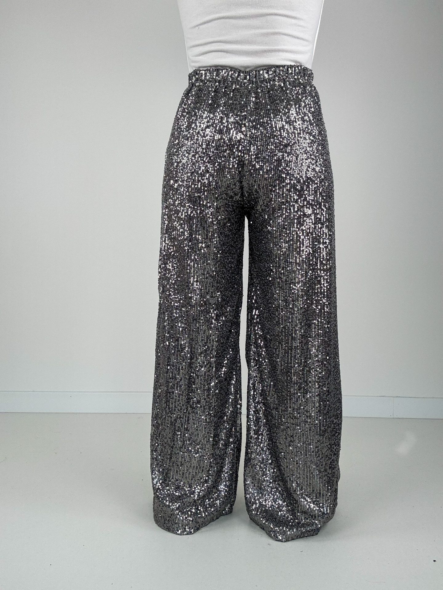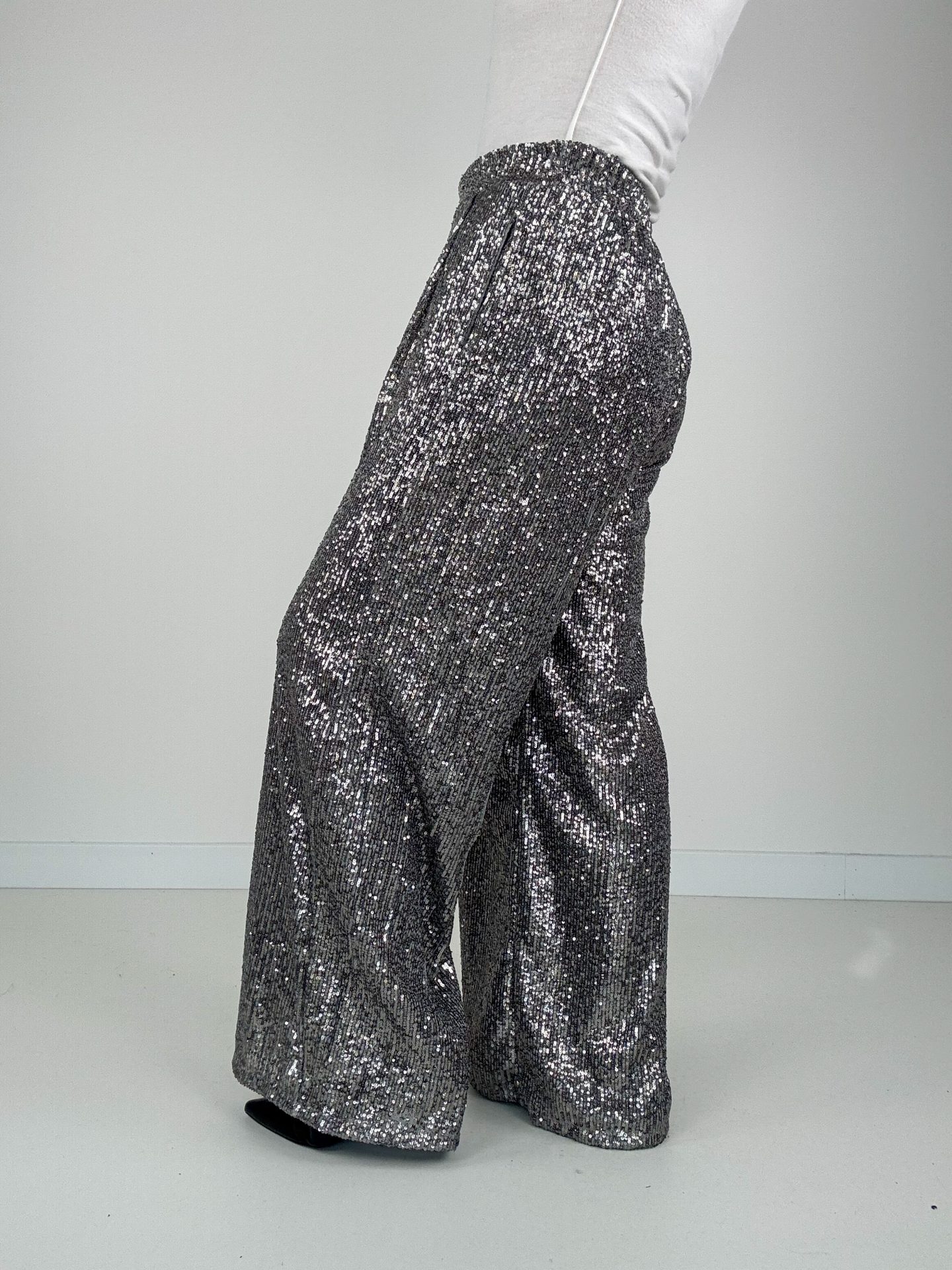 - Pantalone modello palazzo con paillettes ed elastico in vita.