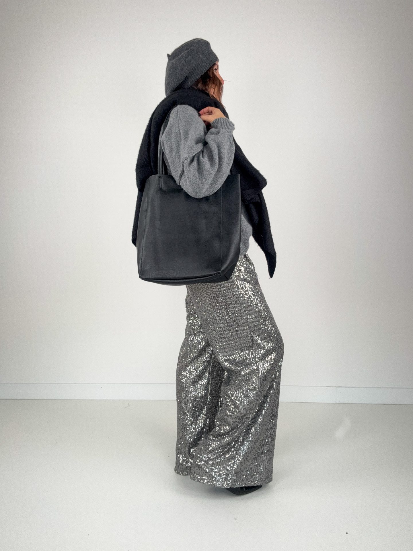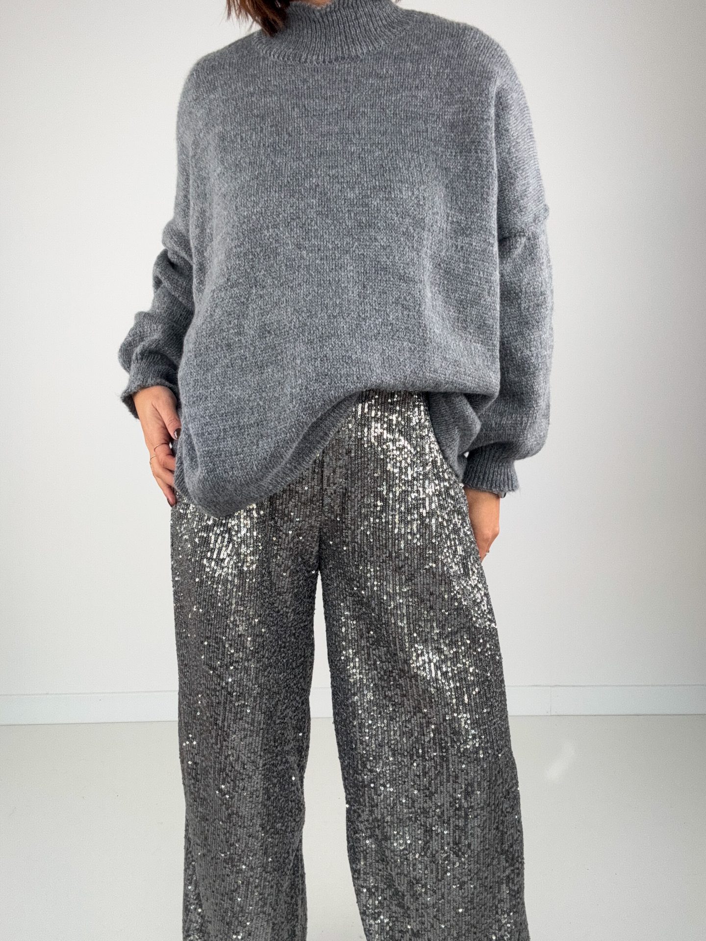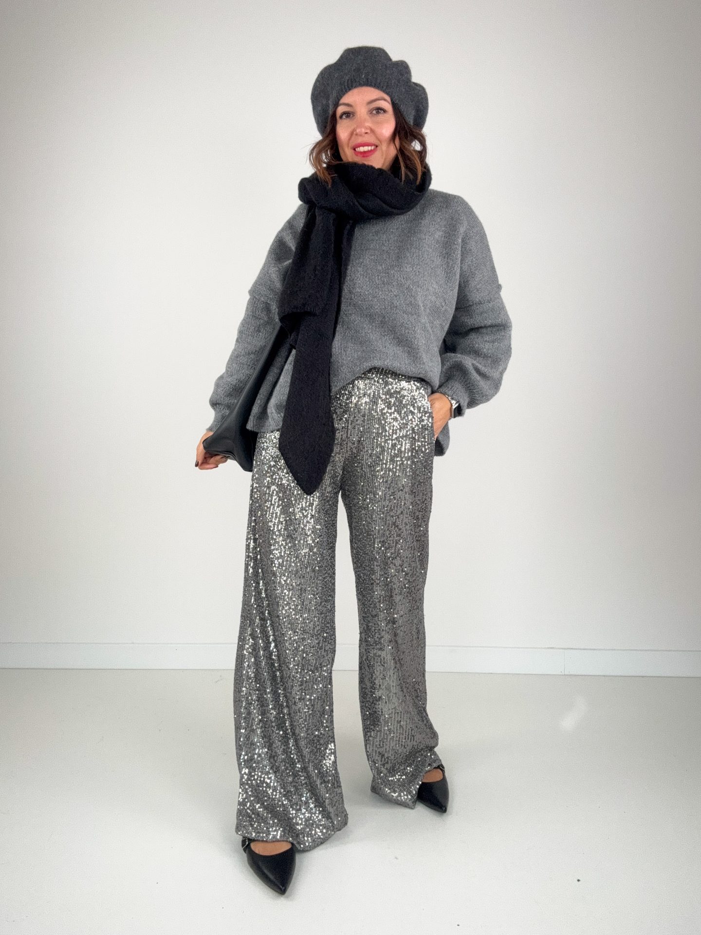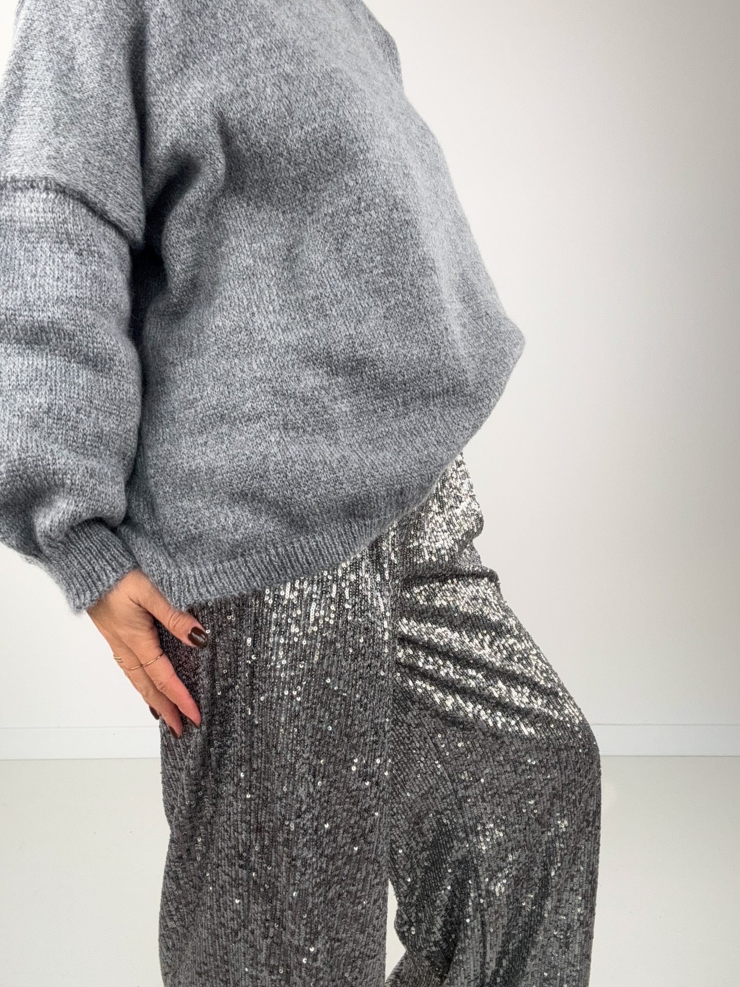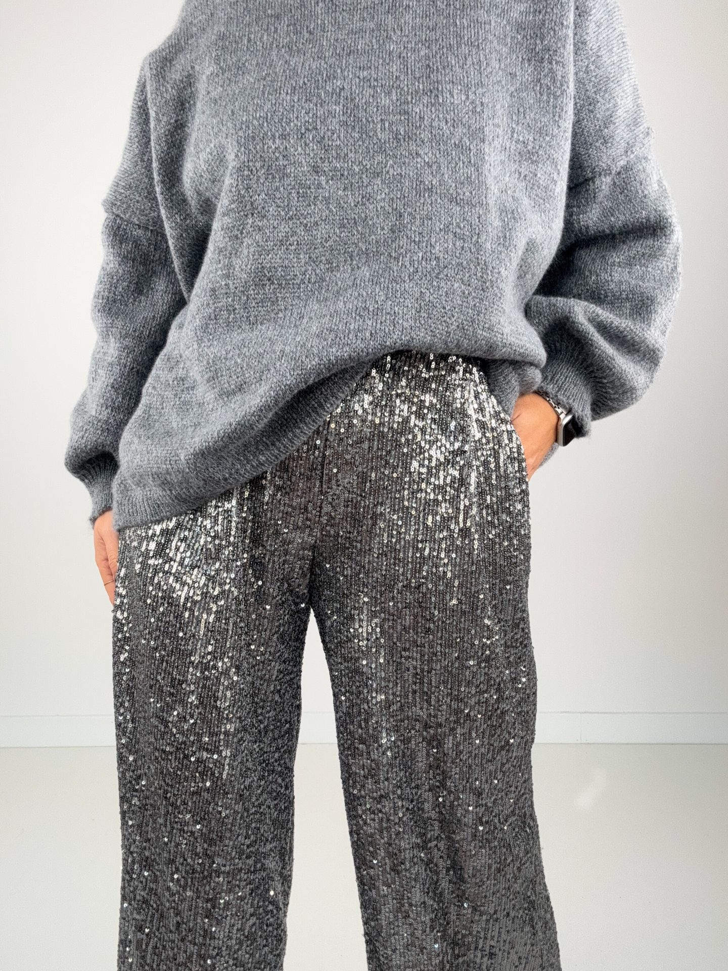 - Pantalone modello palazzo con paillettes ed elastico in vita.