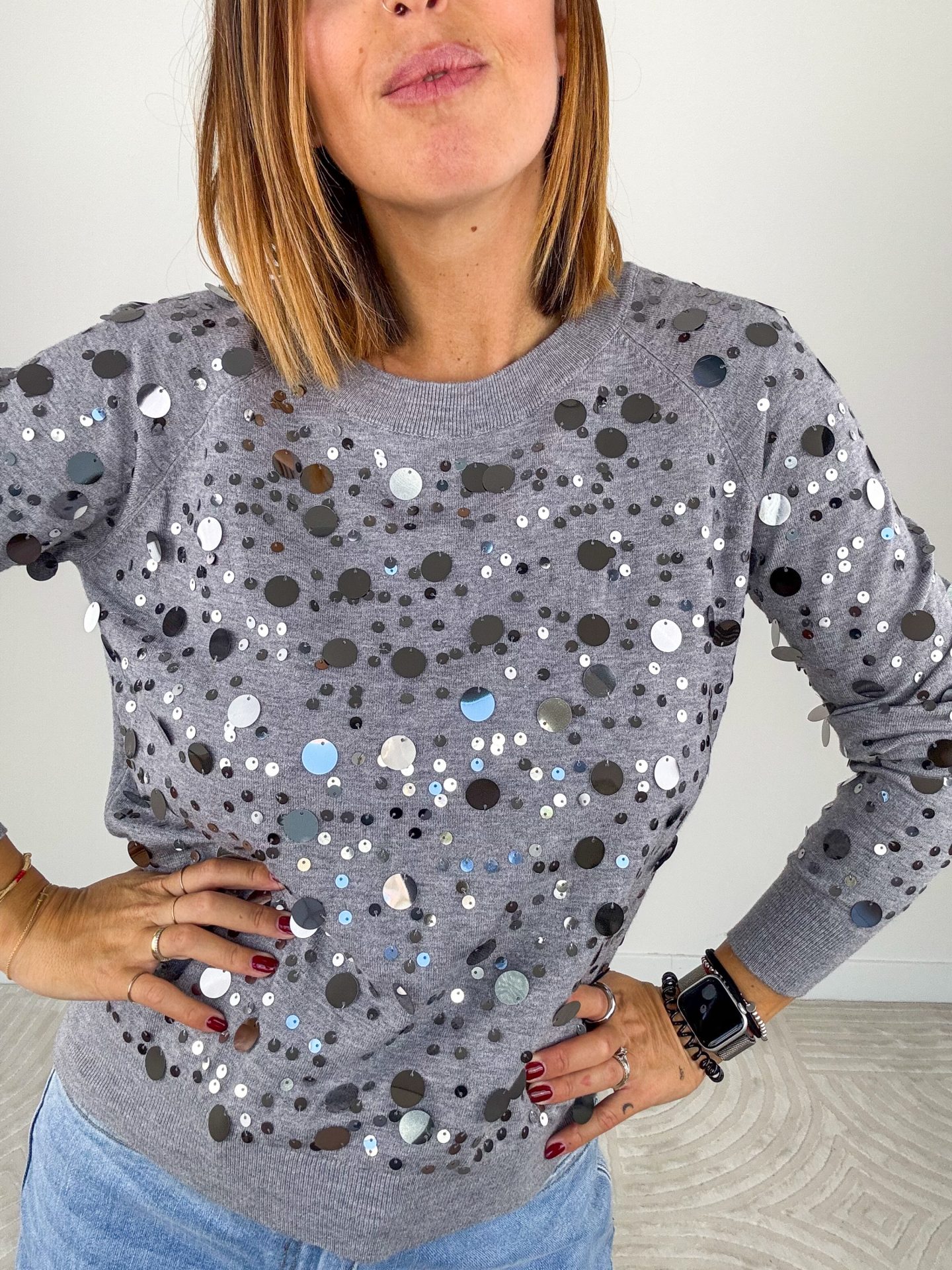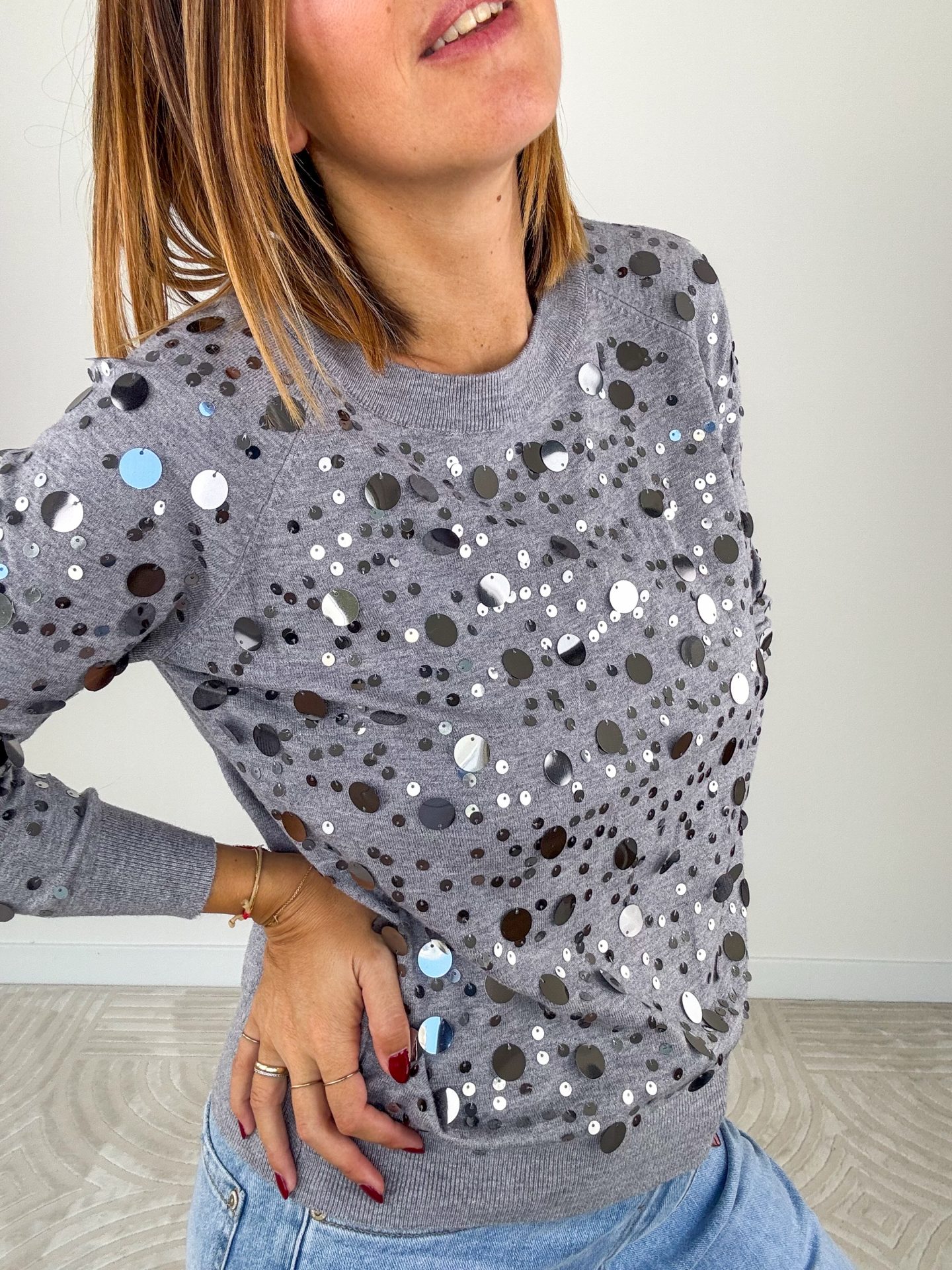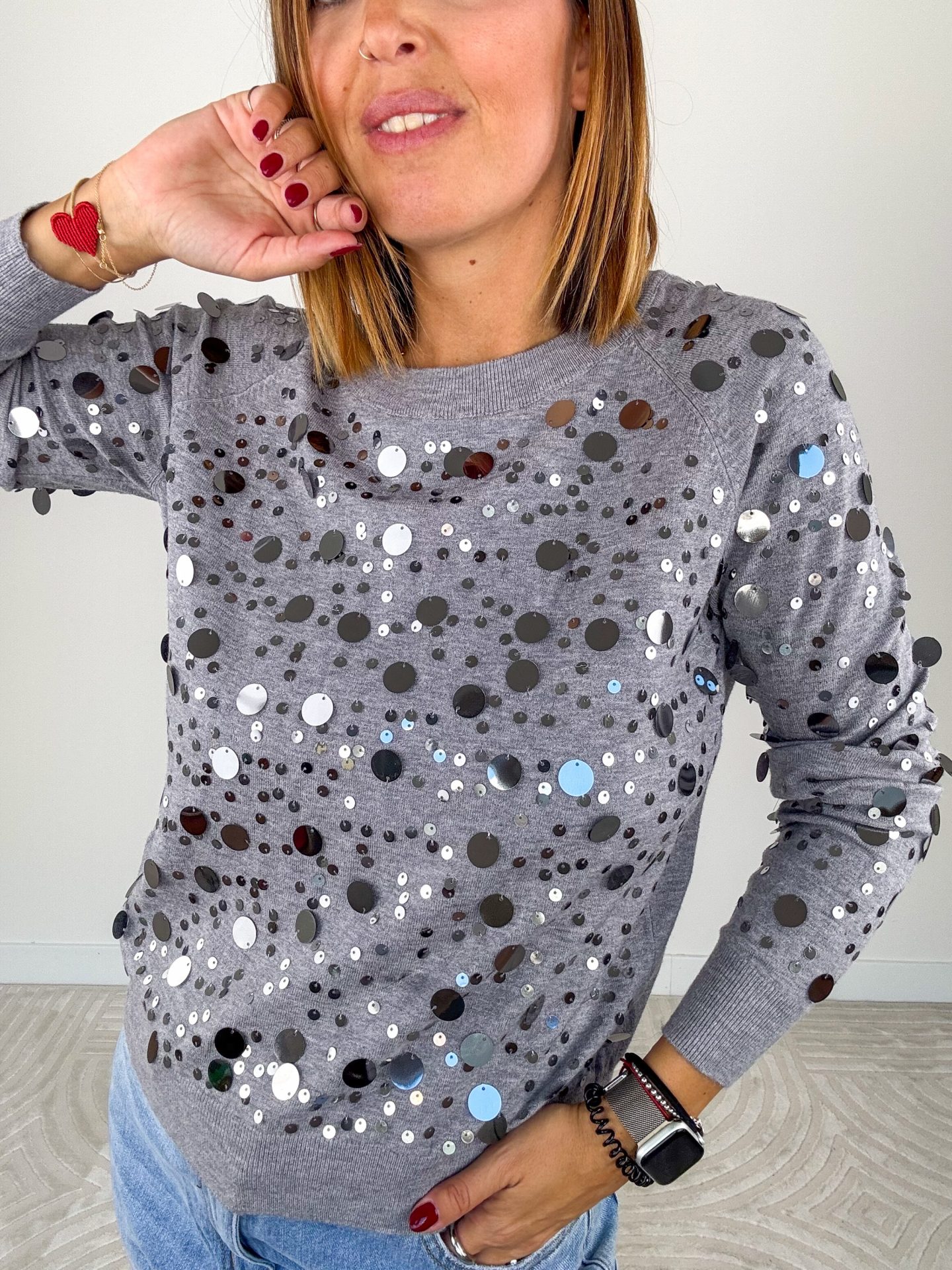 - Dettaglio paillettes di diverse dimensioni sul davanti e sulle maniche.
