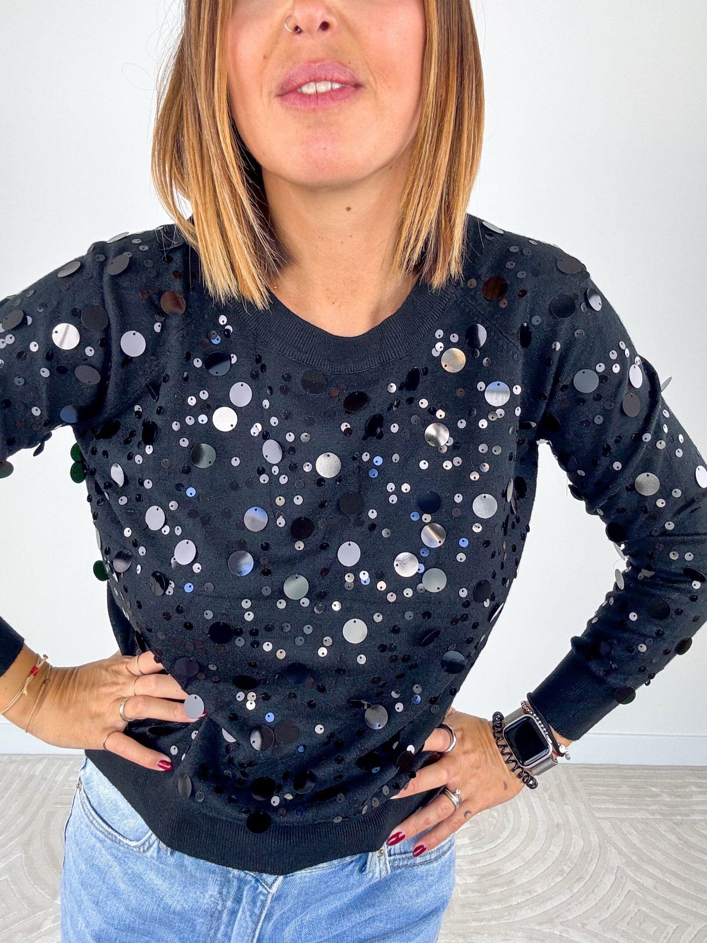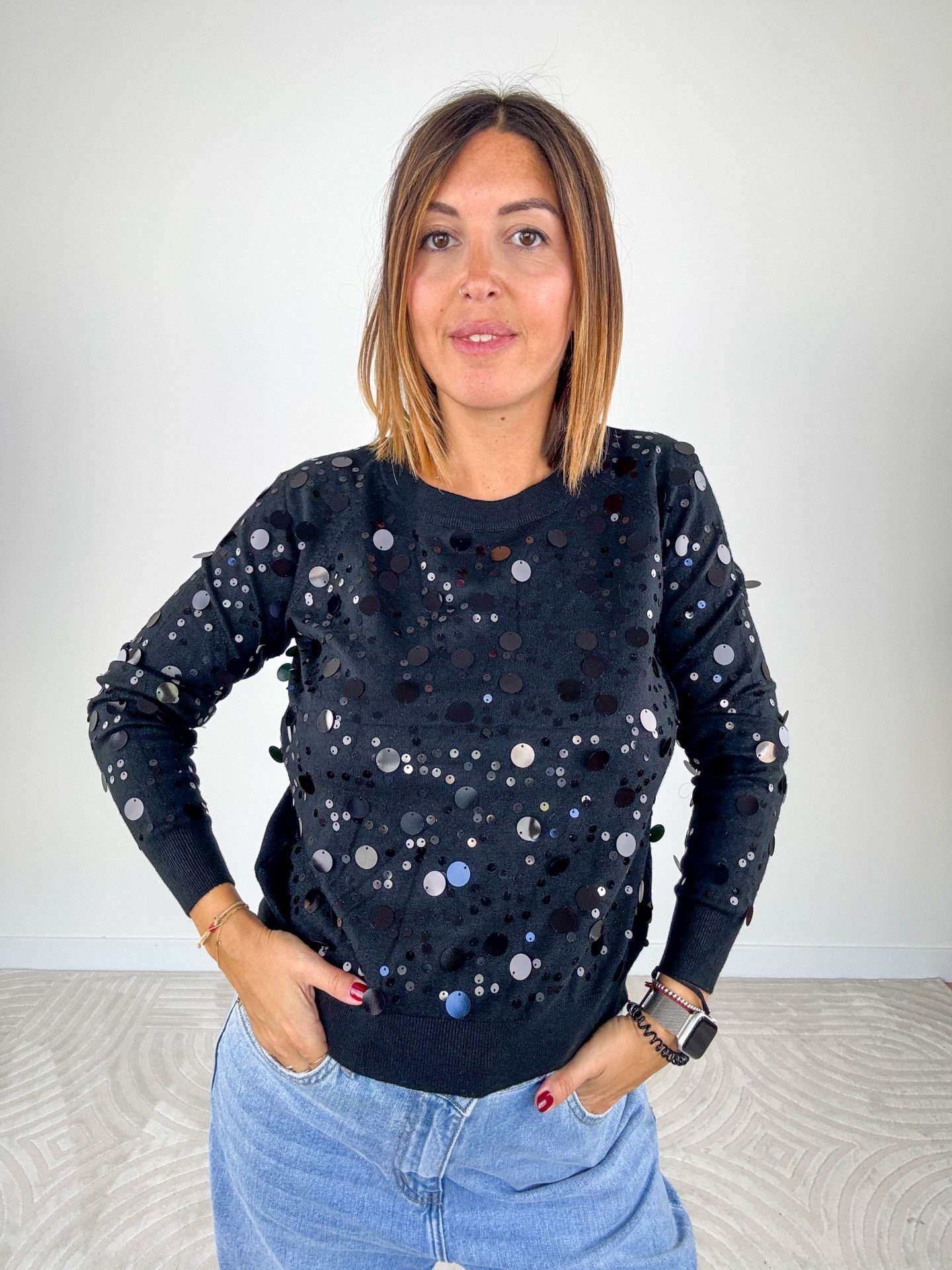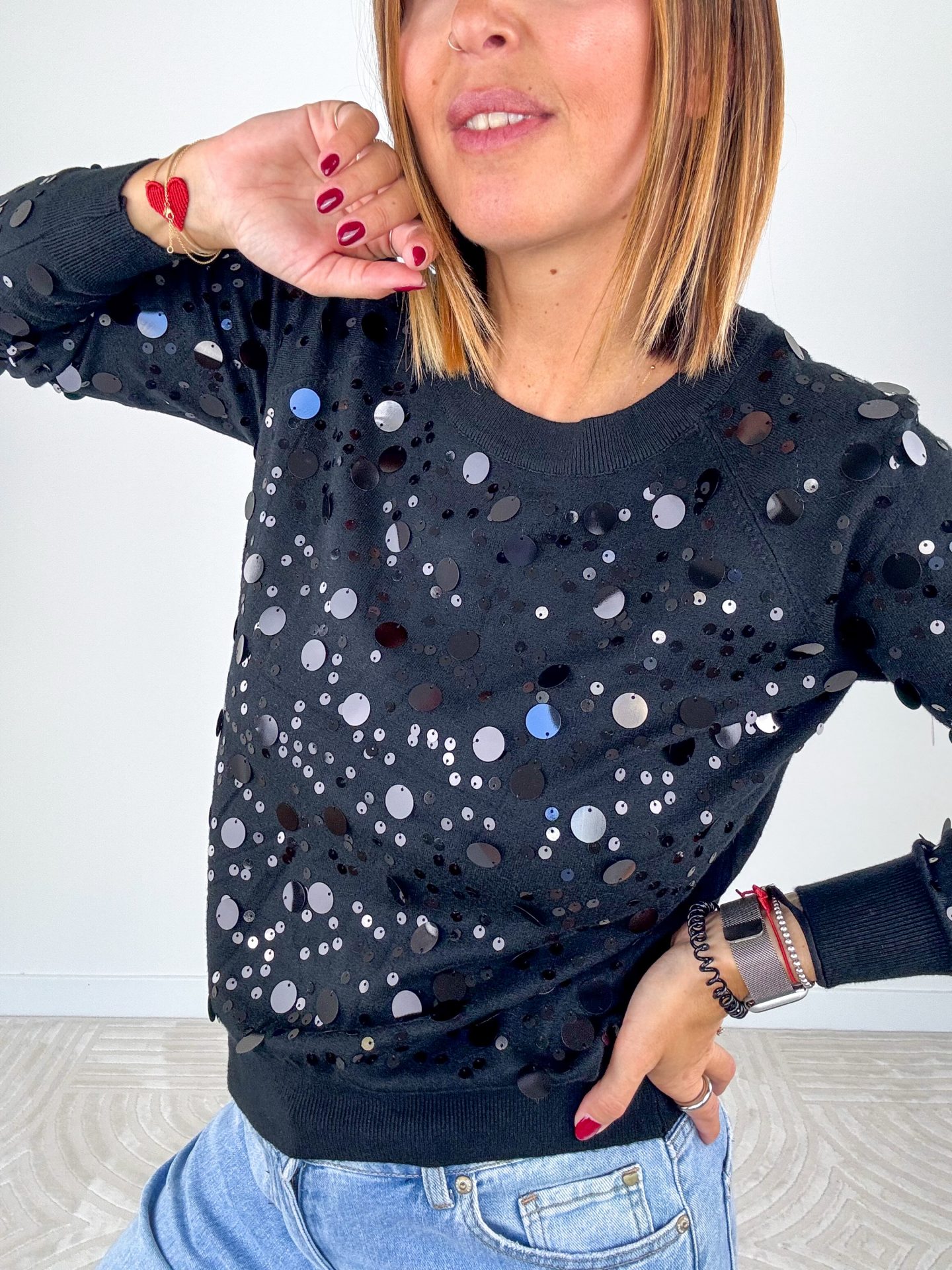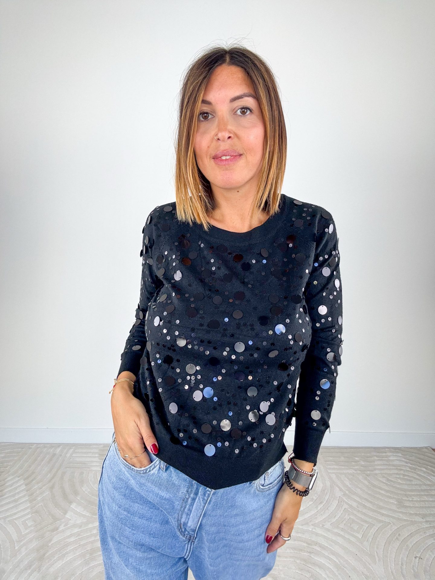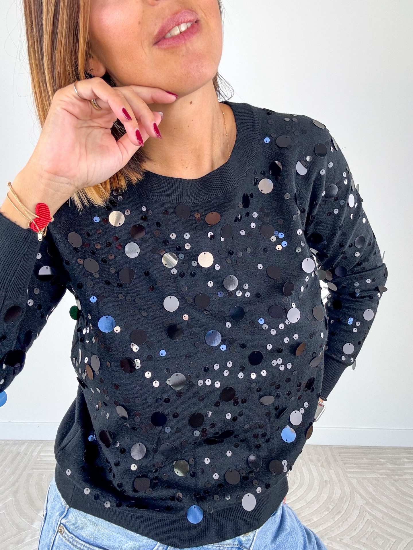 • Dettaglio paillettes di diverse dimensioni sul davanti e sulle maniche.