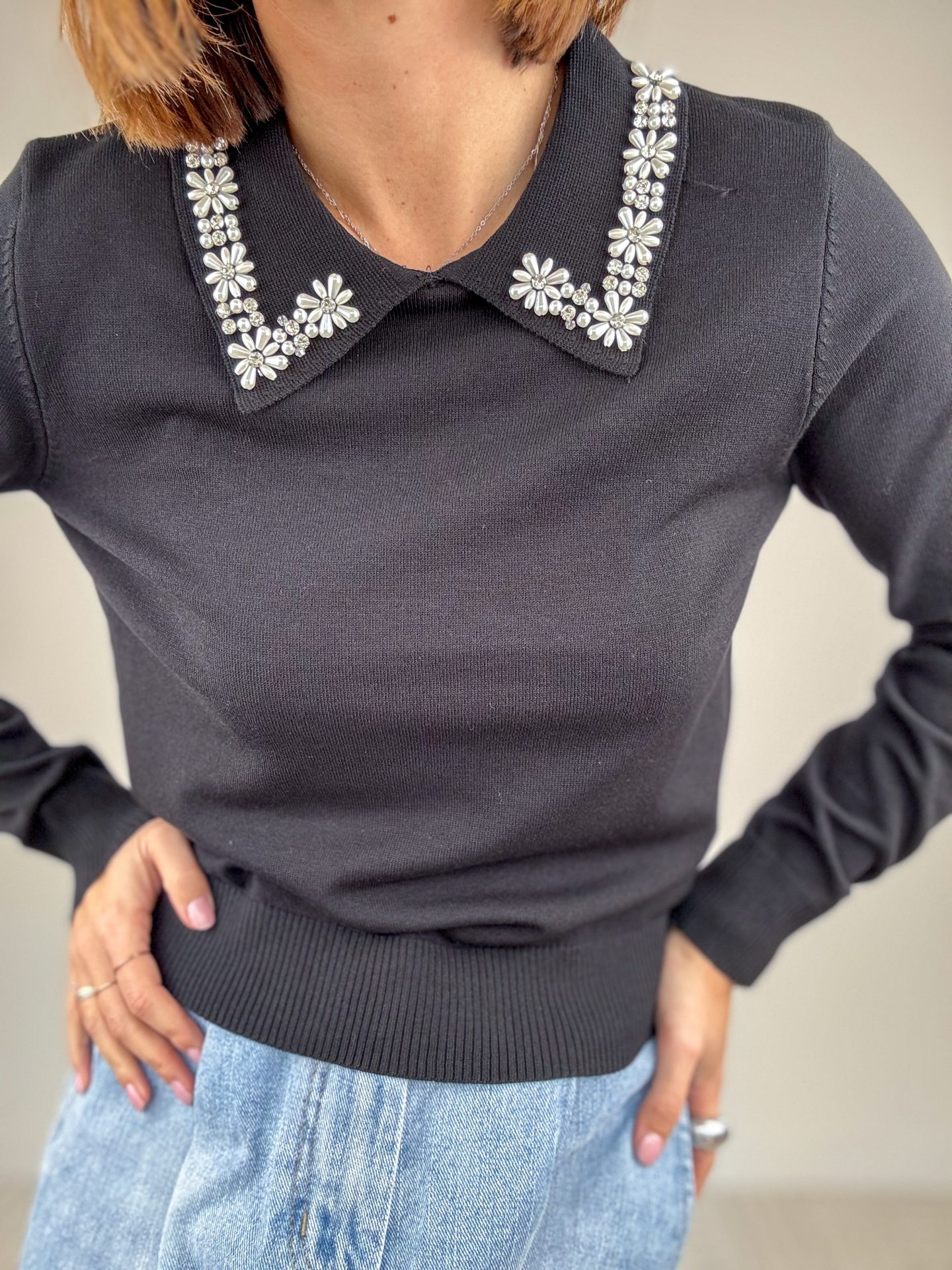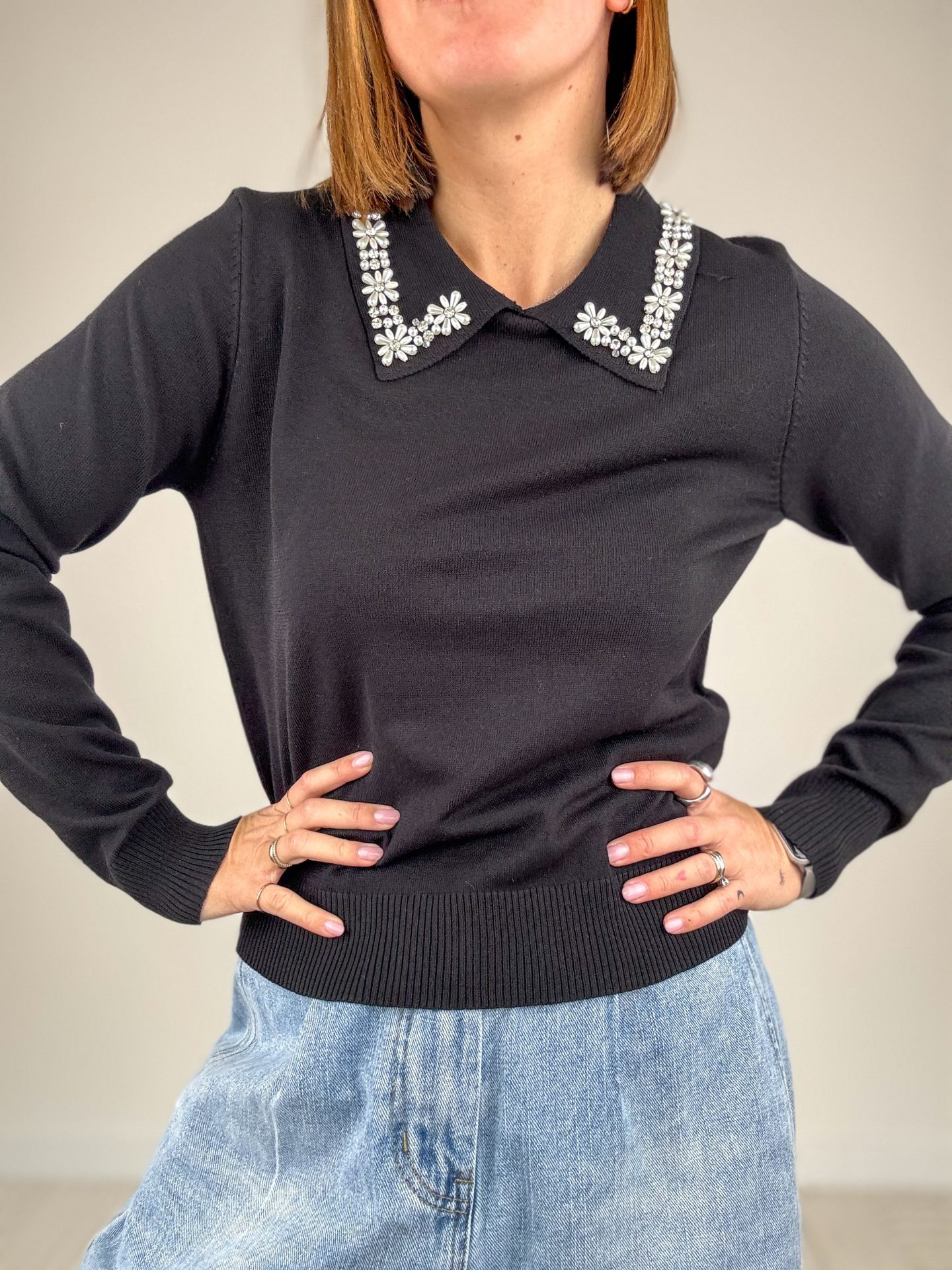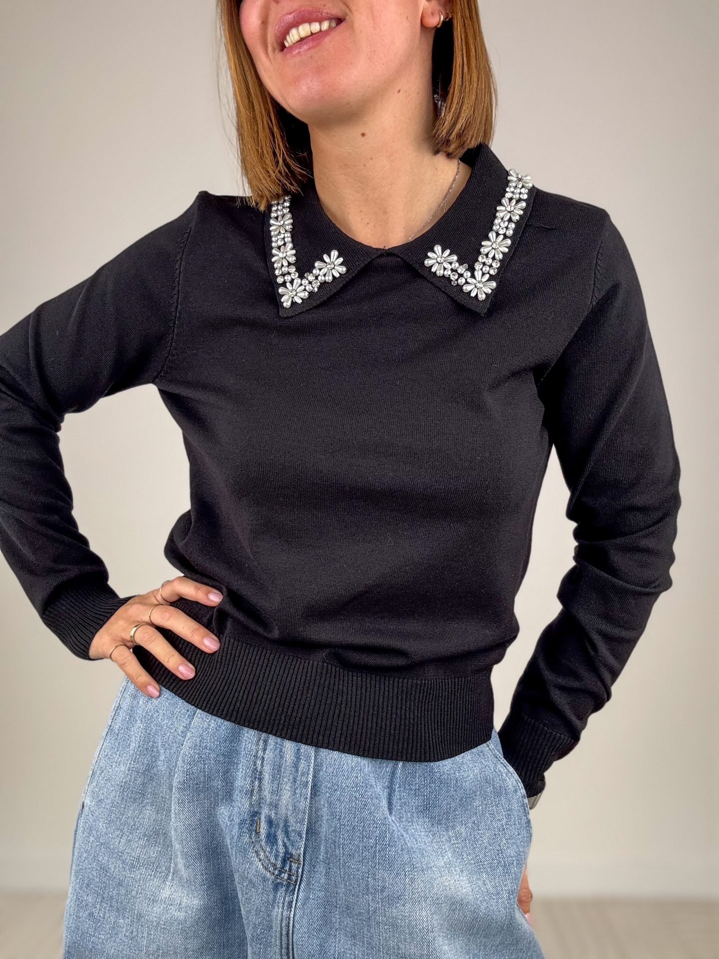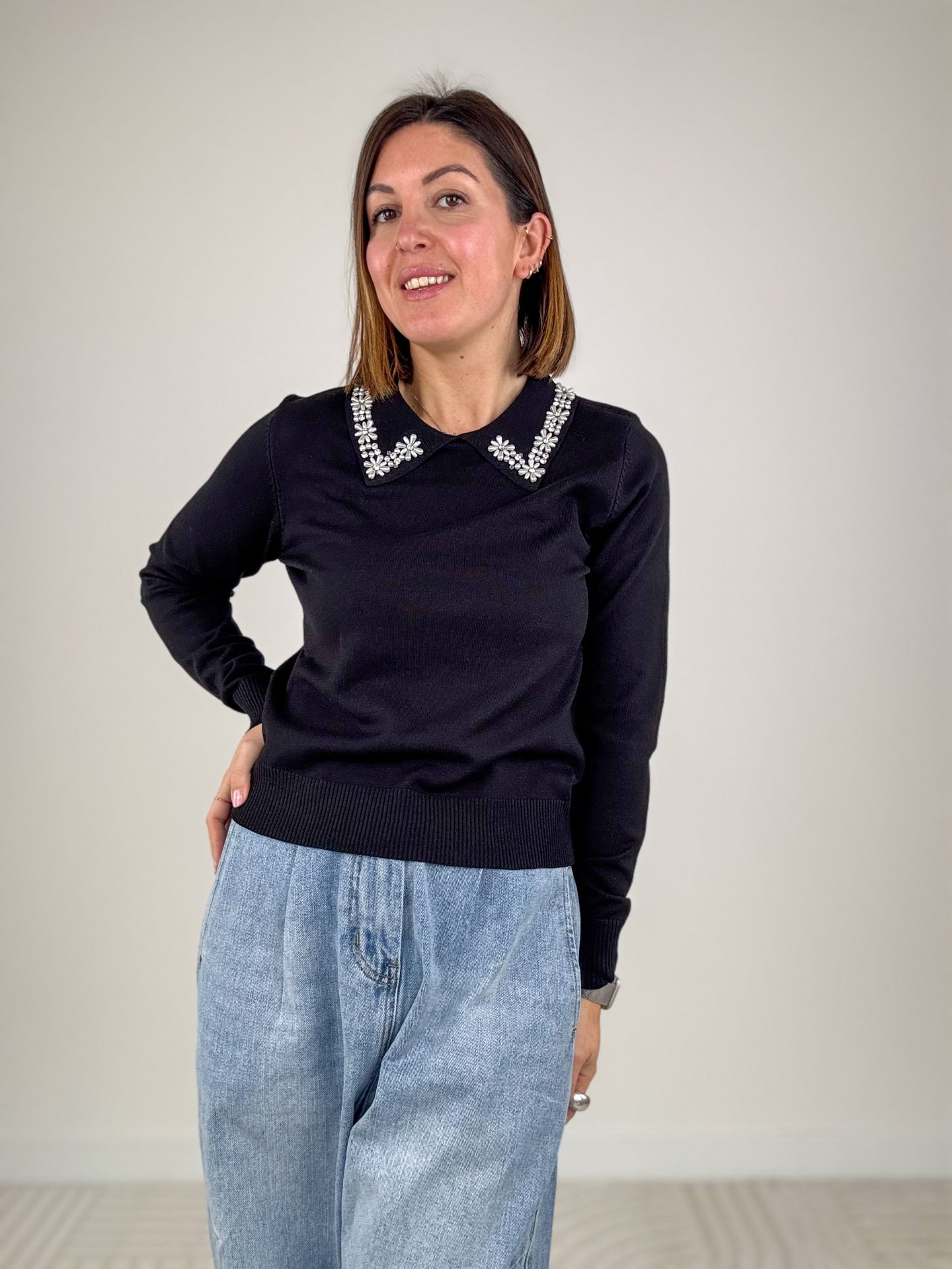 • Pull basico con scollo tondo e dettaglio colletto con perline applicate.
