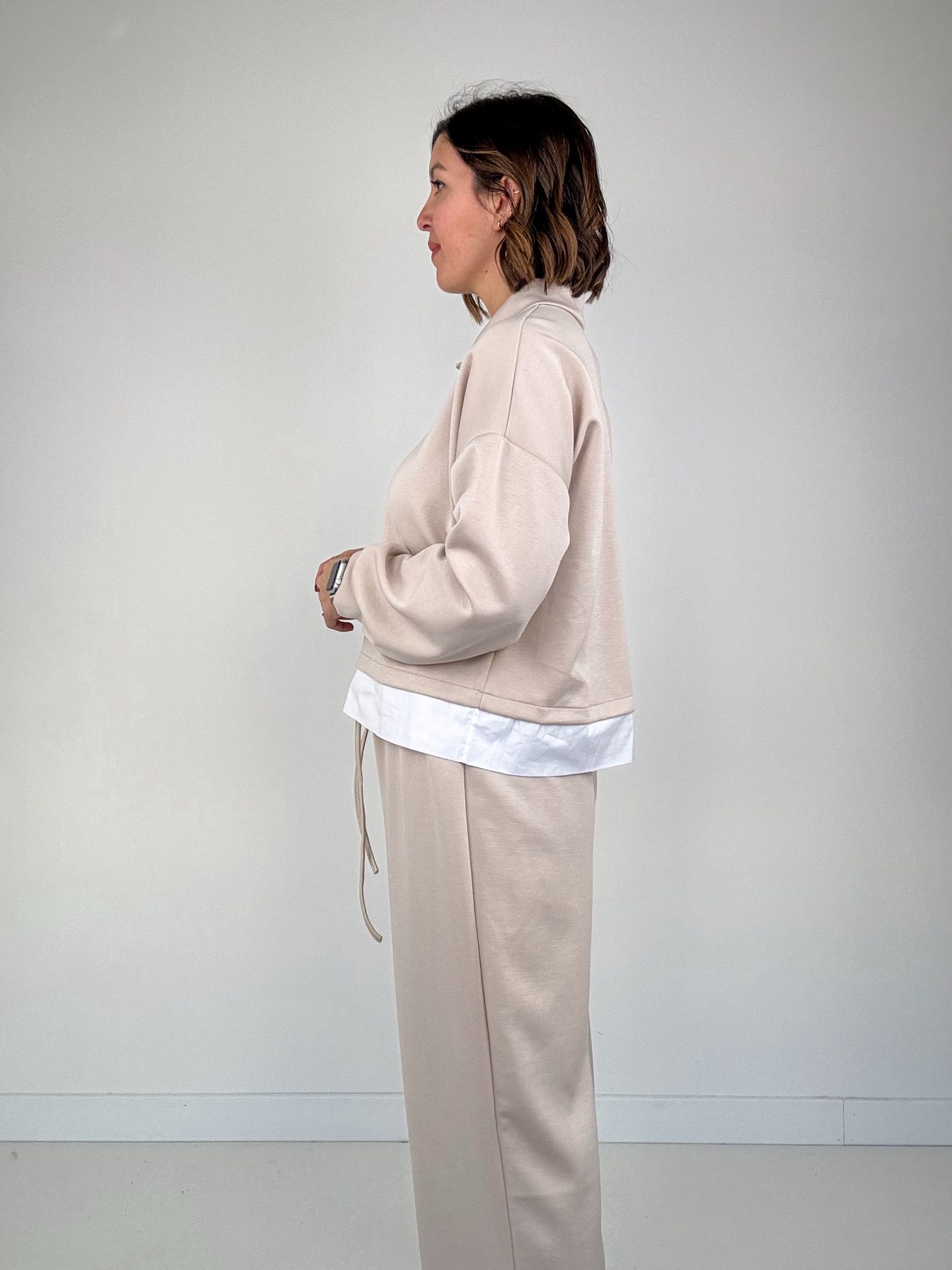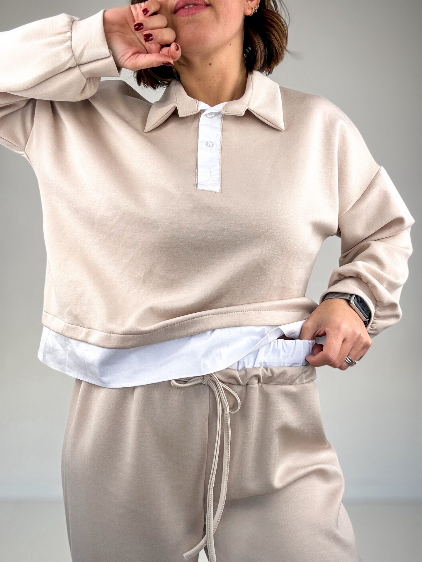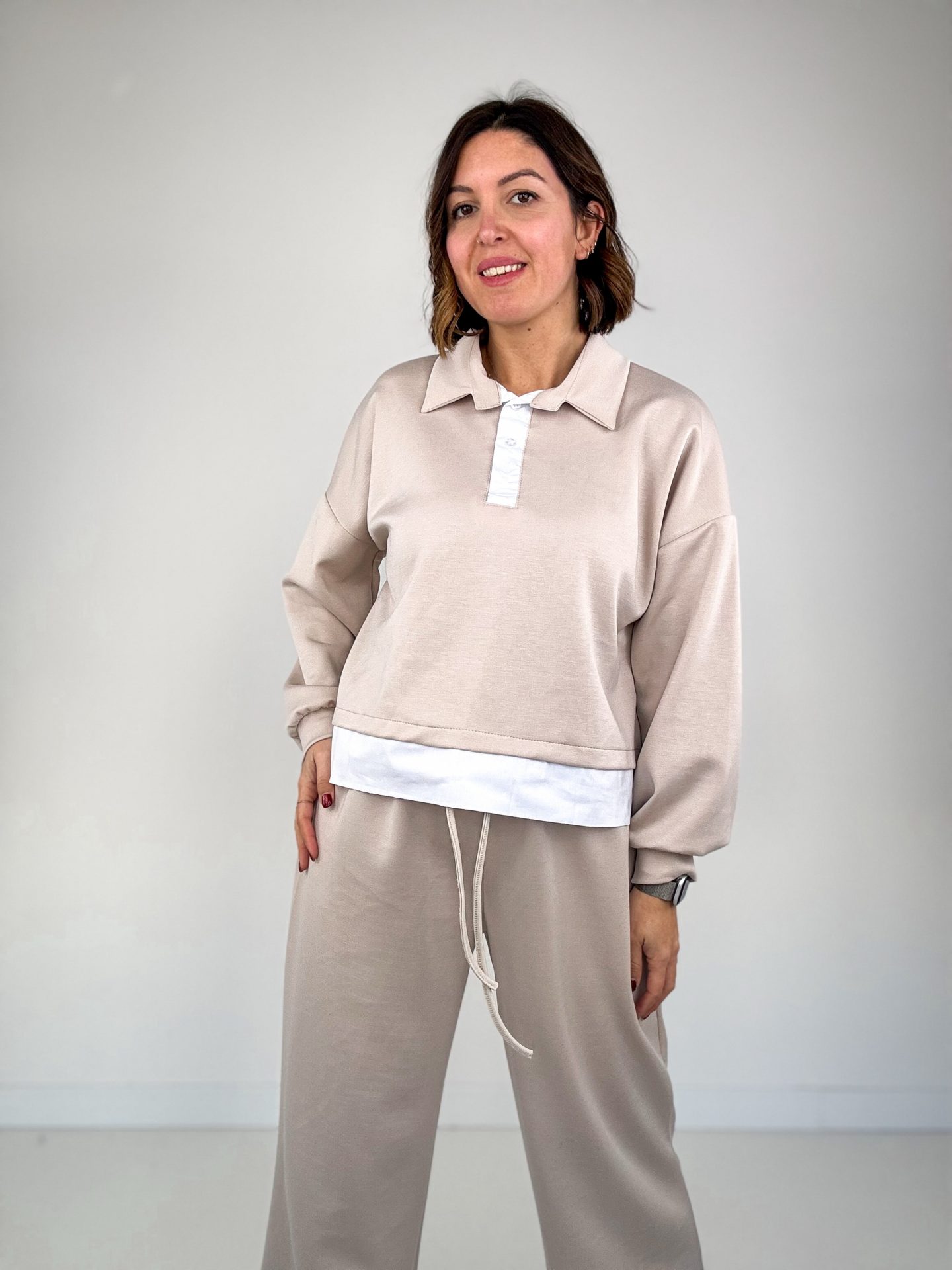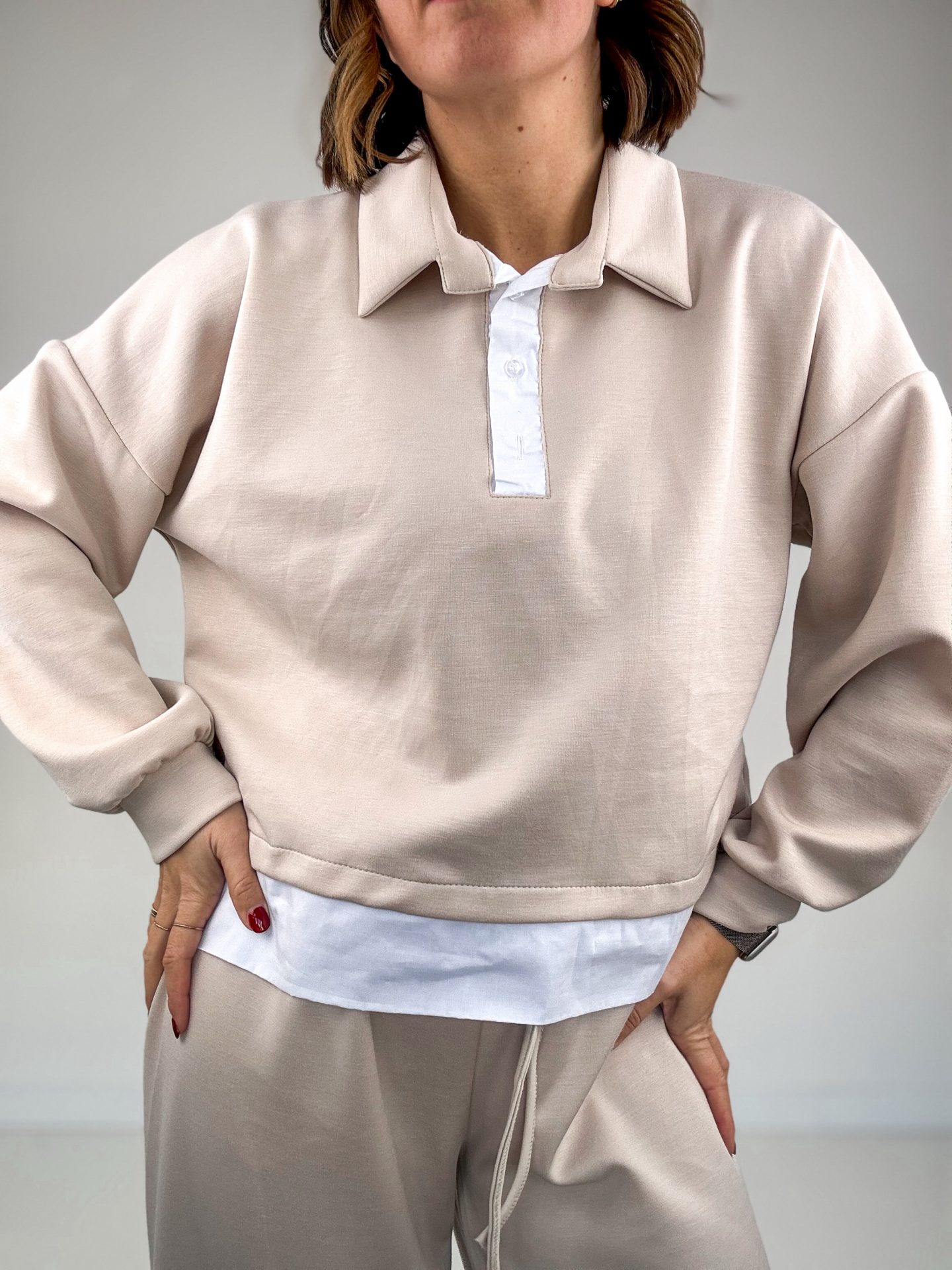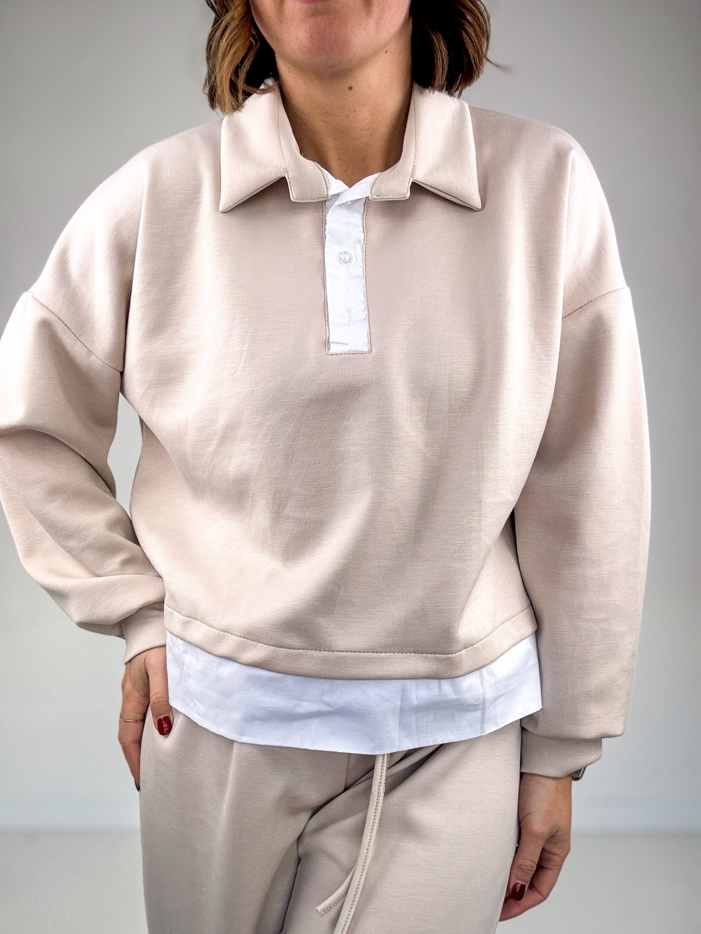 - Felpa over con bottoncini, colletto, manica lunga e finta camicia sul finale.