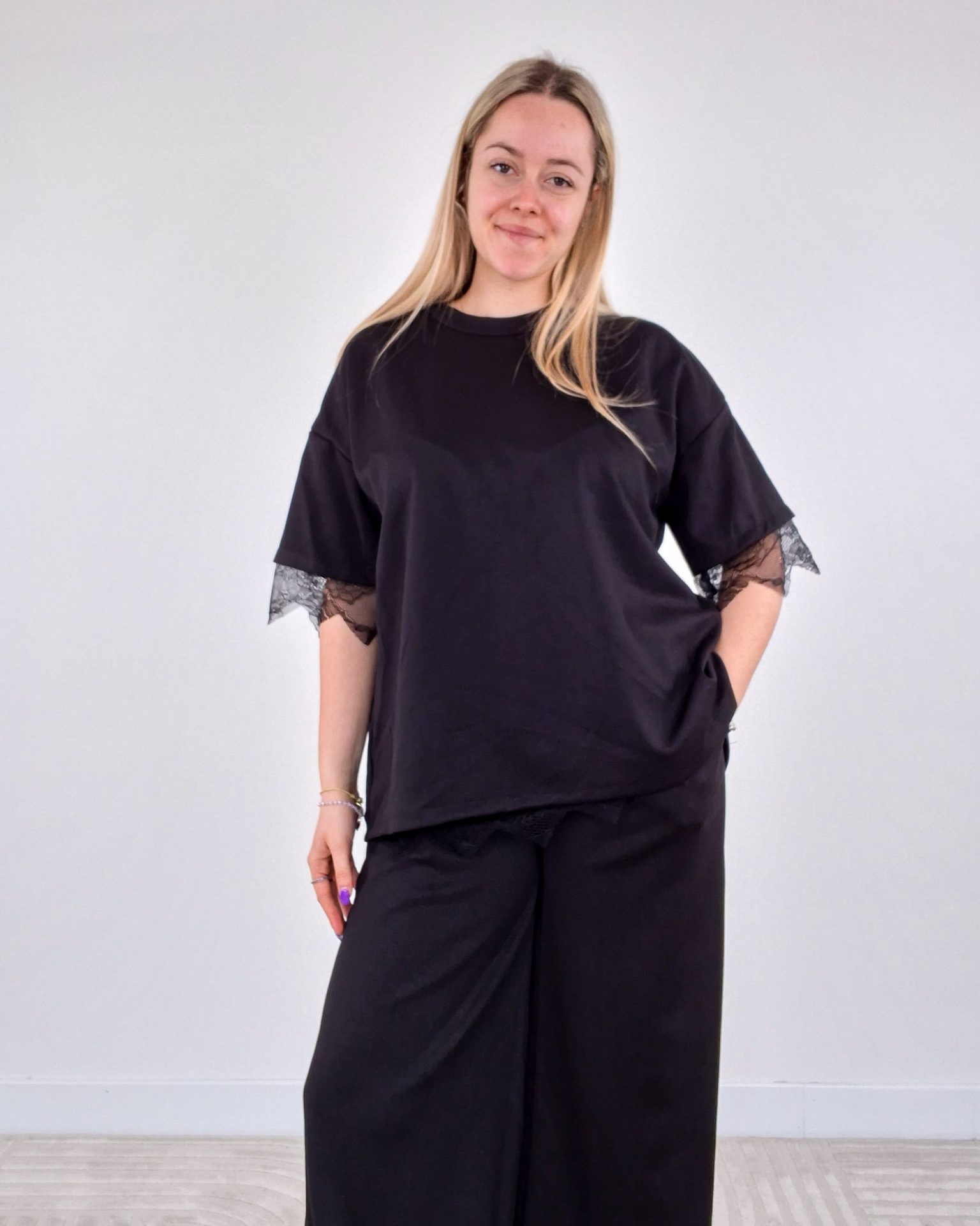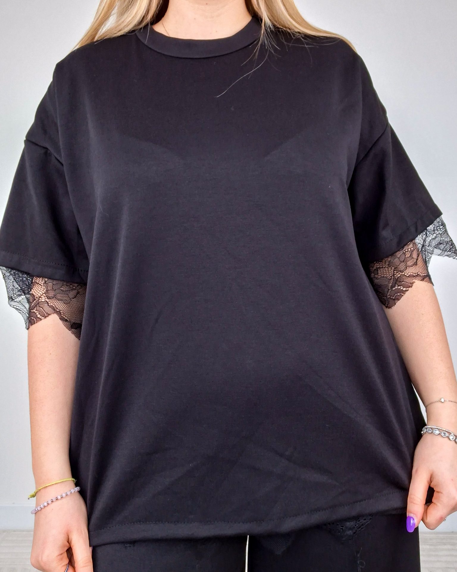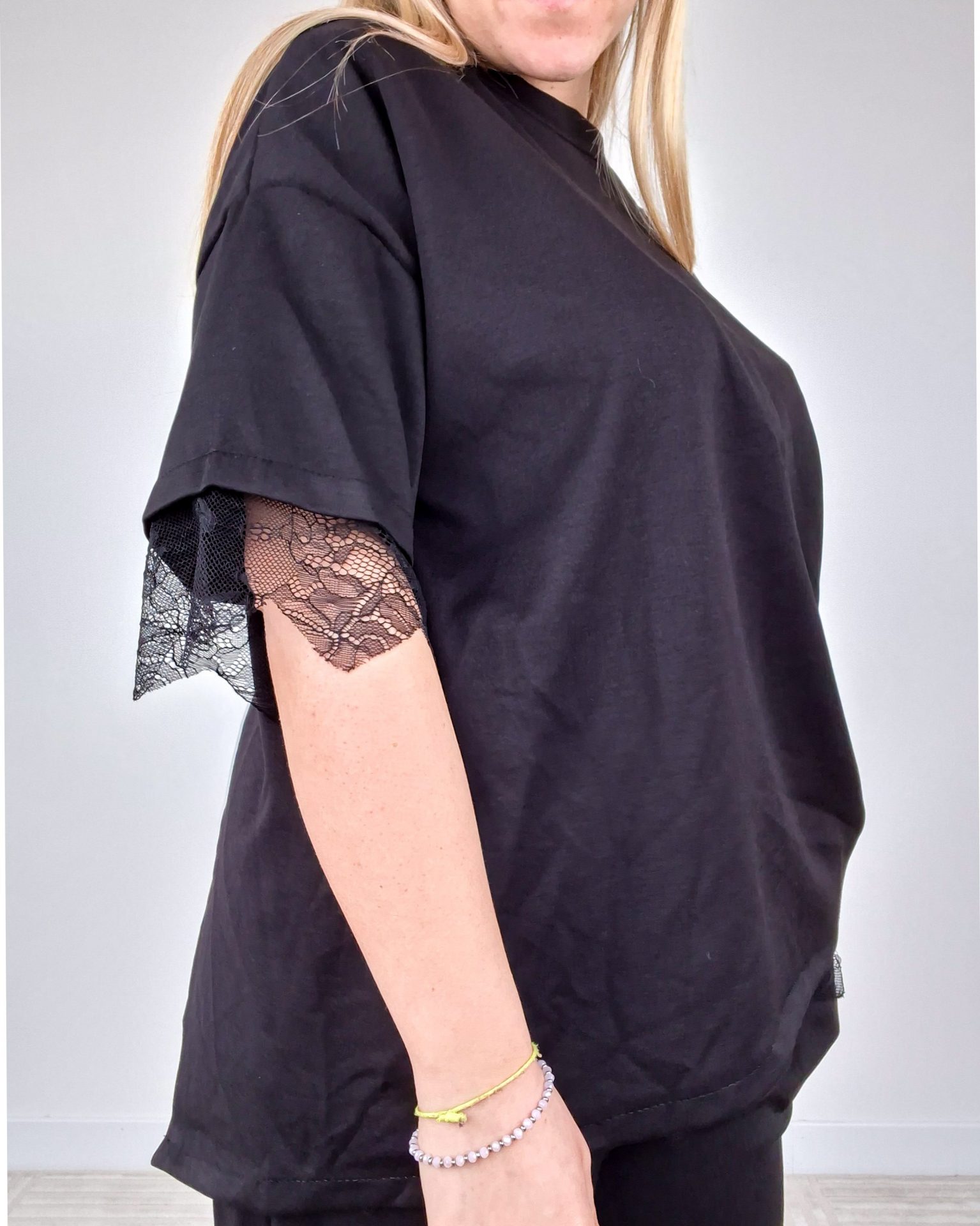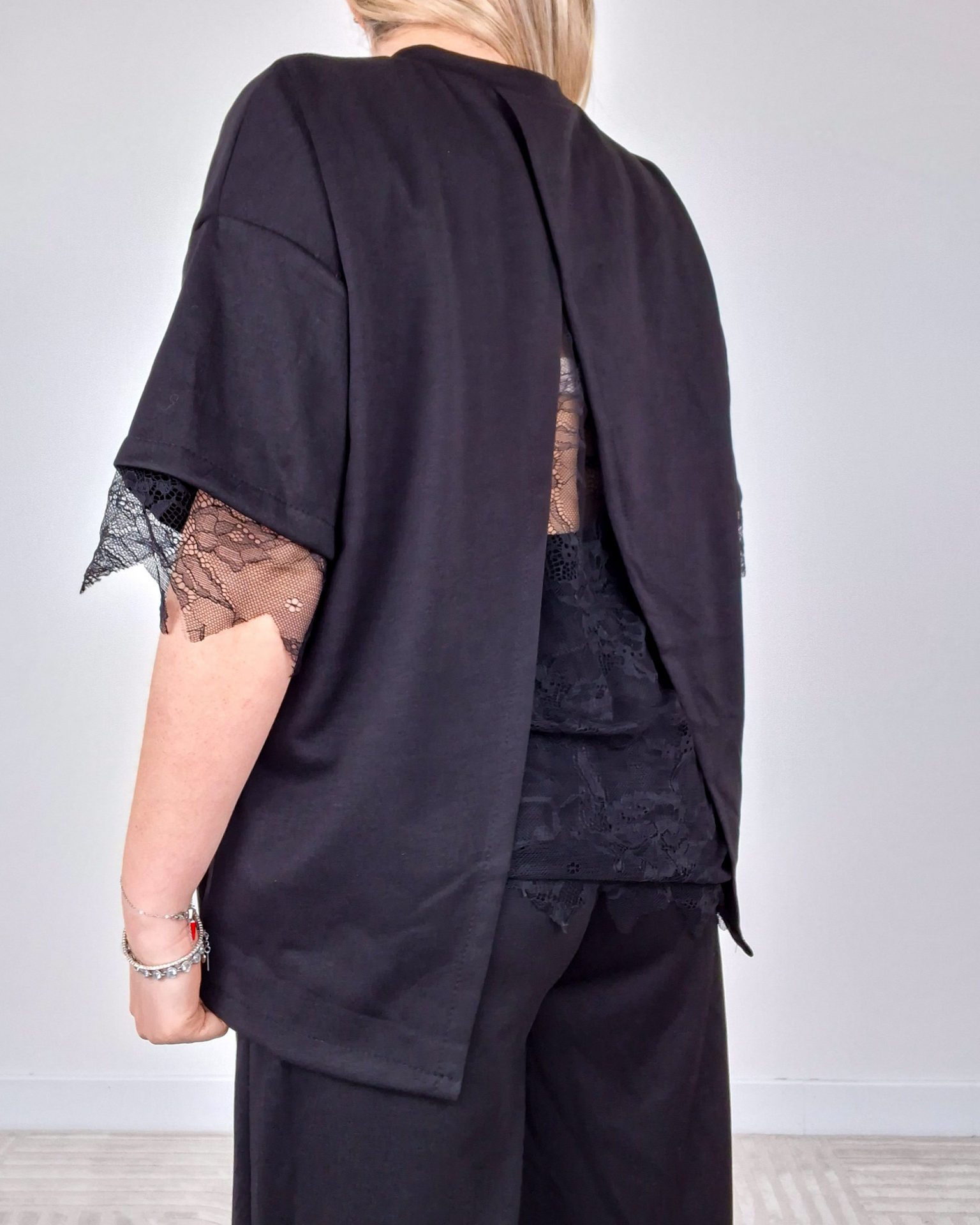 - T-shirt con dettaglio pizzo sulle maniche e spacco sul retro con pizzo.