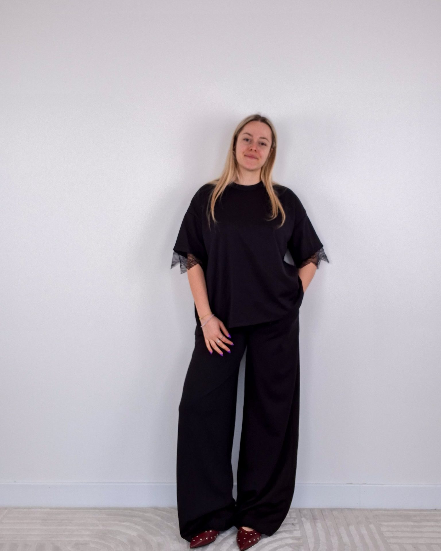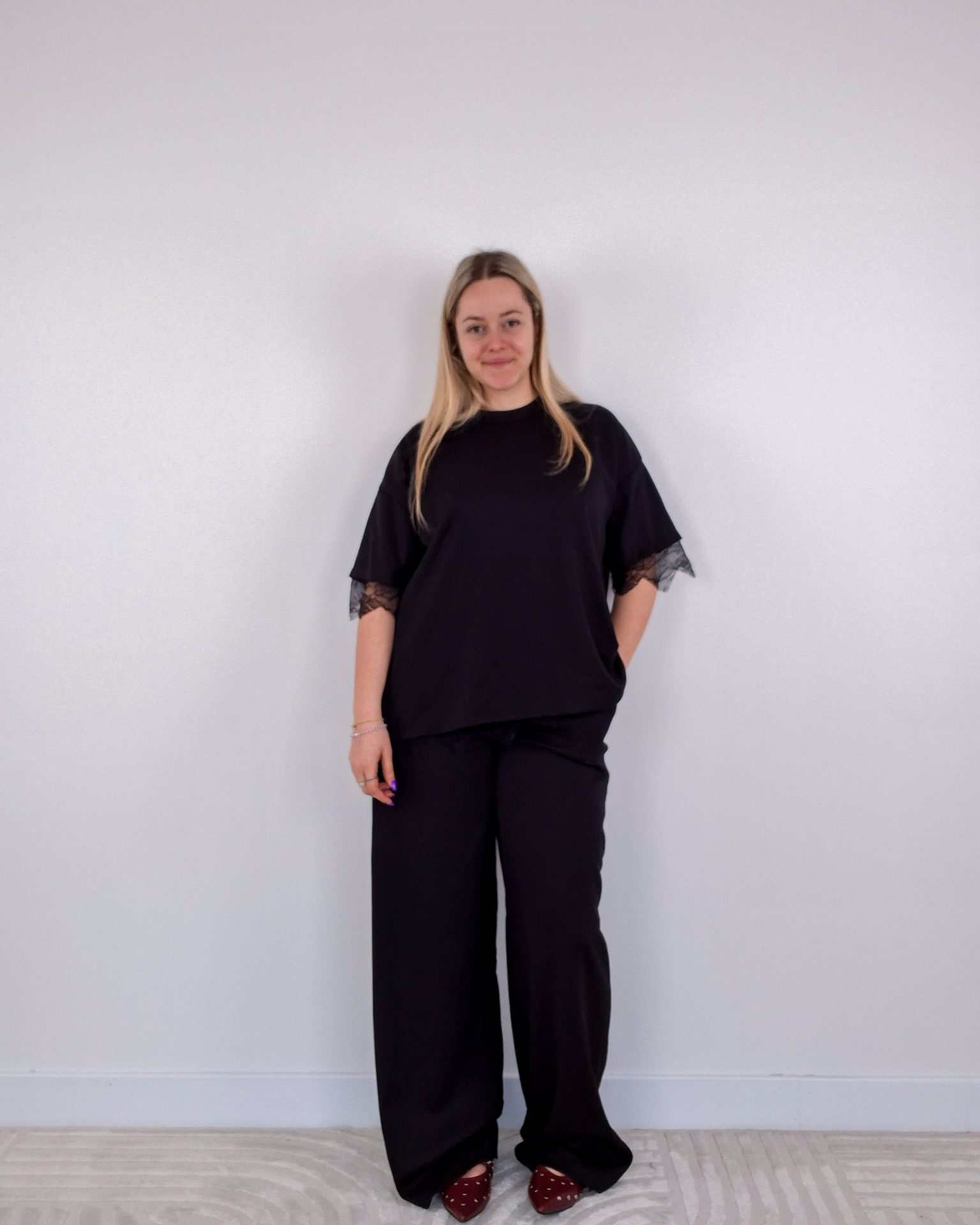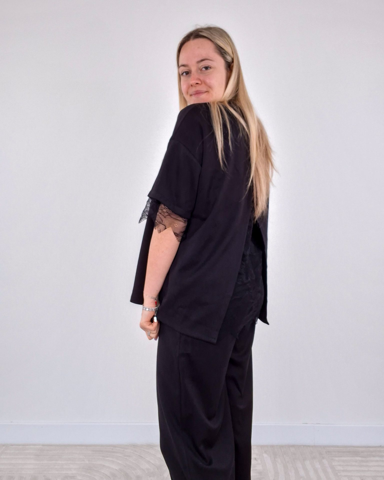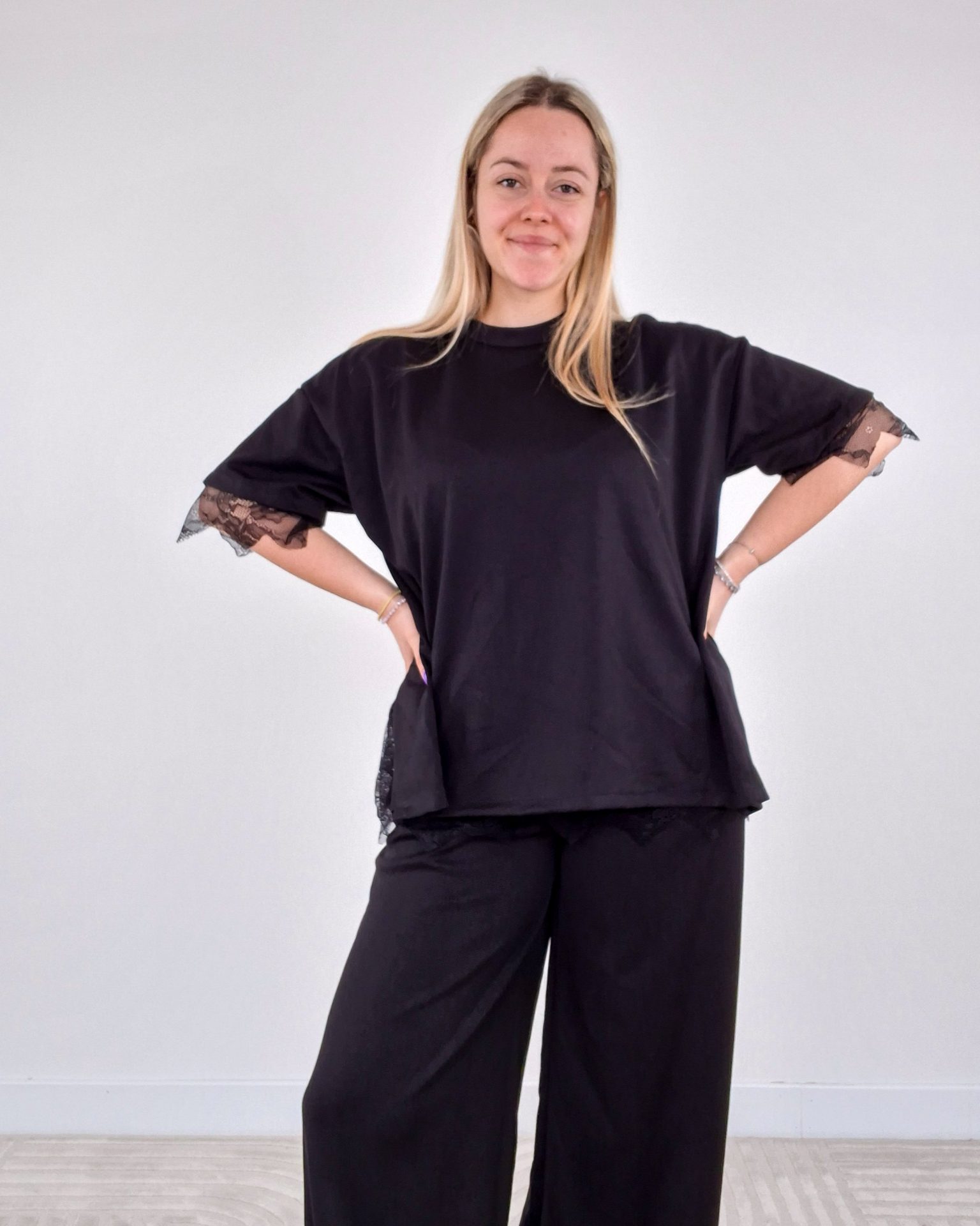 - T-shirt con dettaglio pizzo sulle maniche e spacco sul retro con pizzo.