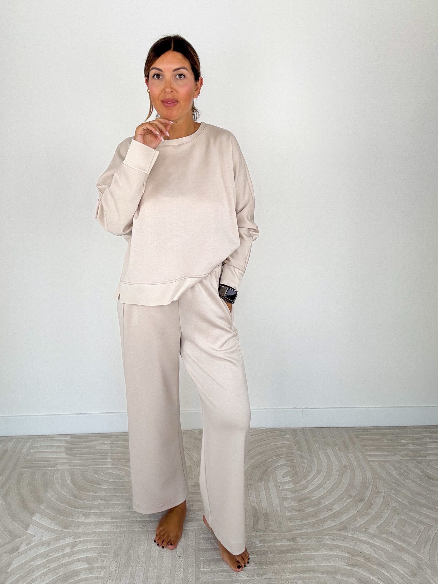 - Pantalone dritto con elastico in vita e tasche frontali.