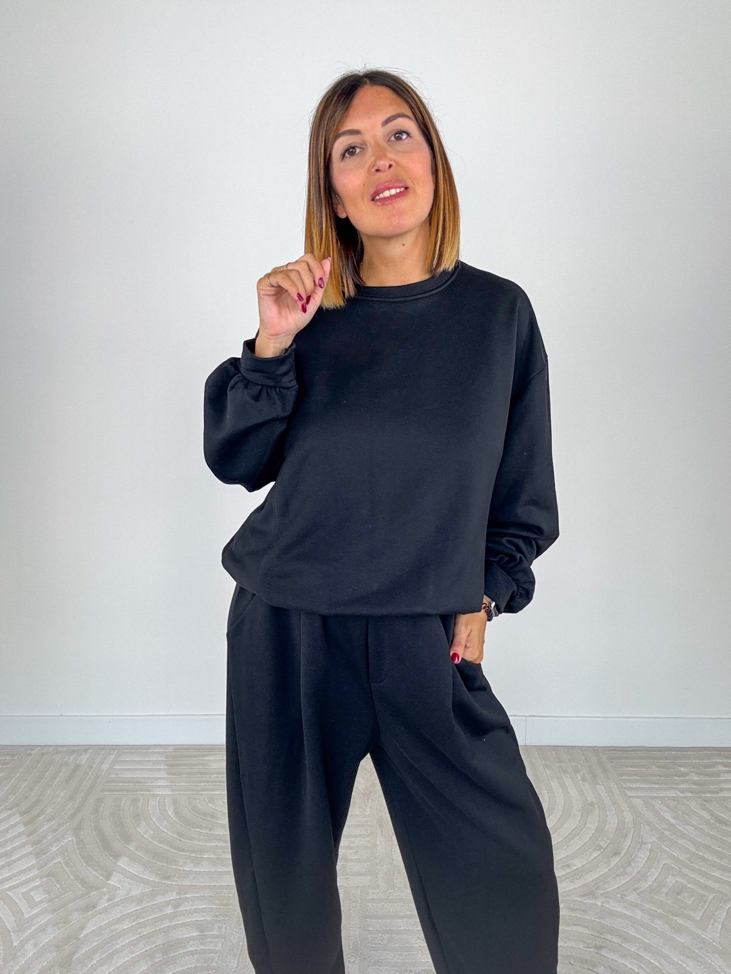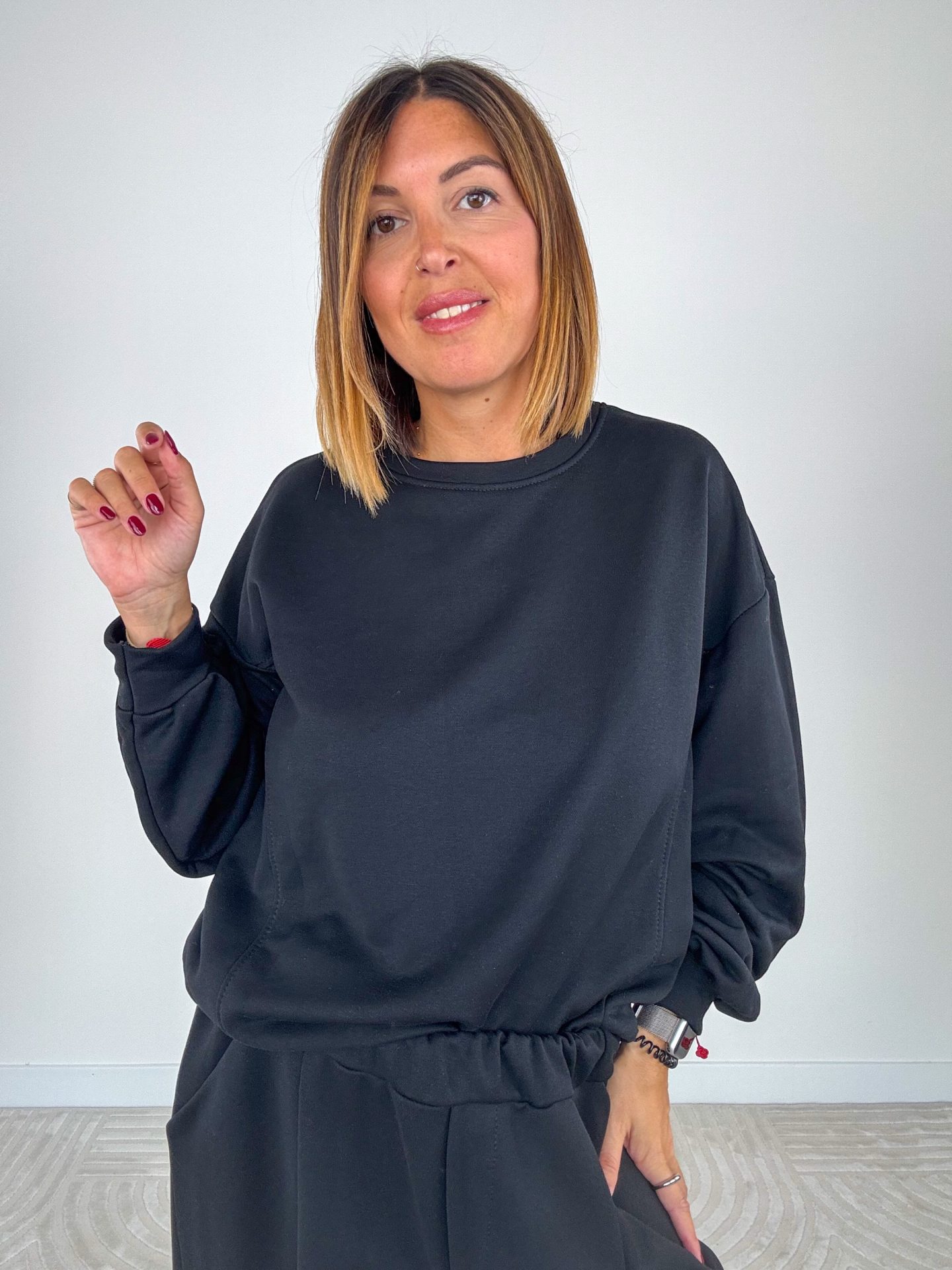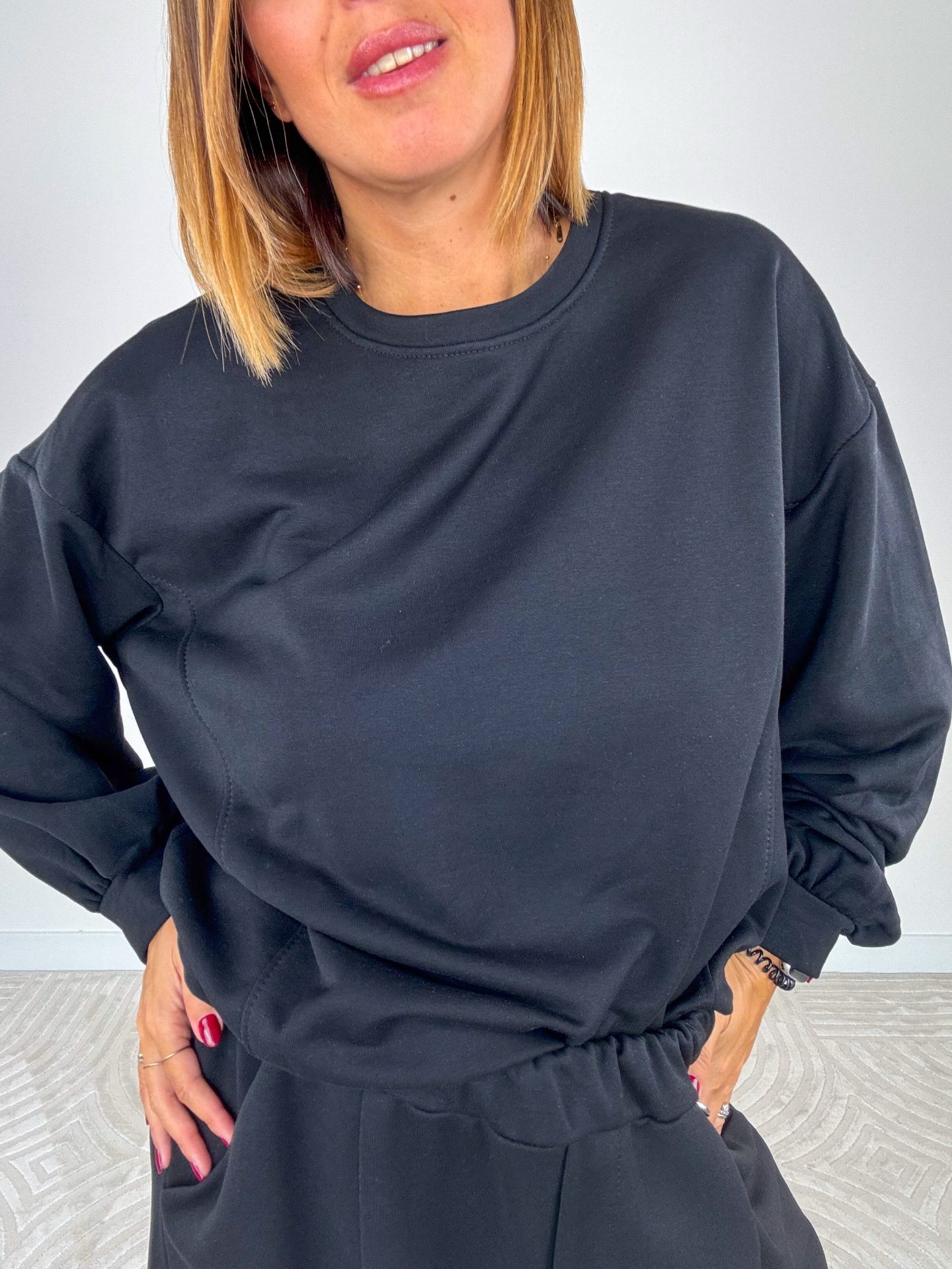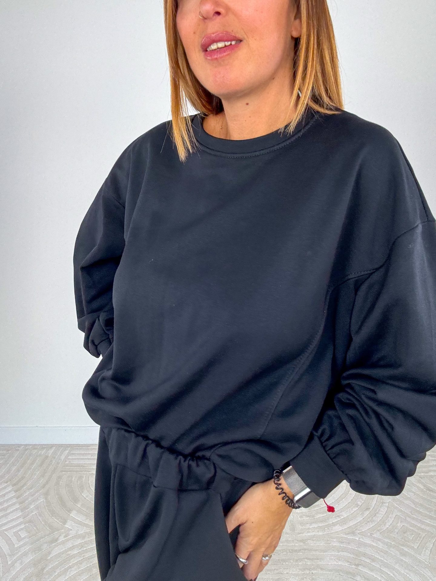 - Felpa scollo tondo, con cannolè su polsi e vita.