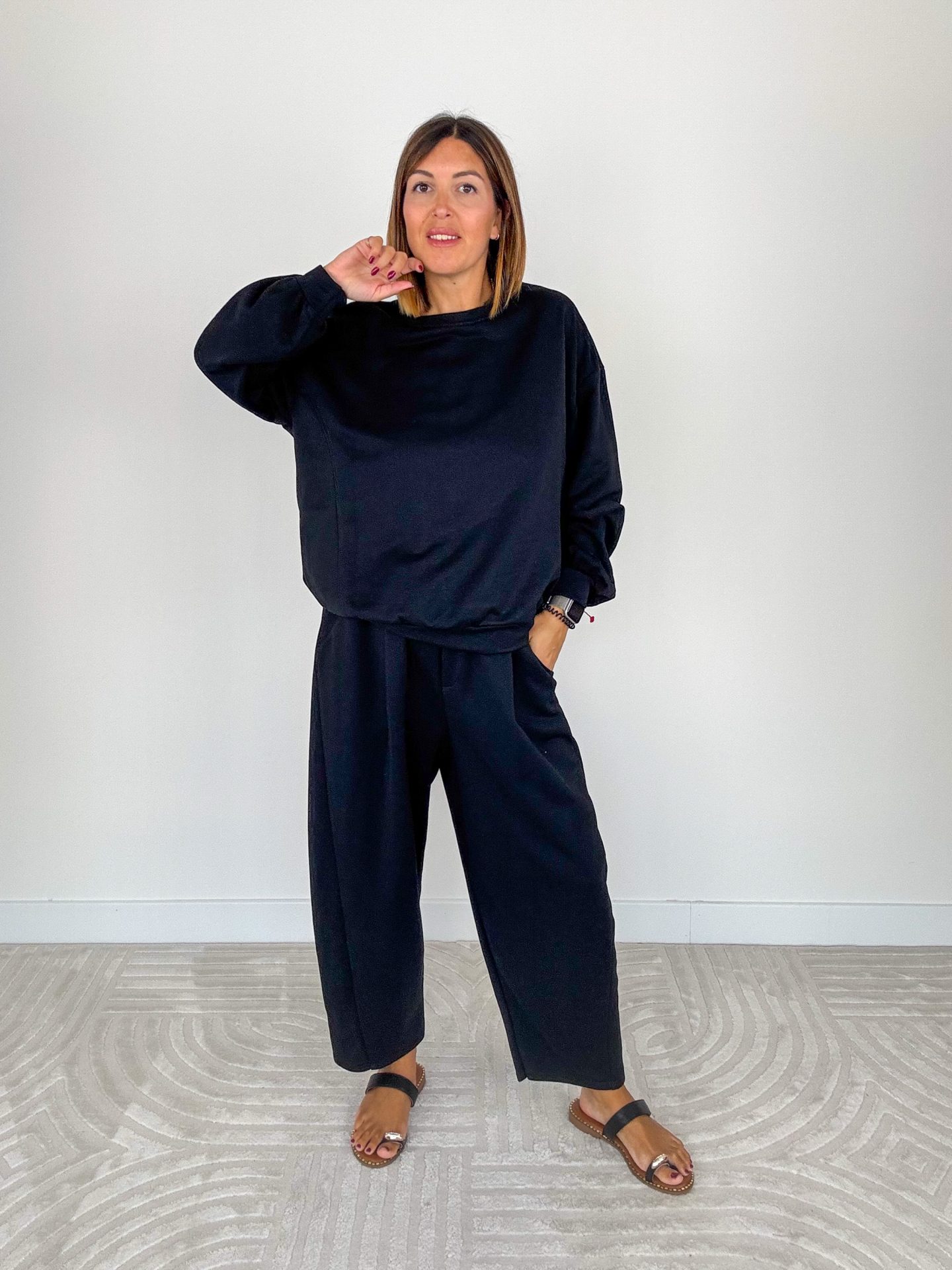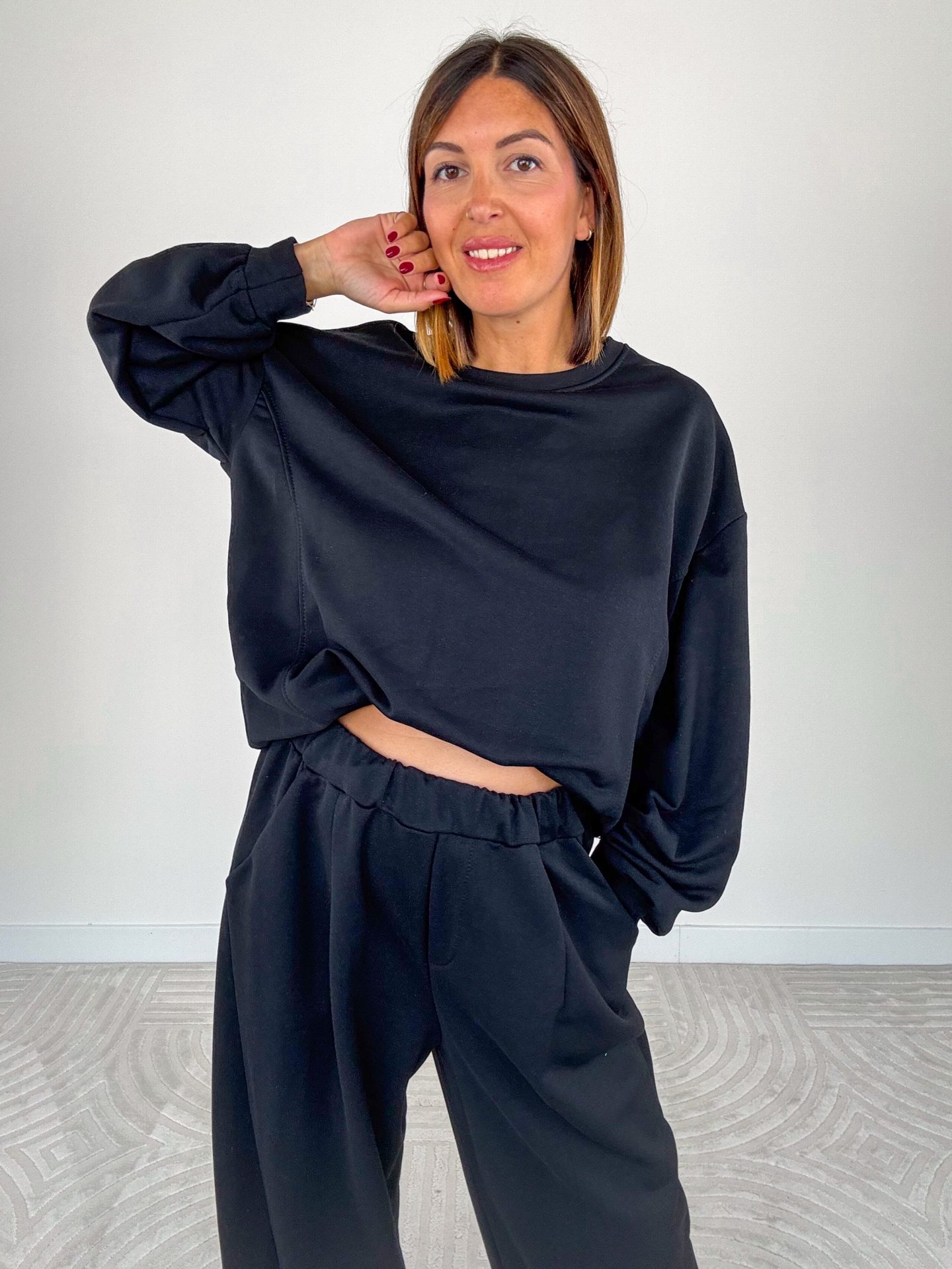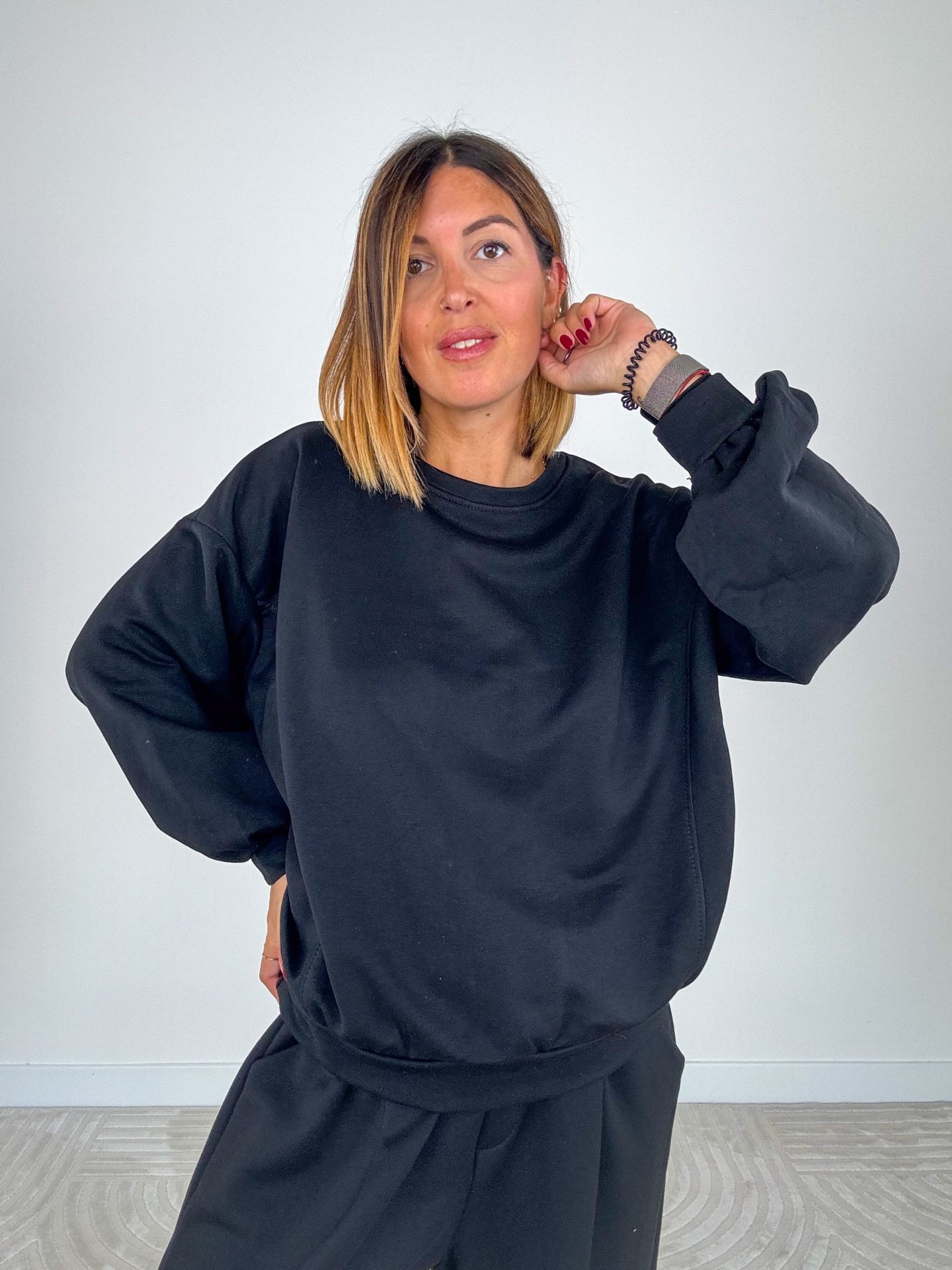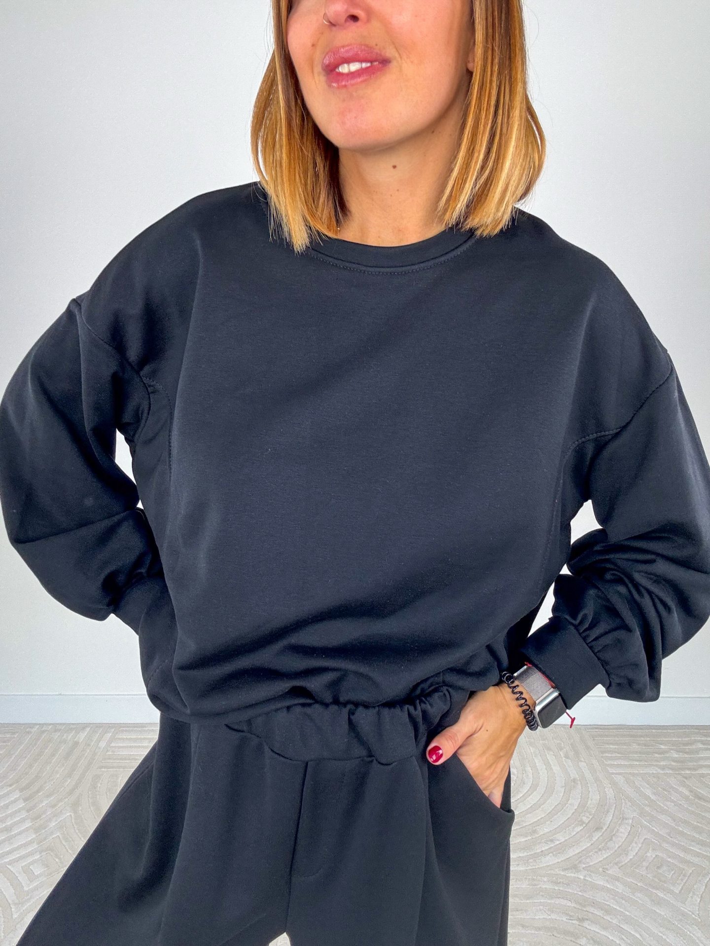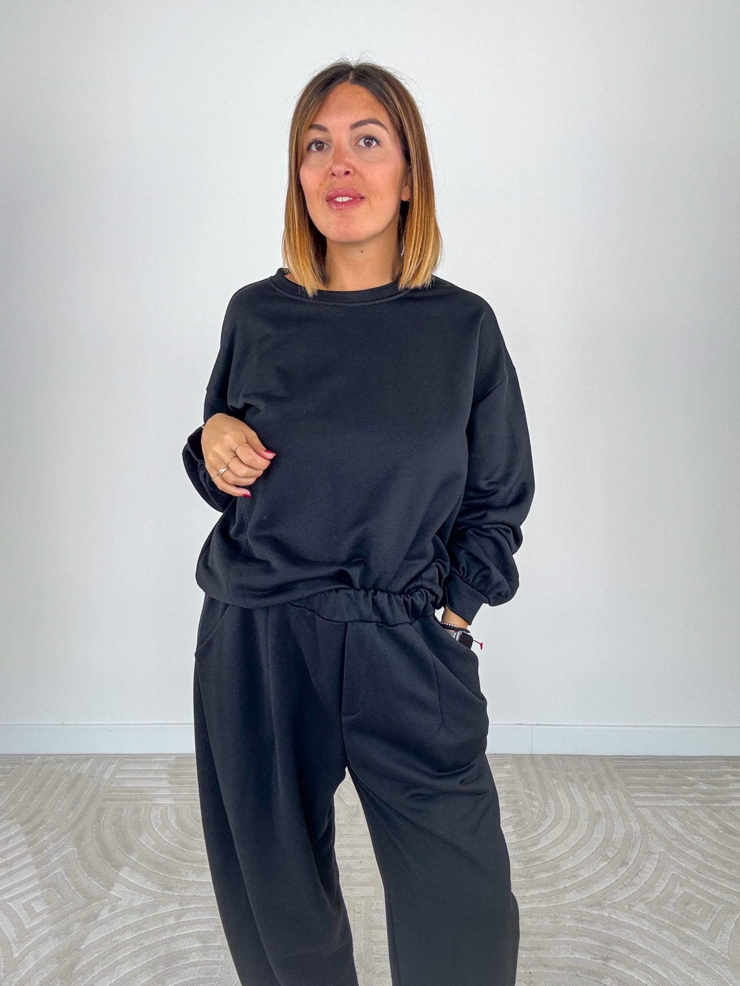 - Felpa scollo tondo, con cannolè su polsi e vita.