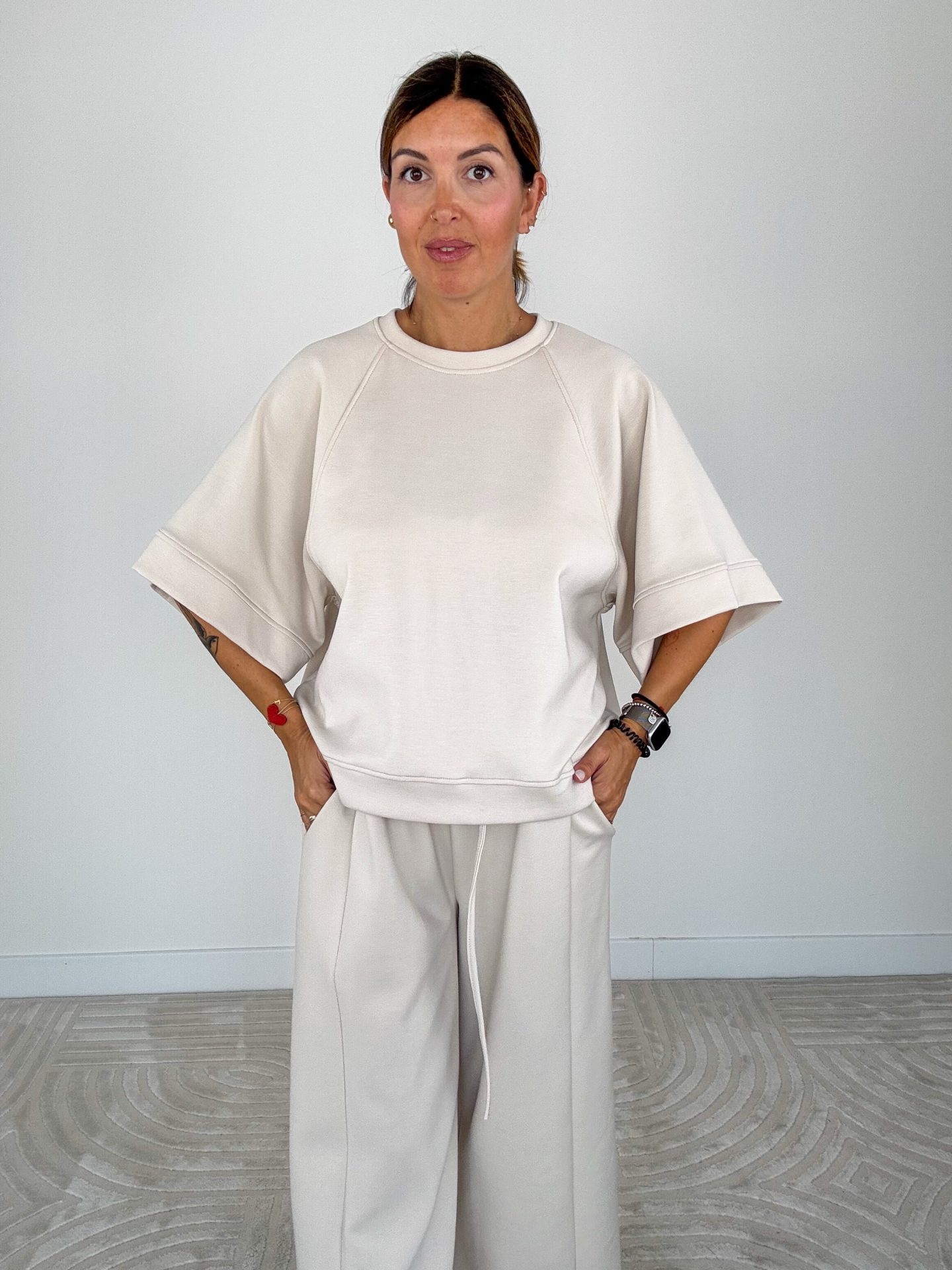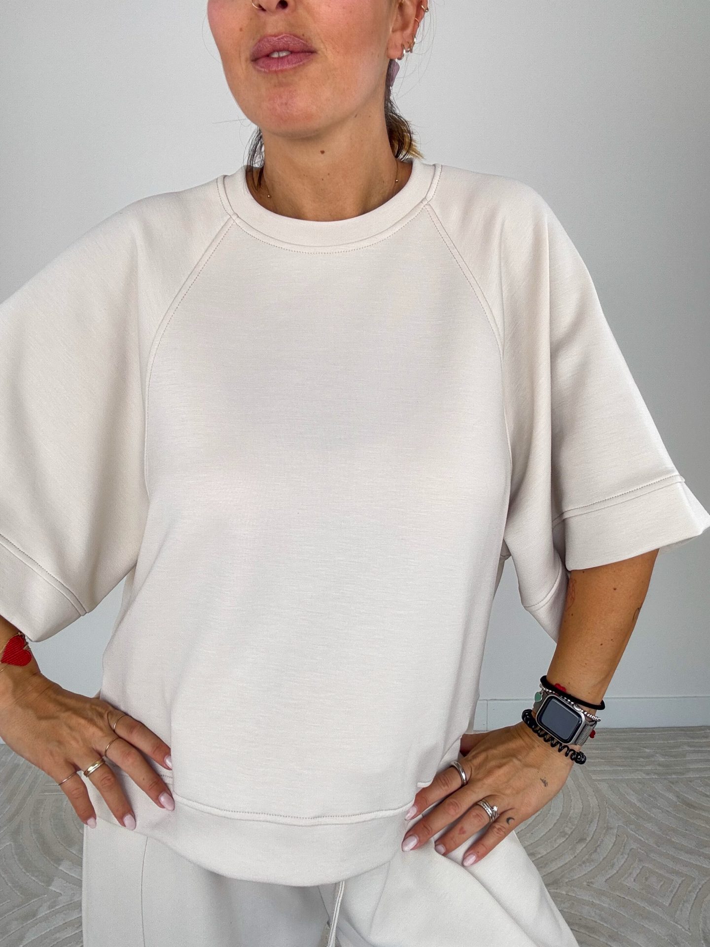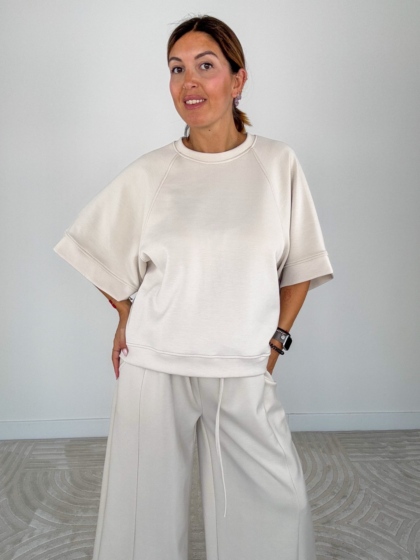 - Felpa scollo tondo, modello scatoletta e manica corta ampia.