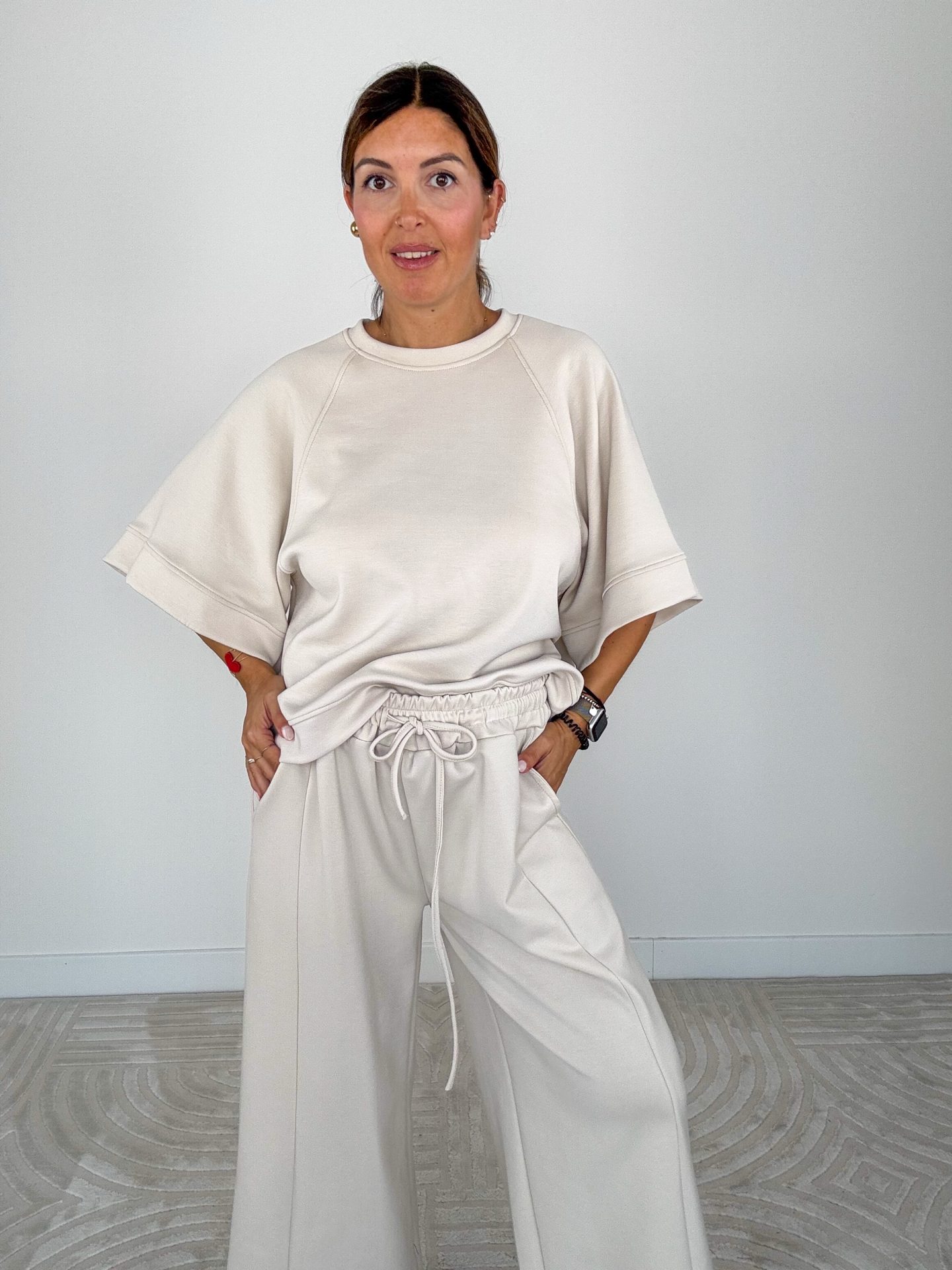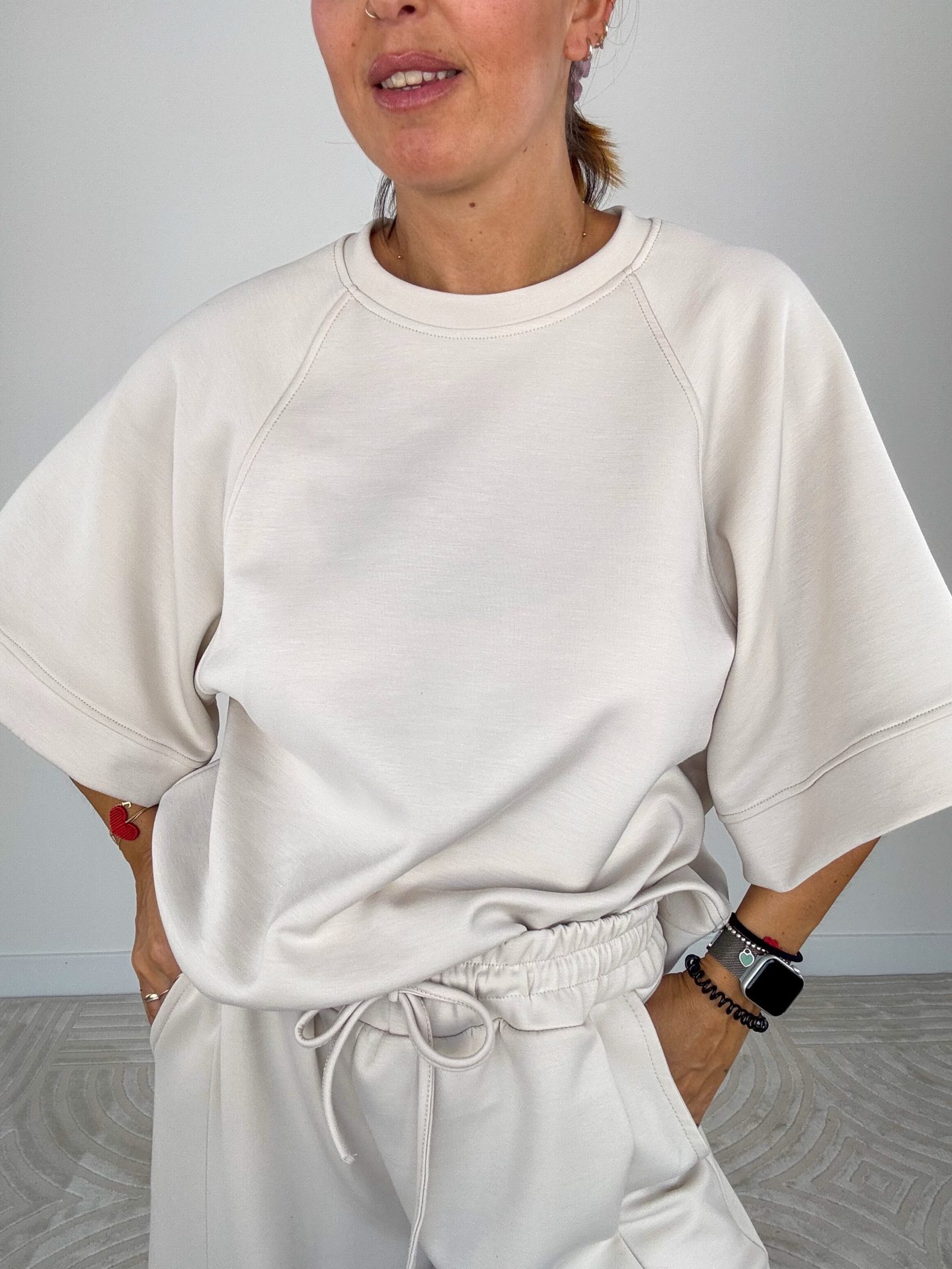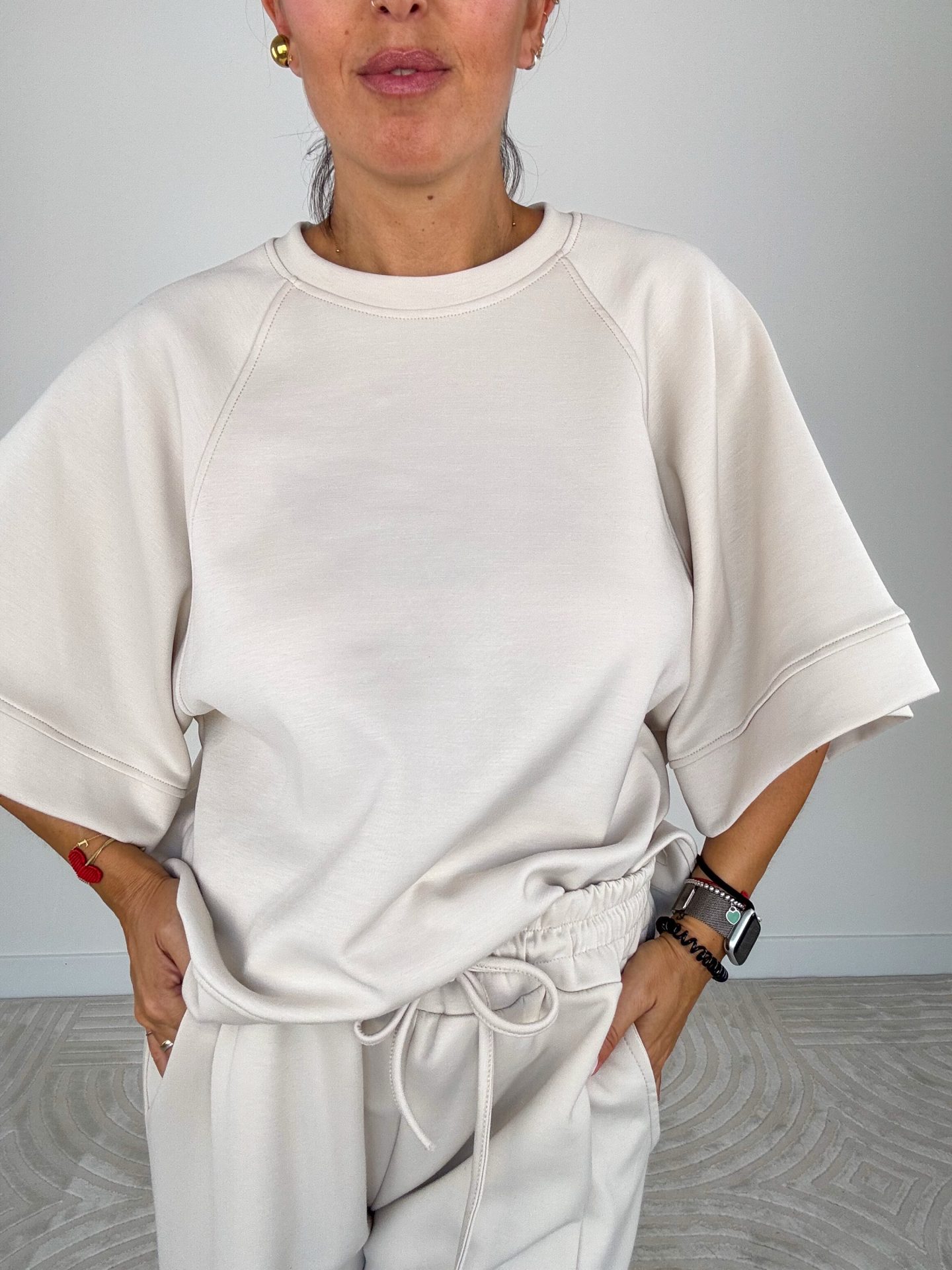 - Felpa scollo tondo, modello scatoletta e manica corta ampia.