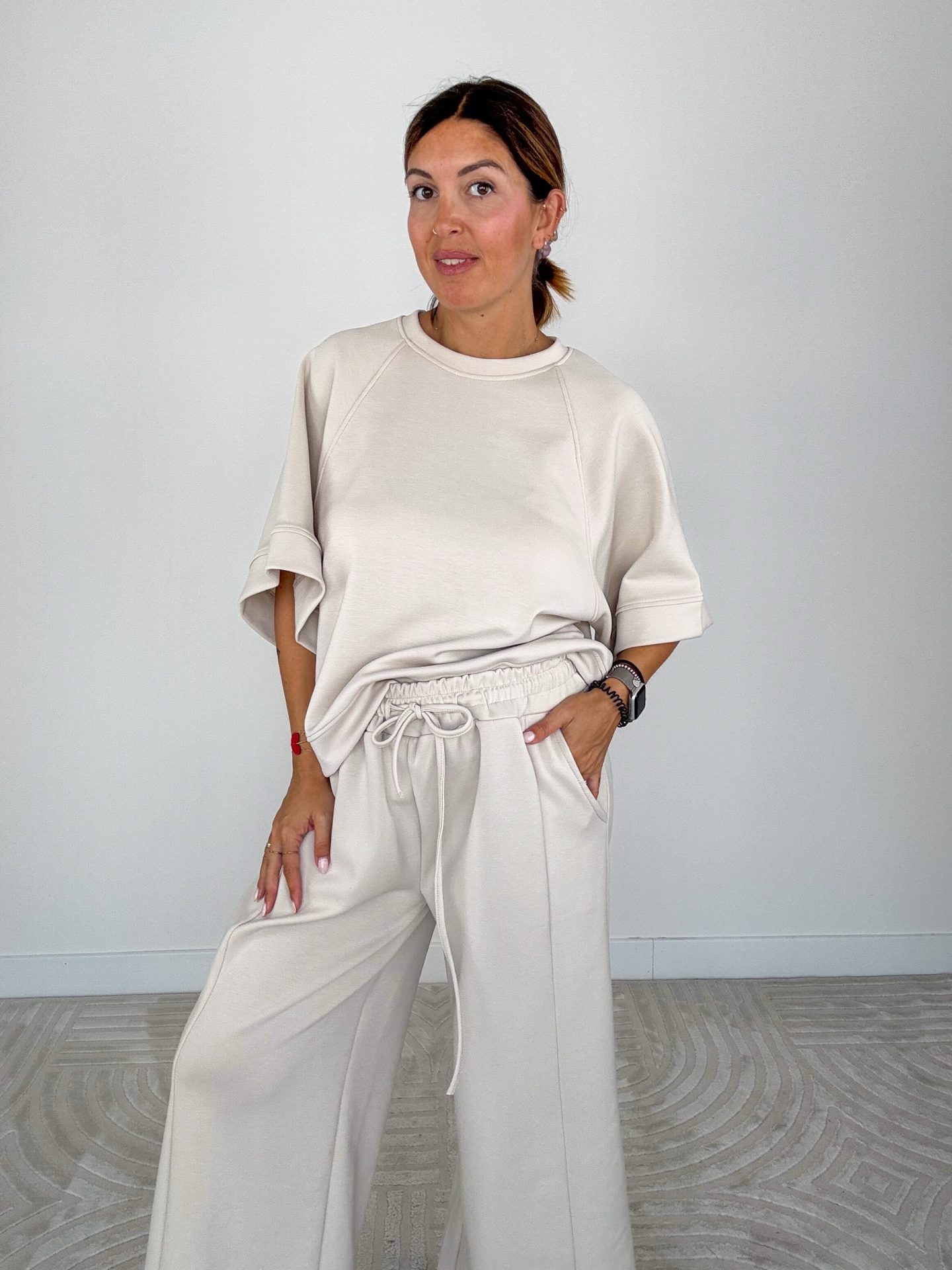 - Pantalone ovetto con elastico in vita e coulisse in vita, tasche frontali.