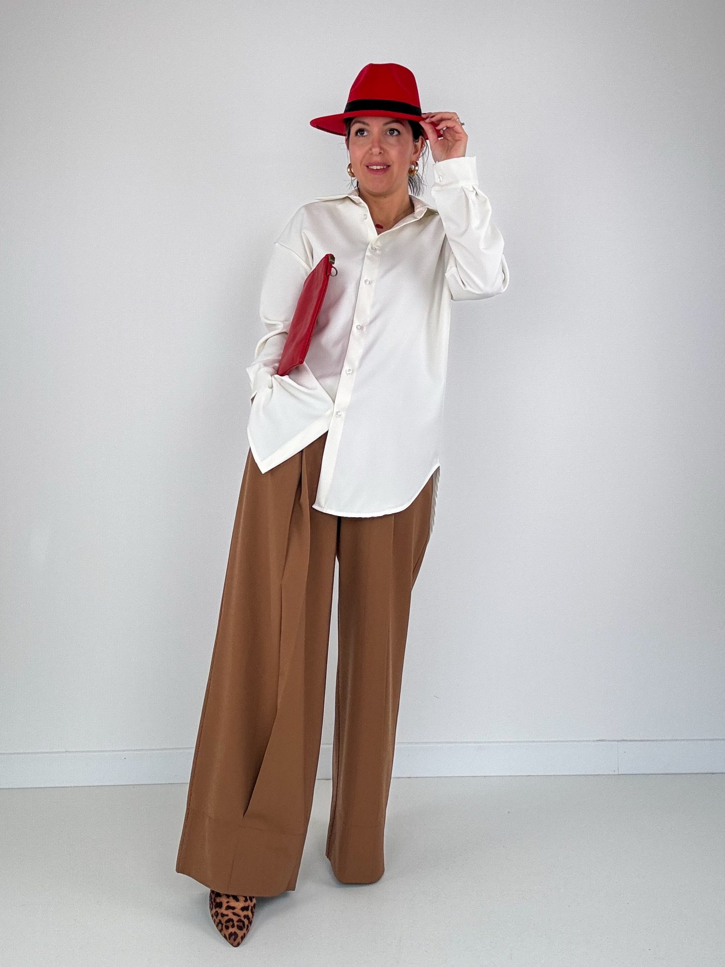 Concludiamo poi il look con il Tronchetto Chic e la Pochette Vera Pelle in rosso, due pezzi audaci che sdrammatizzano un pò questo look e lo rendono stiloso.