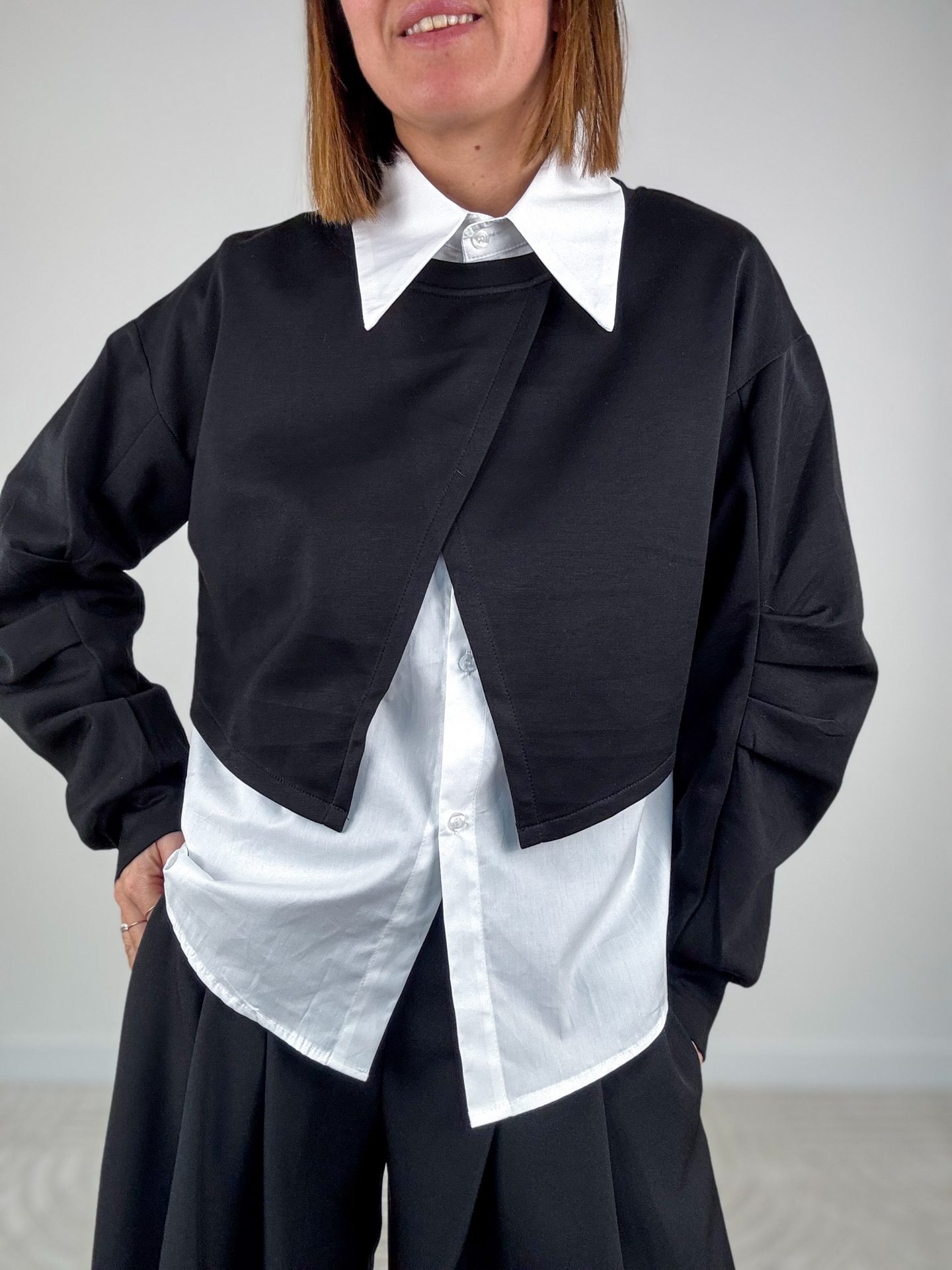 • T-Shirt crop con incrocio a manica lunga arricciata.